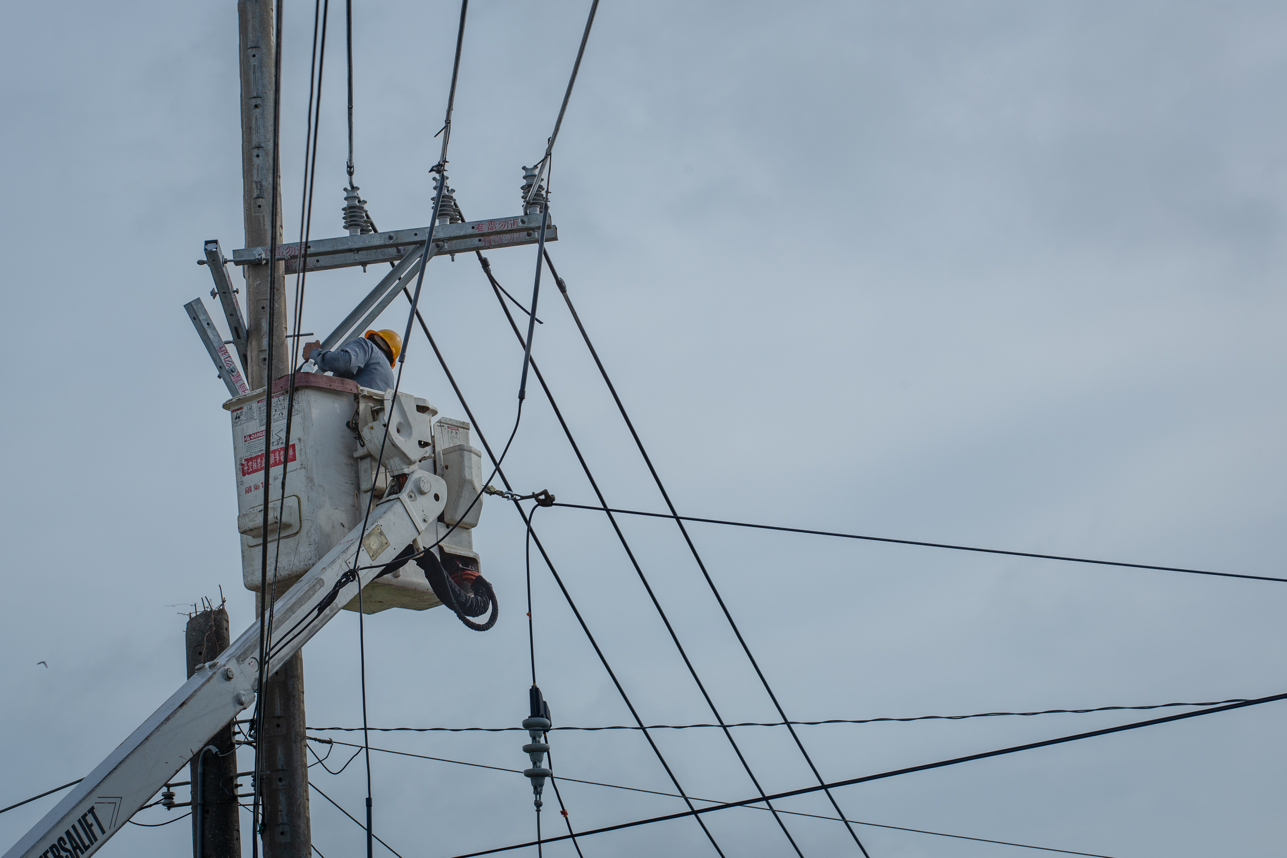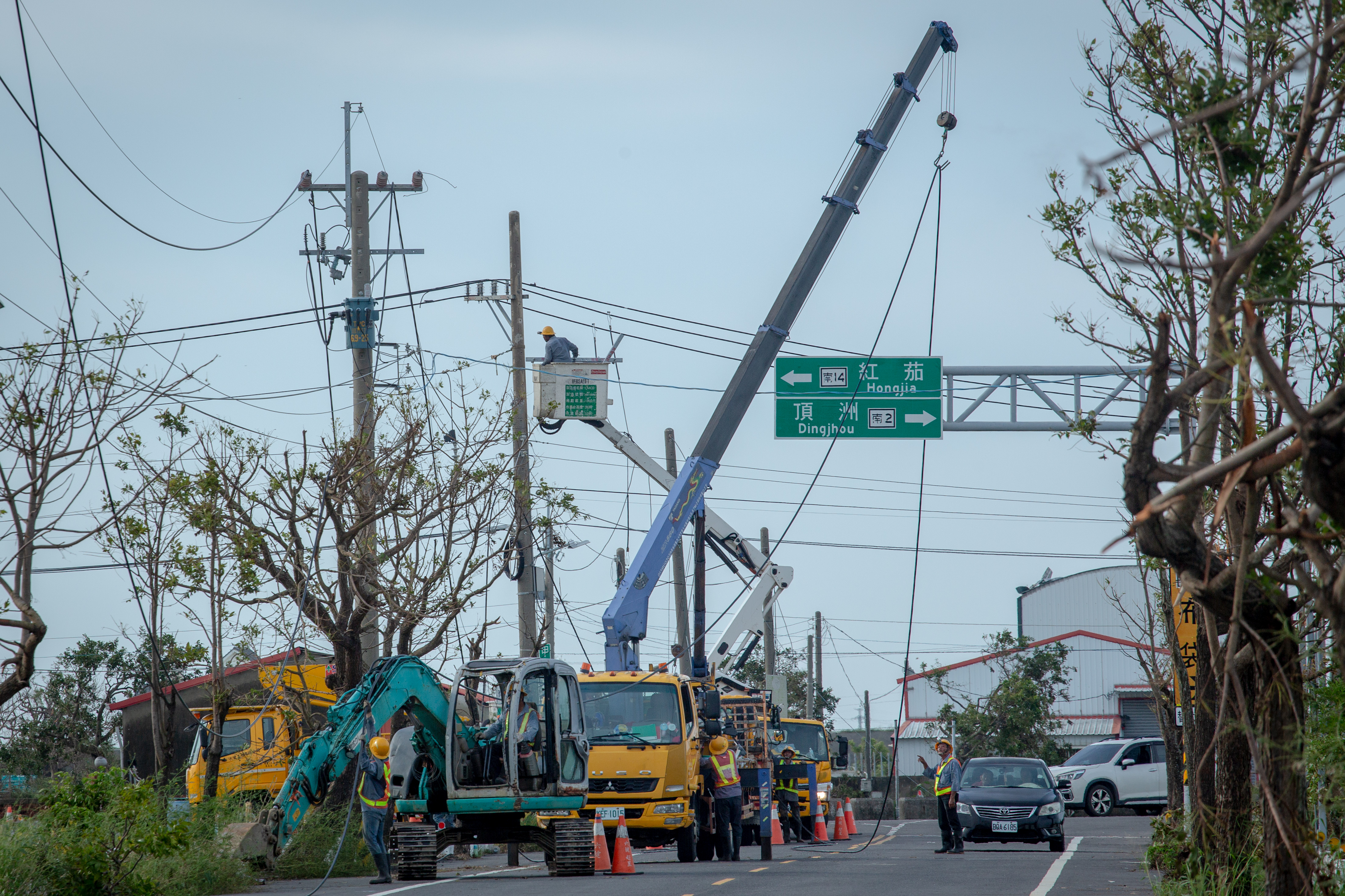 災後四天,許多遭丹娜絲肆虐之處仍未恢復。記者搭火車前往台南,租了一台共享機車往沿海移動;越靠近沿海地區,就越能看見多台台電工程車穿梭搶修。儘管連日努力,仍有許多電線桿橫倒在路旁。