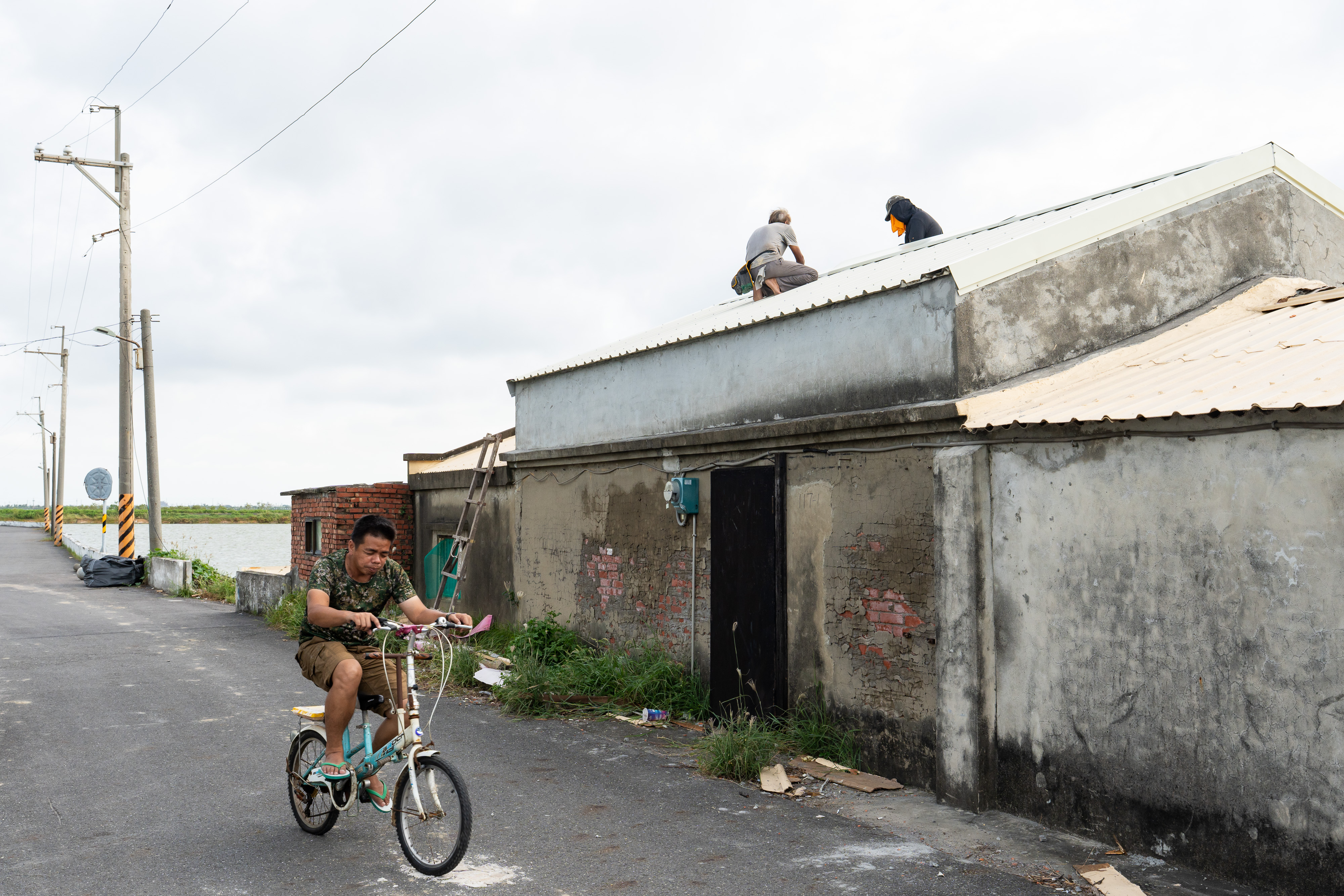 經濟相對寬裕的民眾,往往自行找工班處理損壞的屋頂。七股頂山社區的陳雲琳說,他已經 88 歲了,從沒見過這麼嚴重的風災。由於平常不住在頂山,不符合請領援助資格,他自己找人把屋頂修了。