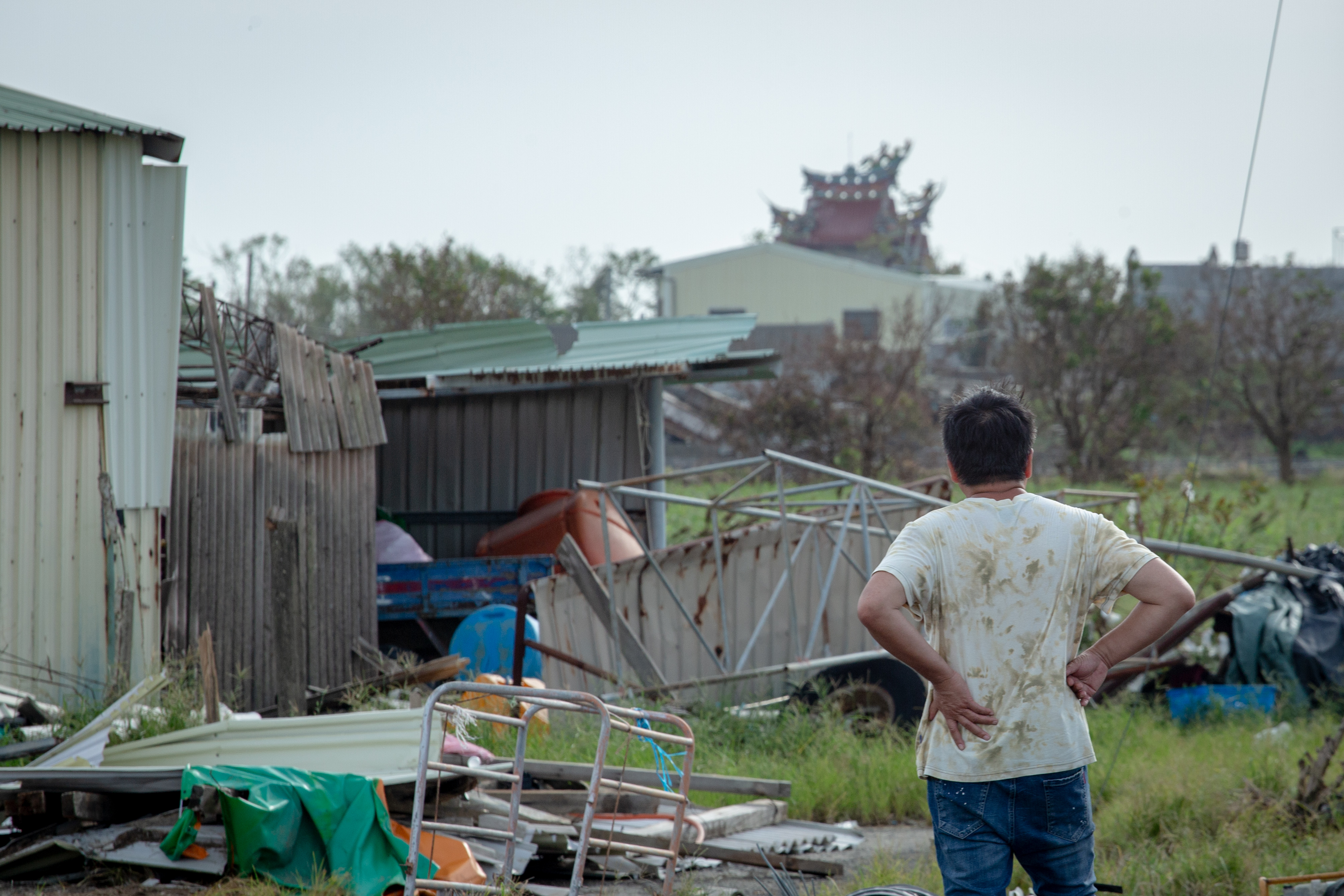 抵達受創最嚴重的七股西寮里,映入眼簾的是居民忙著把破損的家具搬到屋外。屋頂覆蓋著一片片帆布,勉強遮住破碎的家園。