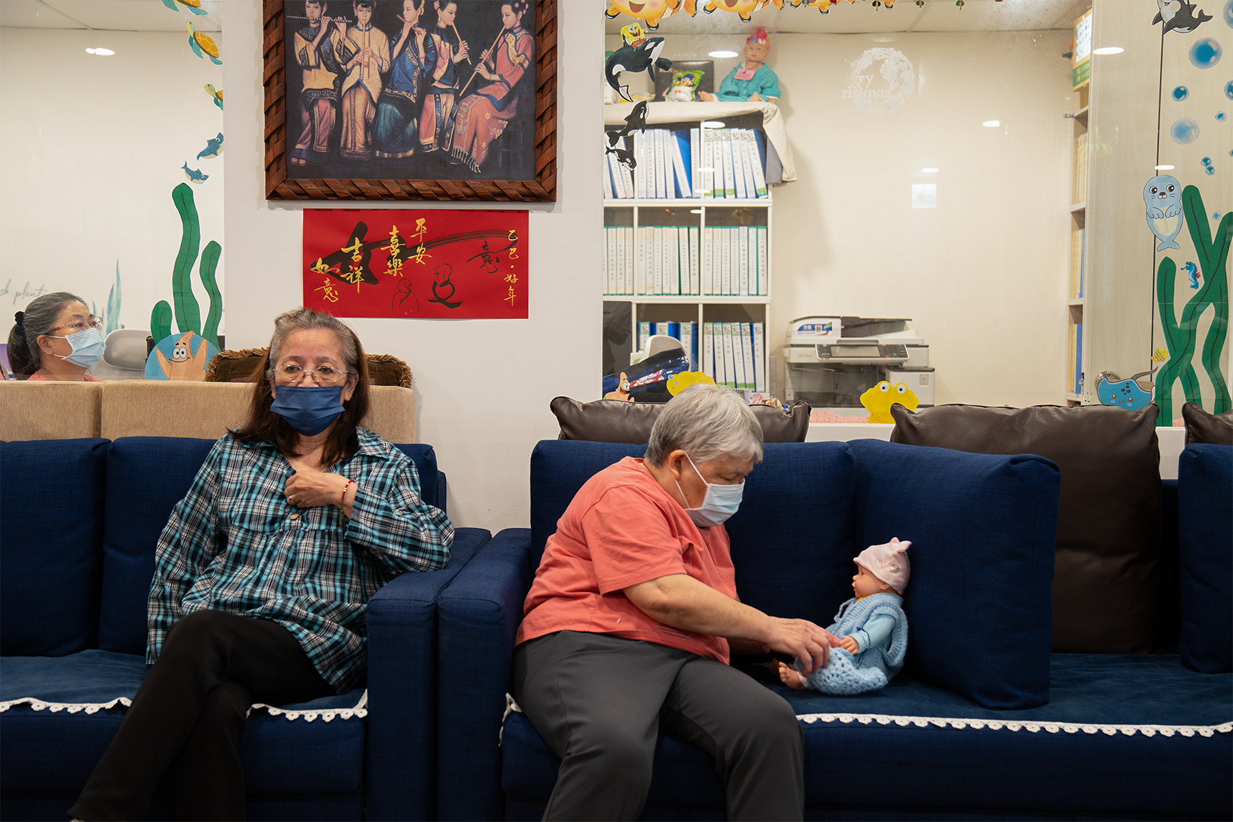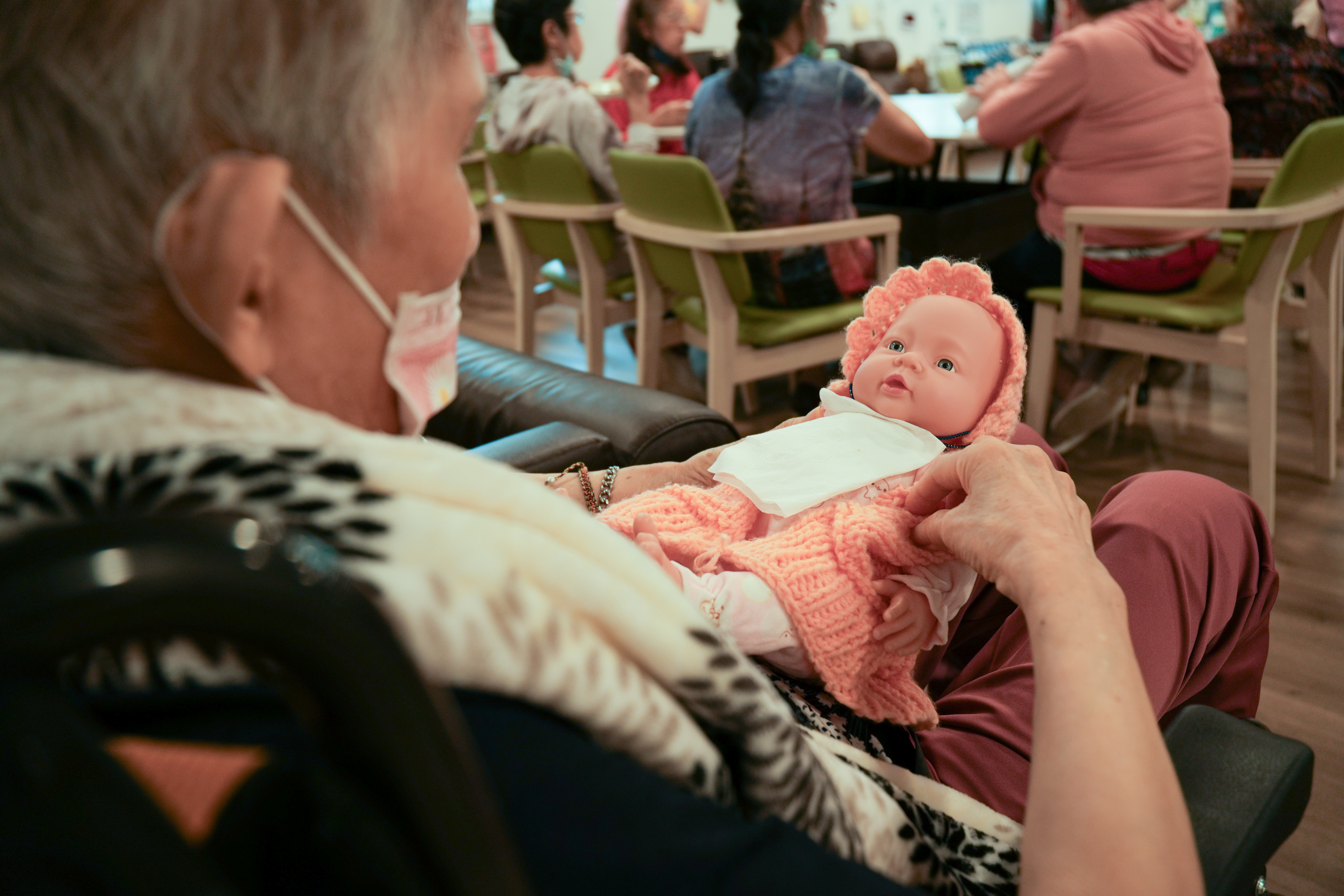 拿起洋娃娃,真真阿嬤神情變得專注且安靜。她仔細替娃娃整理衣服、輕拍或撫摸身軀,像是重新做著熟悉的事。洋娃娃上貼著真真替它取的名字-「林中男」,照服員笑著問她這是誰。「兒子很少回家,都是我在顧孫子⋯⋯」真真自顧自說著,手上一邊替娃娃繫好毛線衣。