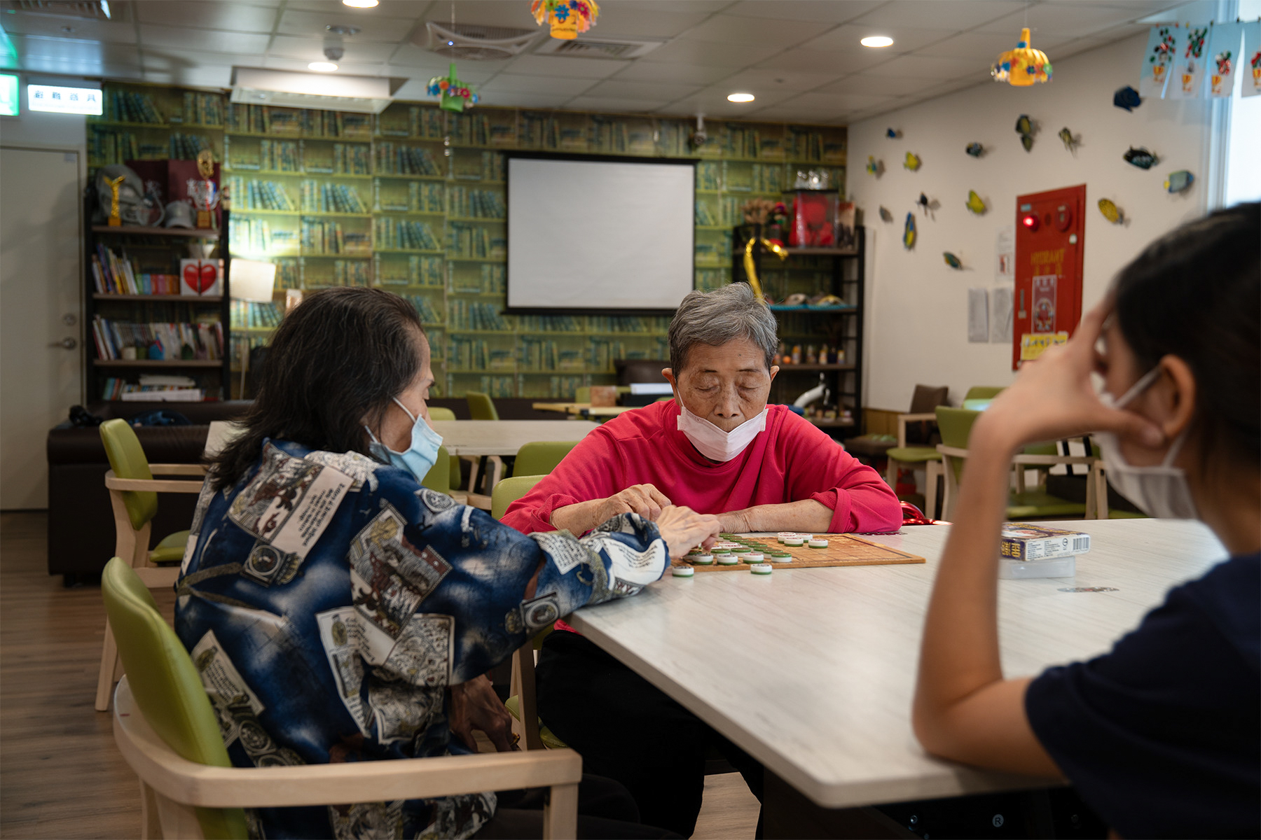「舉右手、舉左手,抬,抬,抬!」照顧服務員在十幾位長輩面前舉手抬足示範健身操,台下或坐或站的老人們有些勤勞地跟上動作,有些落後幾個拍子。這是高齡者日照機構的日常,上了年歲的長輩重回小學作息,一大早搭著交通車前來機構「上課」,下午三、四點再搭乘交通車返家。