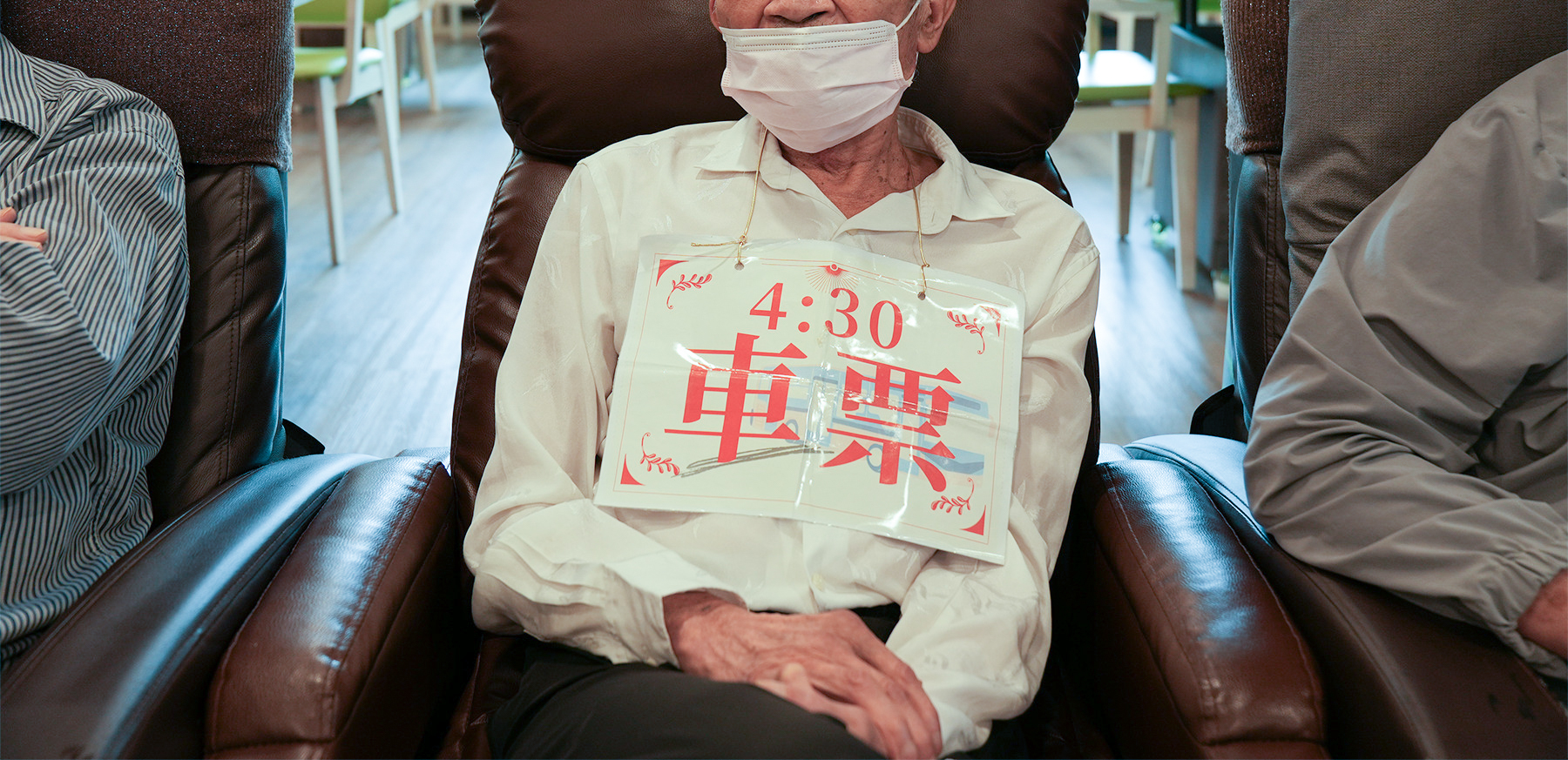 結束日照中心課程,預備回家前,阿福的白襯衫上掛著一張 A4 大小的牌子,上頭寫著「車票」二字。「阿福到下午時刻,常會焦急地想要找錢買回家車票。」照服員夢夢分享。