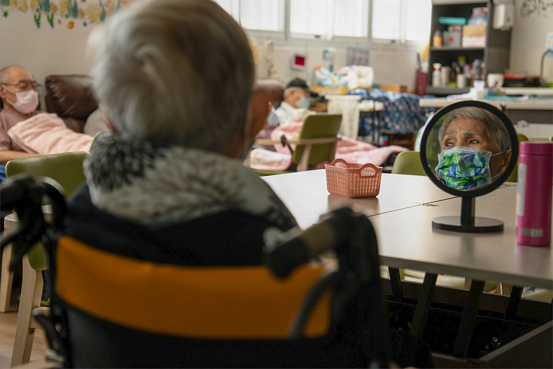 「橘媽愛漂亮,跌倒前常帶化妝用的鏡子來上課,擺桌上隨時照。」珮珮觀察,失智症惡化後,橘媽經常在中午過後出現焦慮、不安、想回家的情緒。然而,照服員偶然發現,把一面鏡子擺在她面前,對她來說似乎有安定的作用。