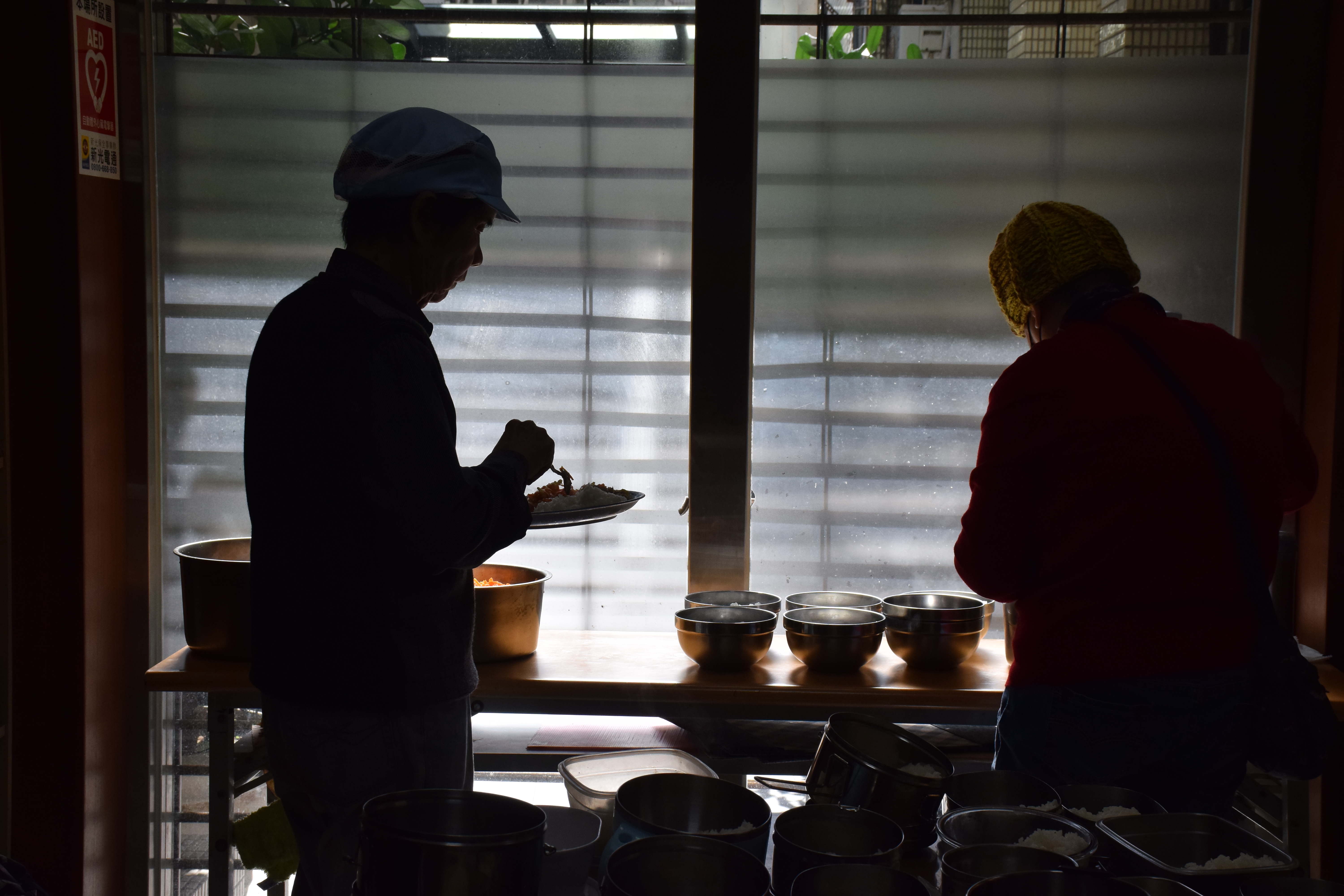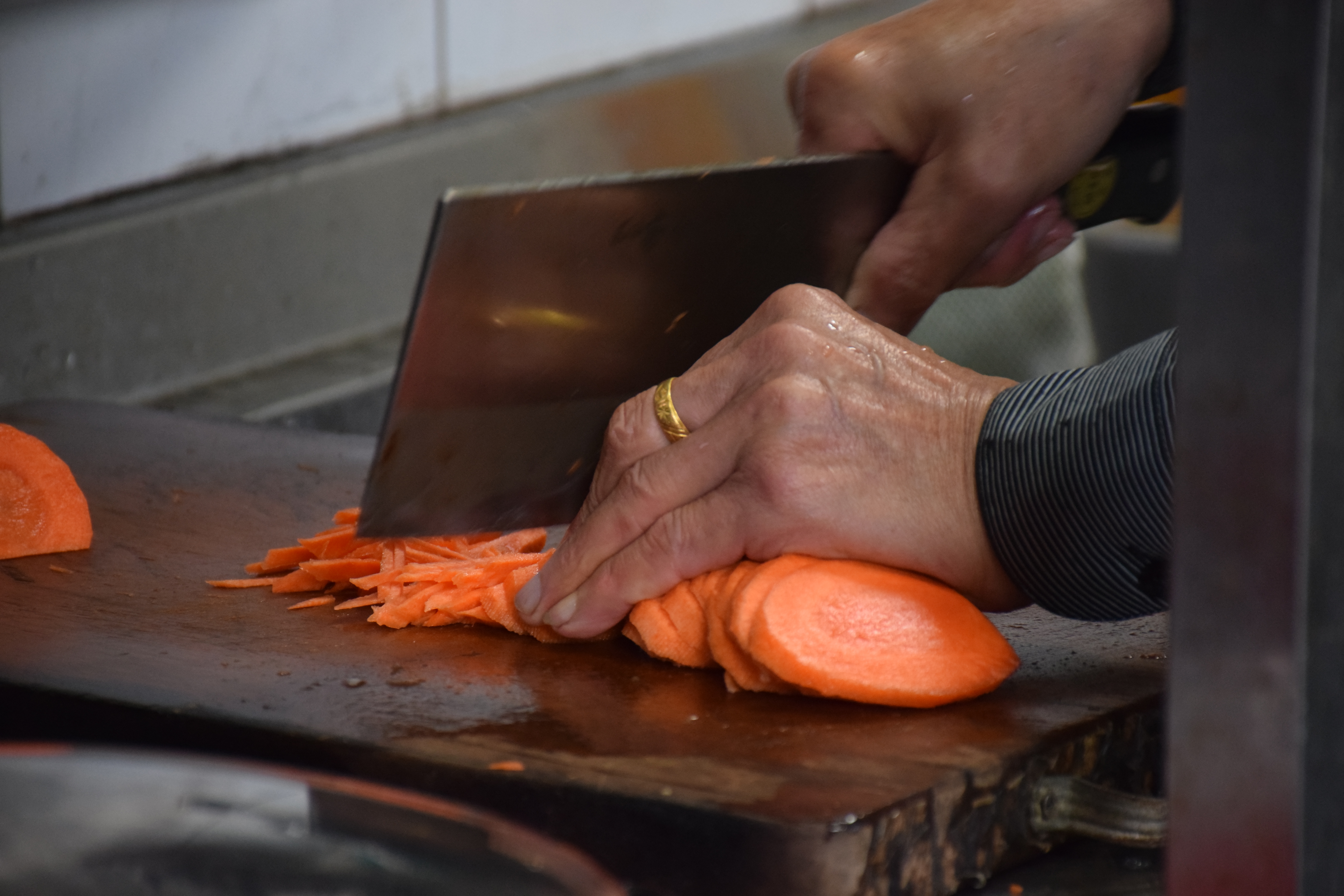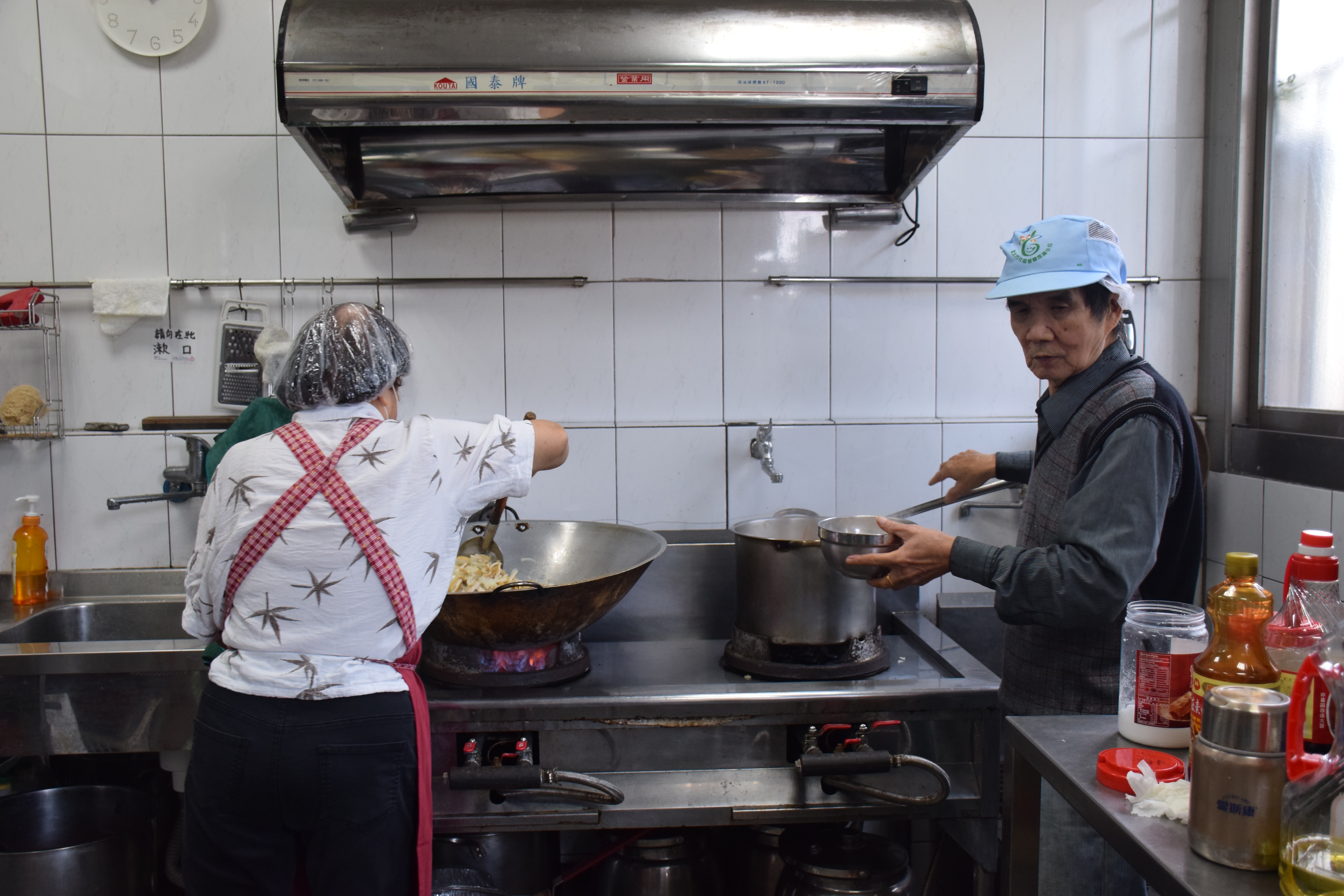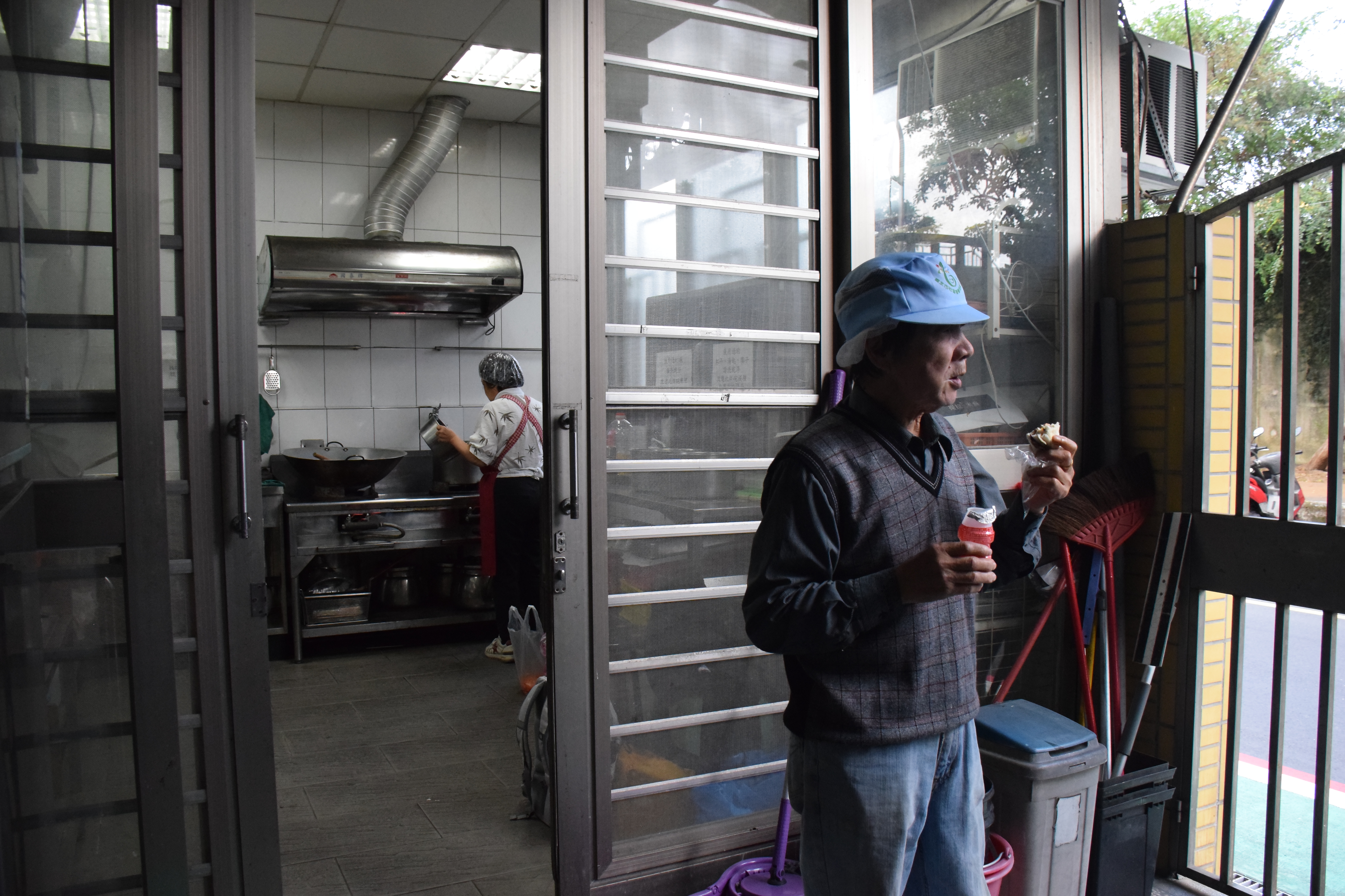 早上八點,吳爸已在饒河街的松山教會忙著為中午的高齡共餐食堂備菜。正午時分,一清潔完廚房,吳爸便趕回家為剛起床的兒子準備午餐。短暫歇息後,下午三點,又獨自推著沉重的攤車,從河堤倉庫走向夜市準備擺攤,直到深夜十一點才結束一天的勞動。