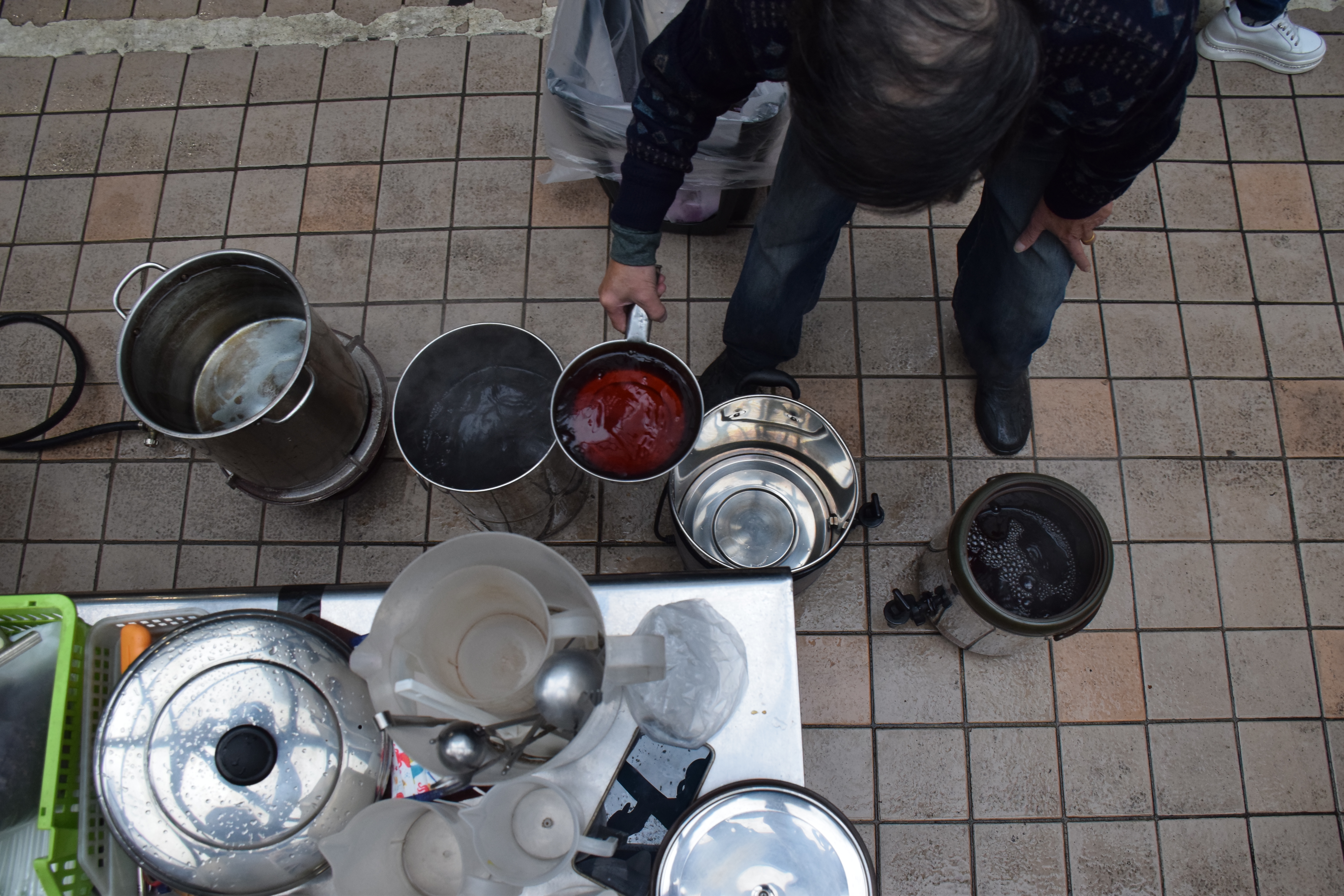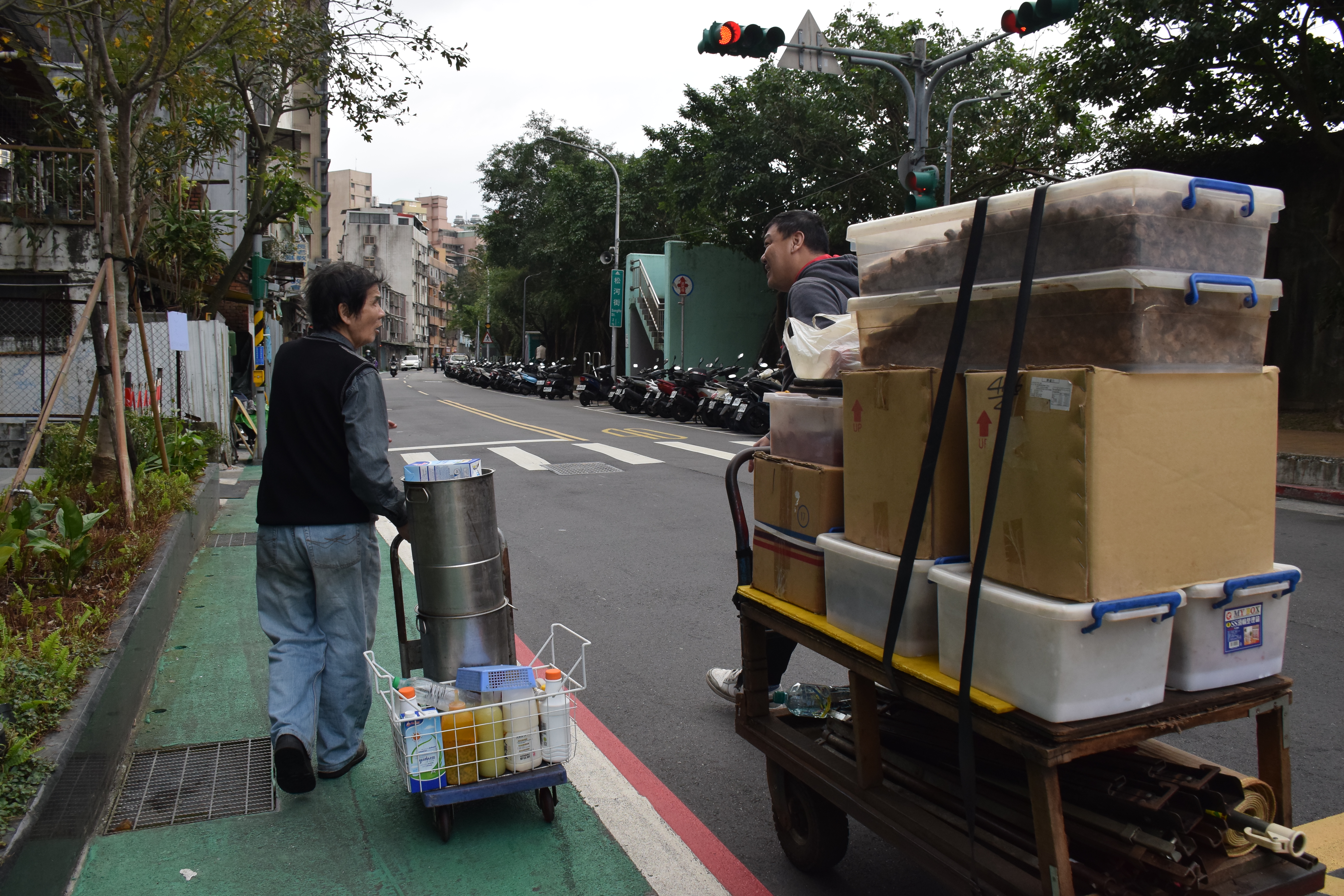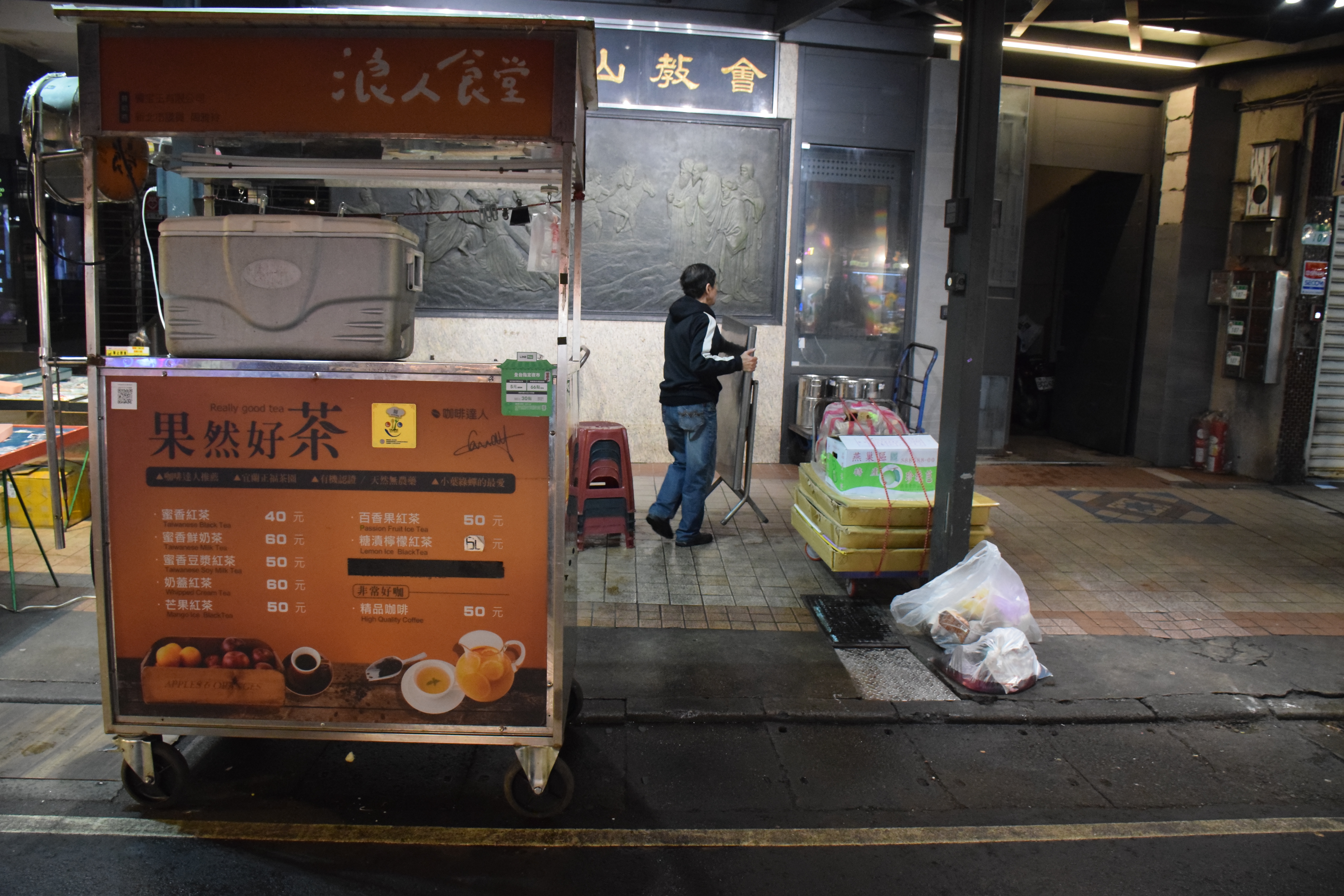 熙攘的人潮中,我陪著吳爸叫賣。當饒河街逐漸歸於寧靜,吳爸俐落地將煮茶器具沖洗、收拾,再將攤車推回倉庫。身形矮小的他,拖著疲憊的步伐走入饒河街旁的暗巷。巷子的盡頭,是他和兒子蝸居的住所。