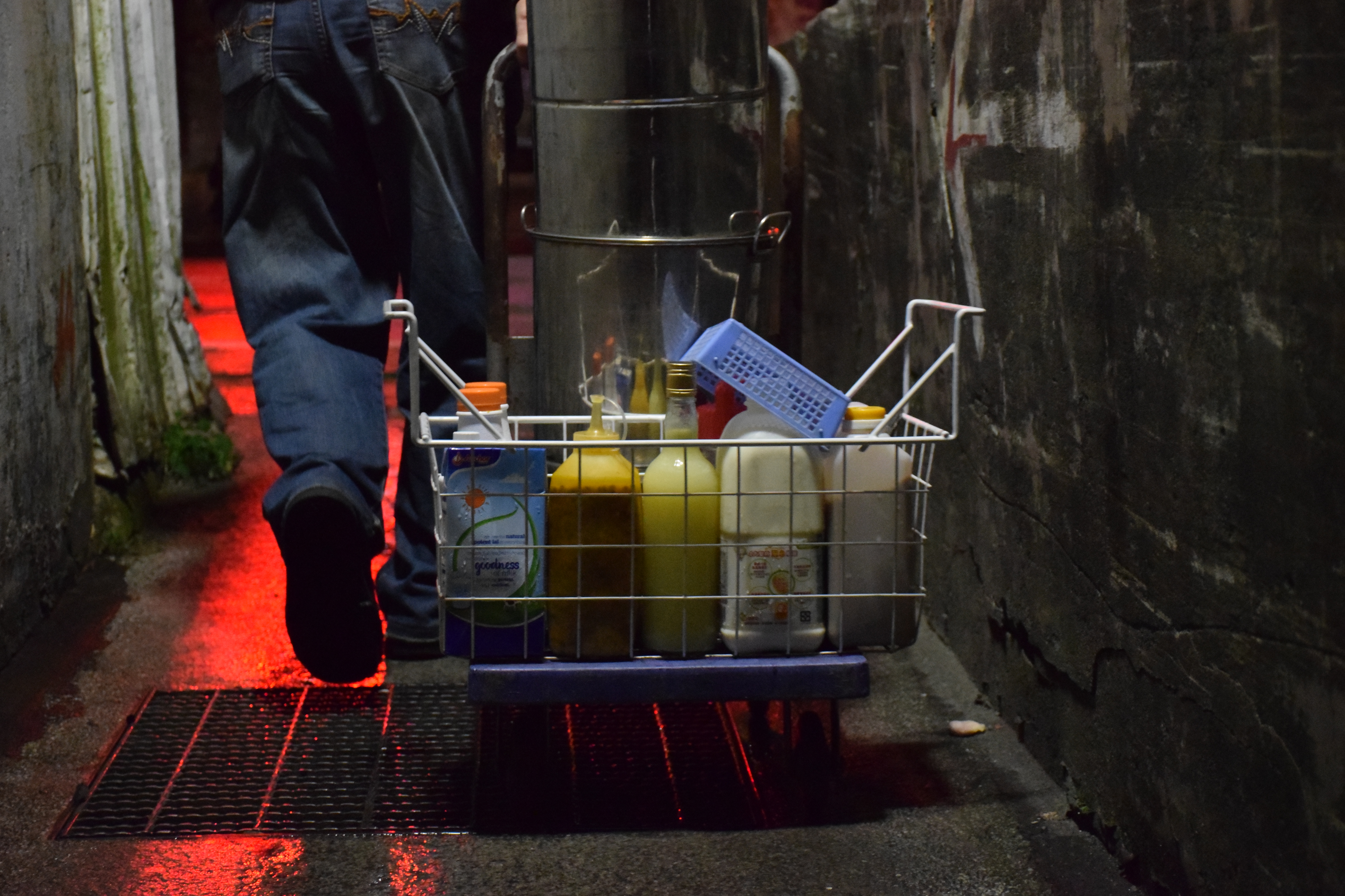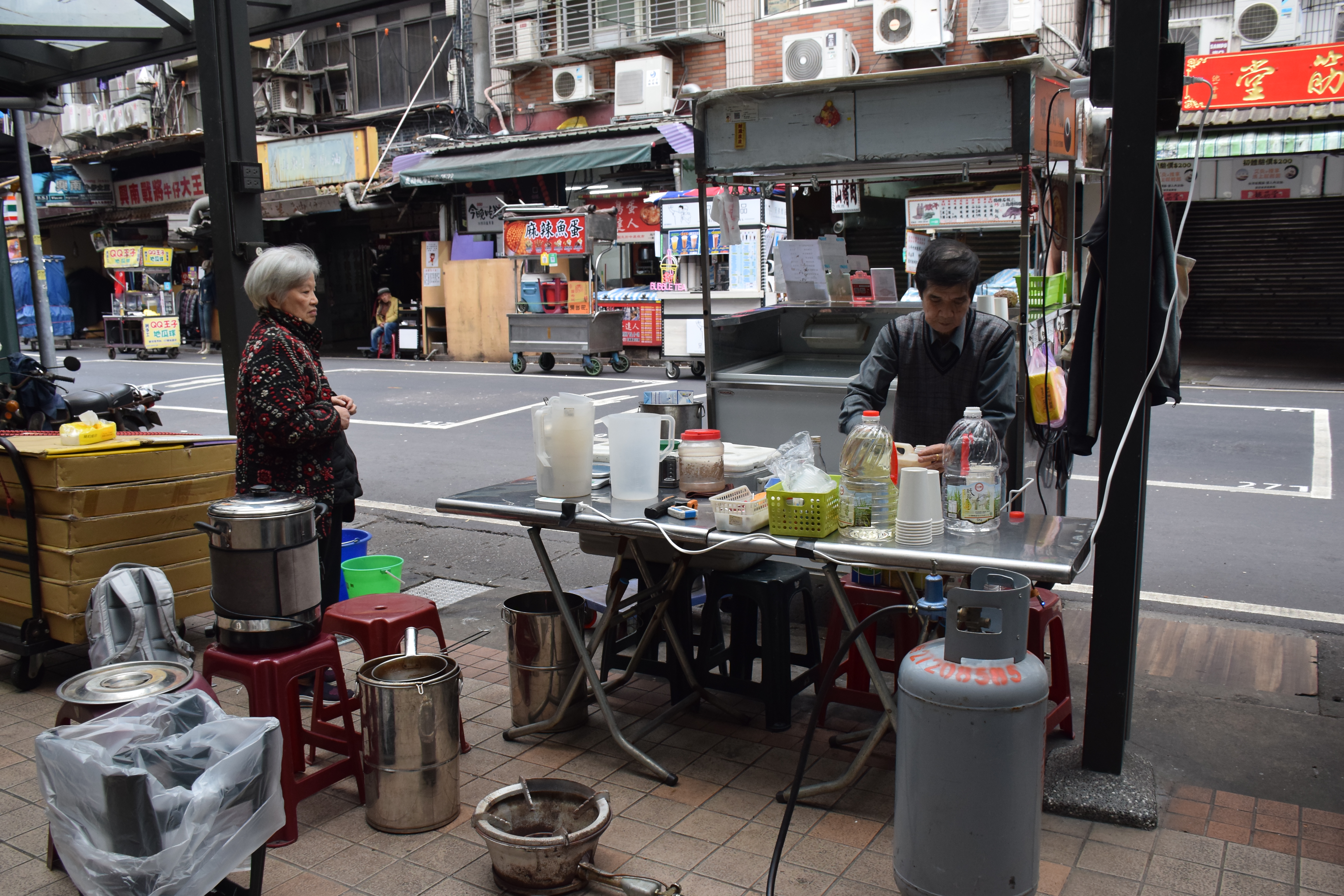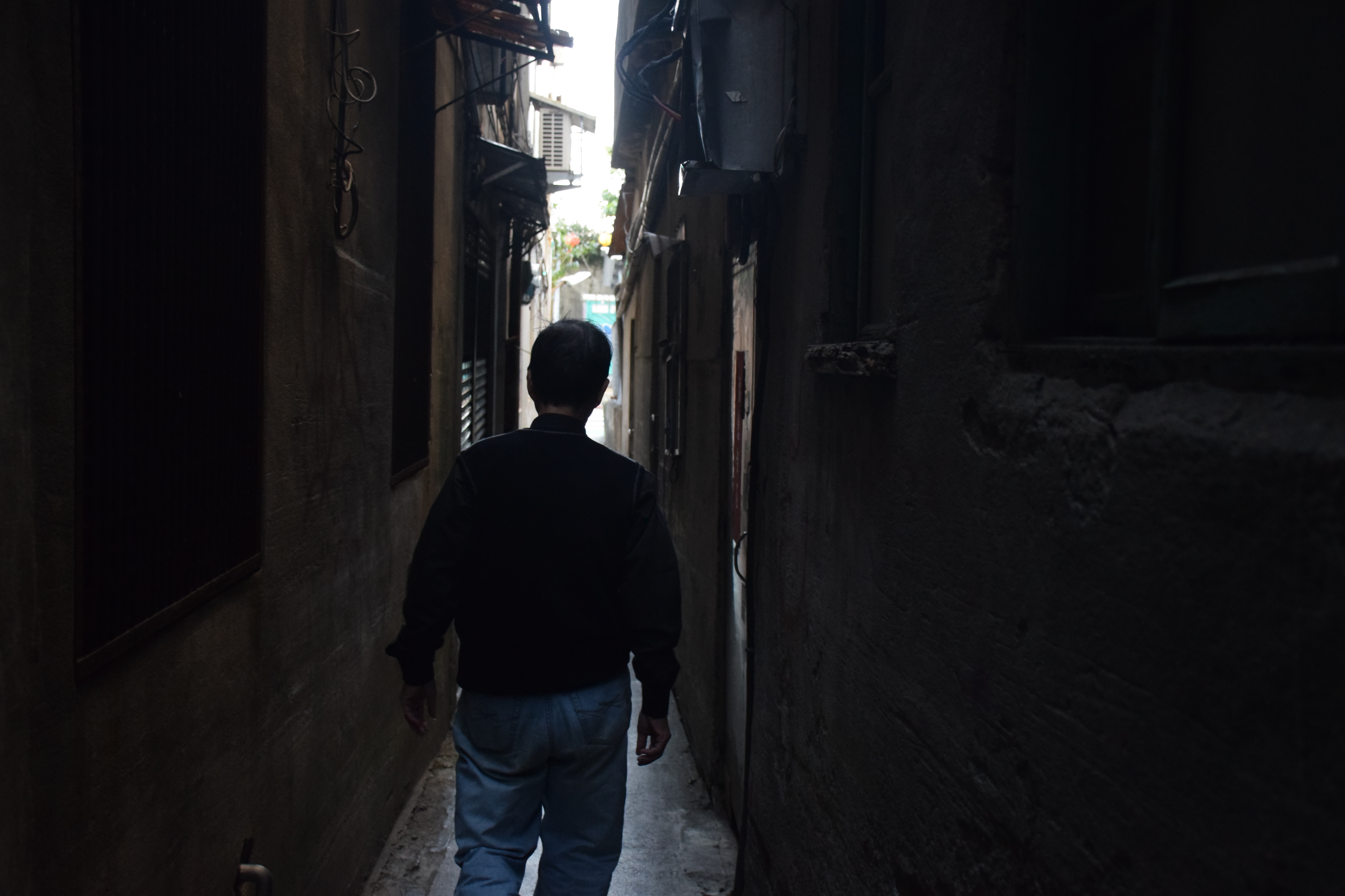 熙攘的人潮中,我陪著吳爸叫賣。當饒河街逐漸歸於寧靜,吳爸俐落地將煮茶器具沖洗、收拾,再將攤車推回倉庫。身形矮小的他,拖著疲憊的步伐走入饒河街旁的暗巷。巷子的盡頭,是他和兒子蝸居的住所。