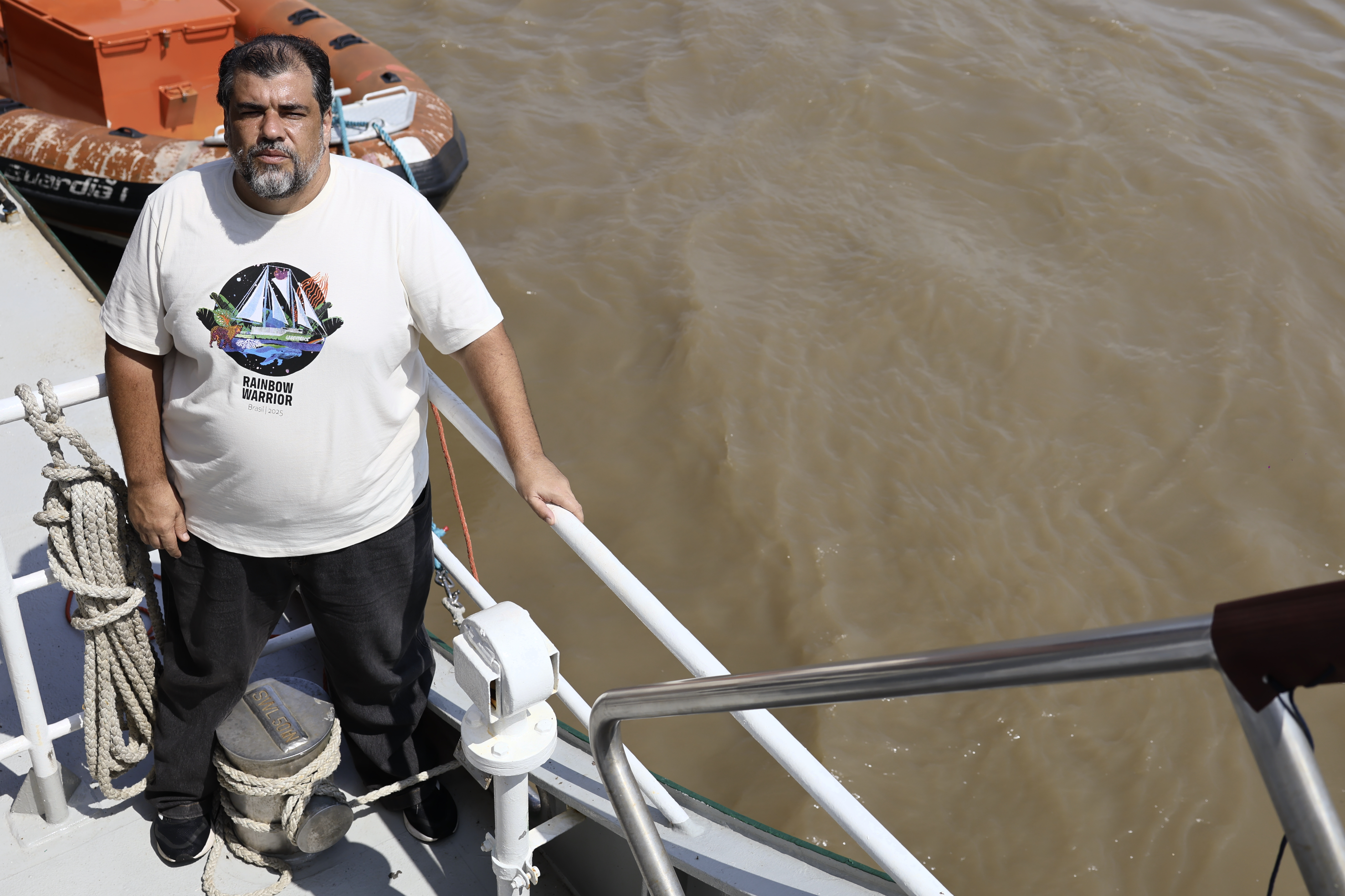 來到巴西貝倫 COP30 會場附近的大學,環保組織綠色和平的「彩虹勇士號」船艦停靠在碼頭,船身掛著一幅醒目標語:「 Action, Justice, Hope」(行動、正義、希望)。