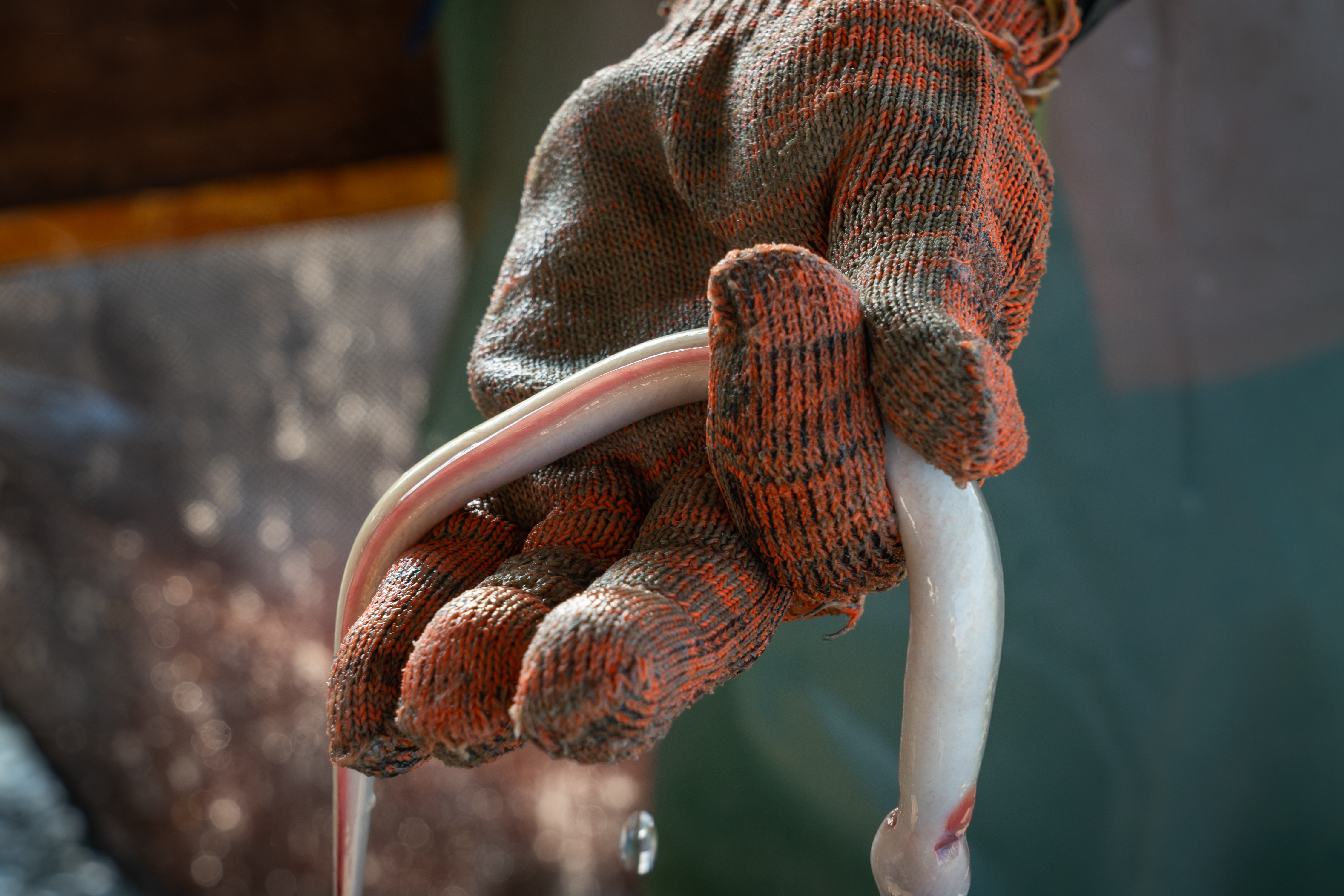 鰻魚生性滑溜,越想用手握緊,越抓不住。趙炳煌這位老鰻人,熟稔地用手指頭或是鐵製撥桿,順勢把鰻魚推入網袋。