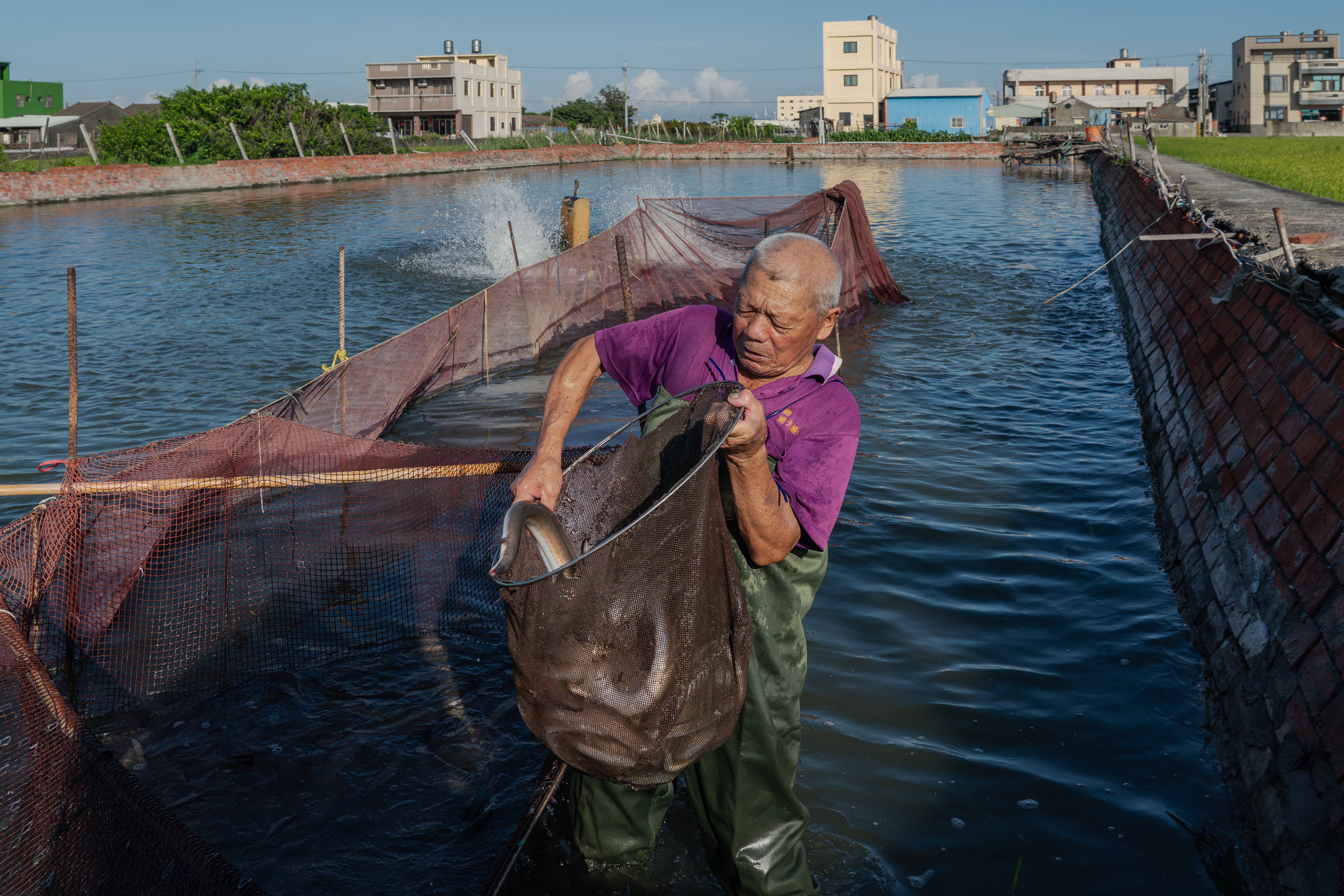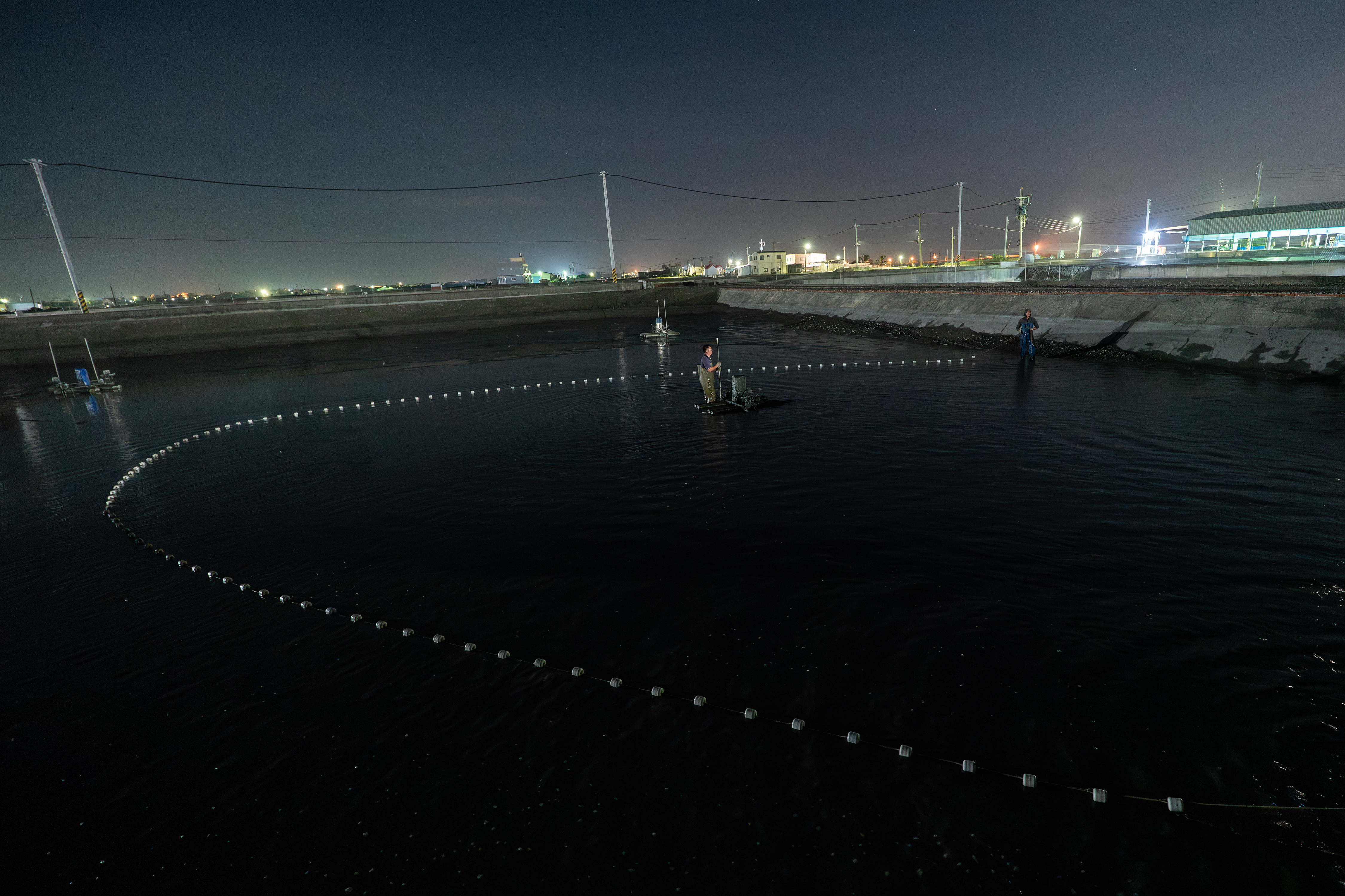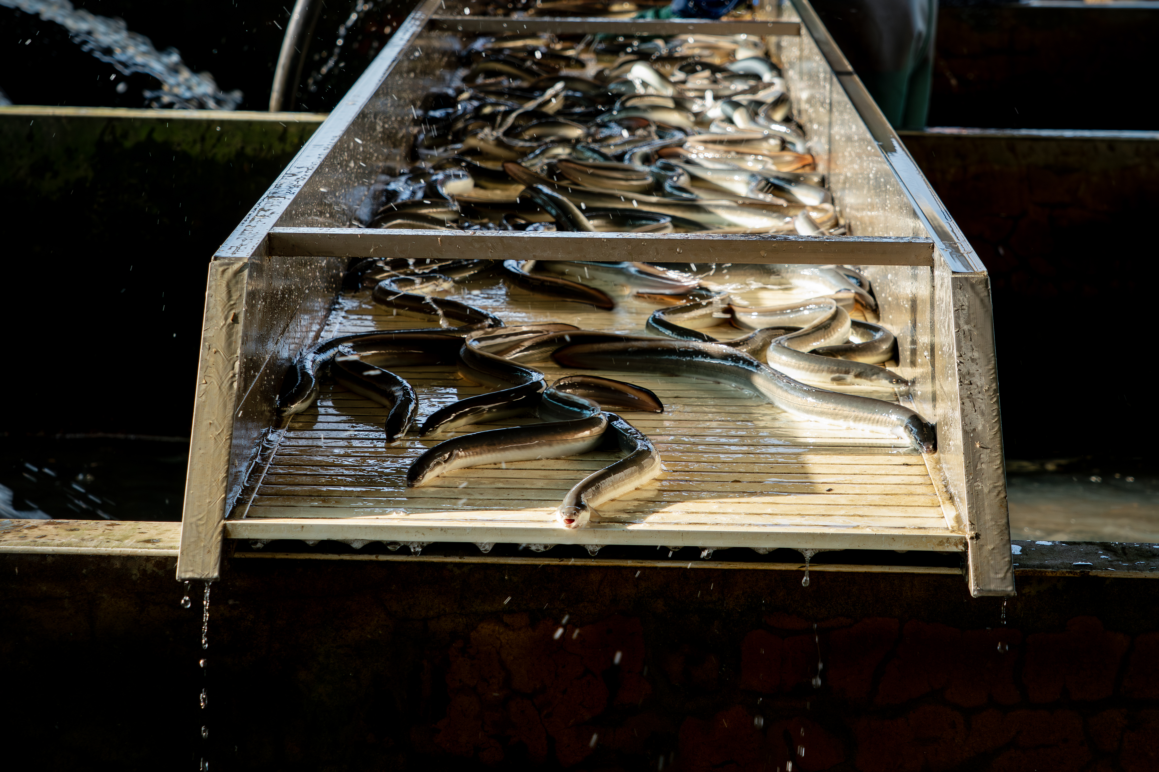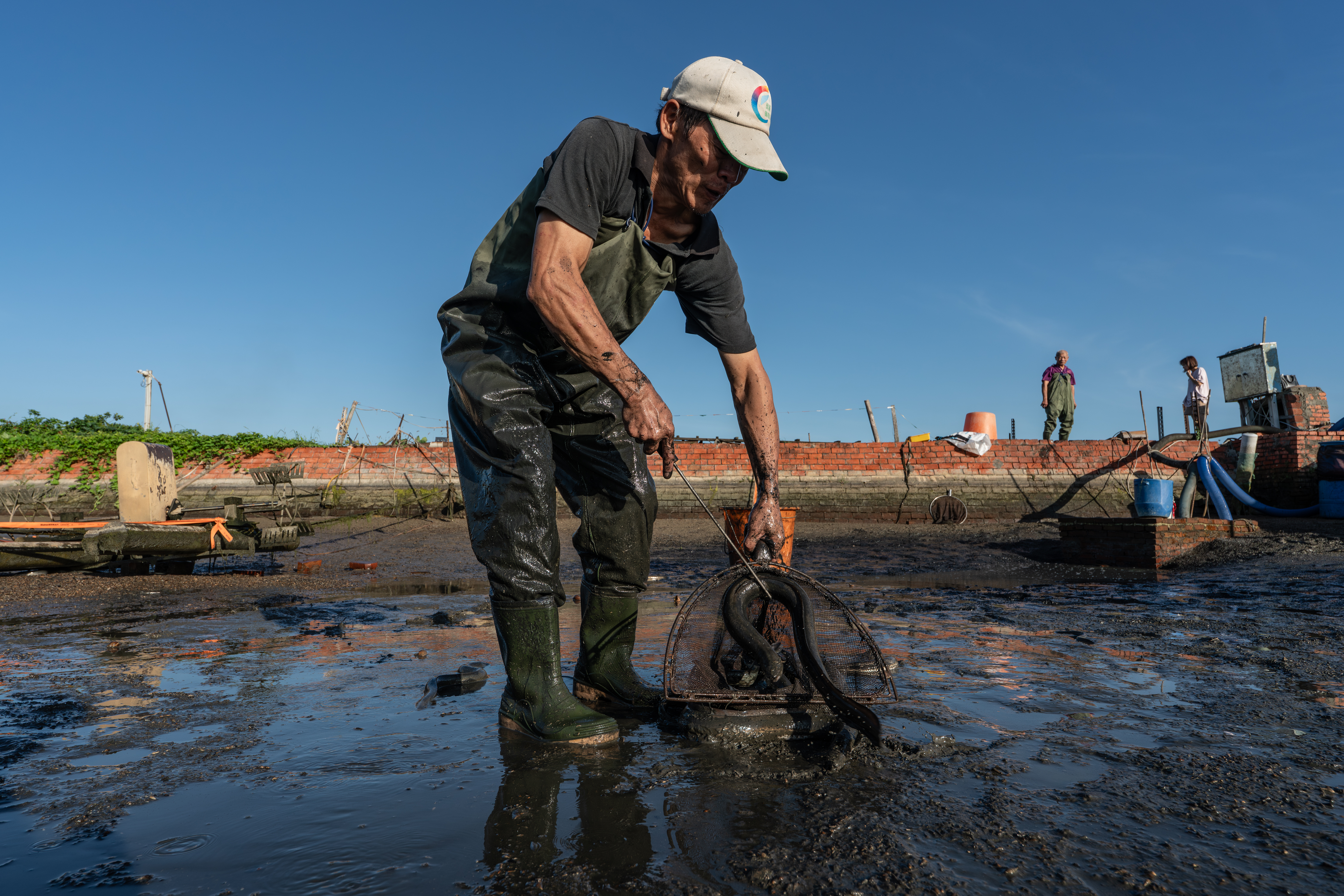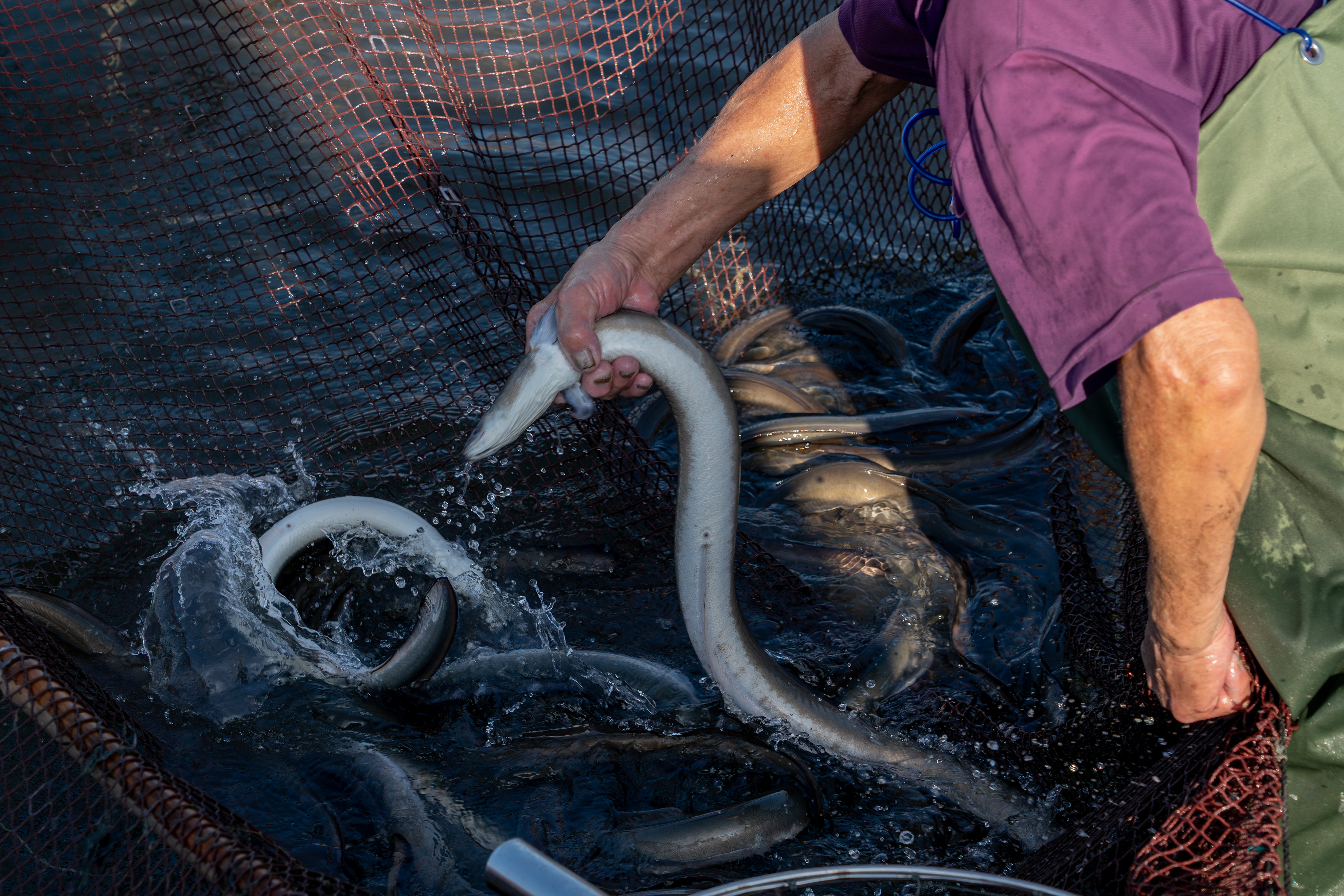 這次工作是要把 2.5P(編按:鰻魚規格常以「 P 數」表示,即「每公斤幾尾」的意思。2.5P 指一公斤 2.5 尾)成鰻撈起來銷售。較小的鰻魚則過篩後放回池裡。