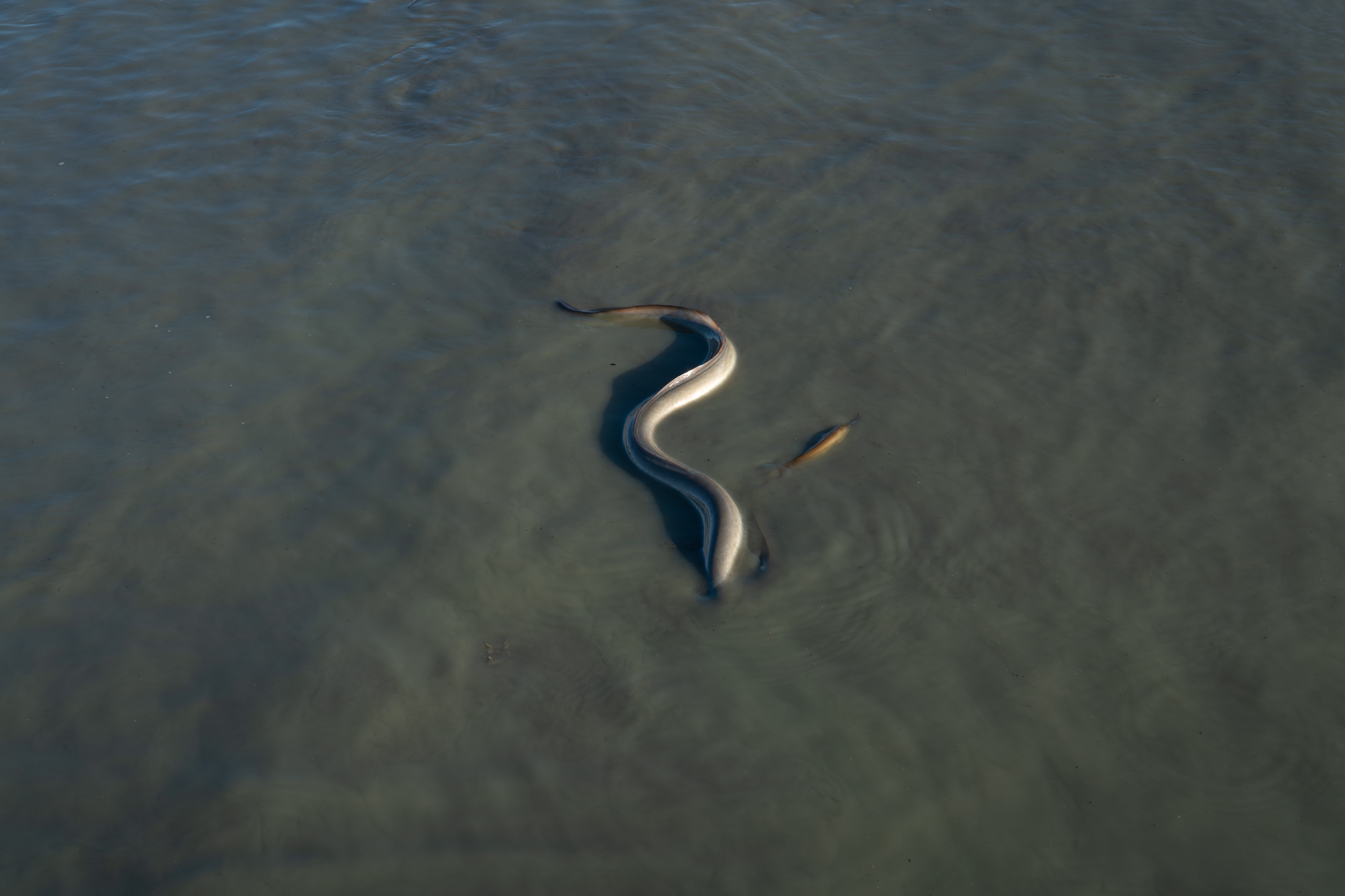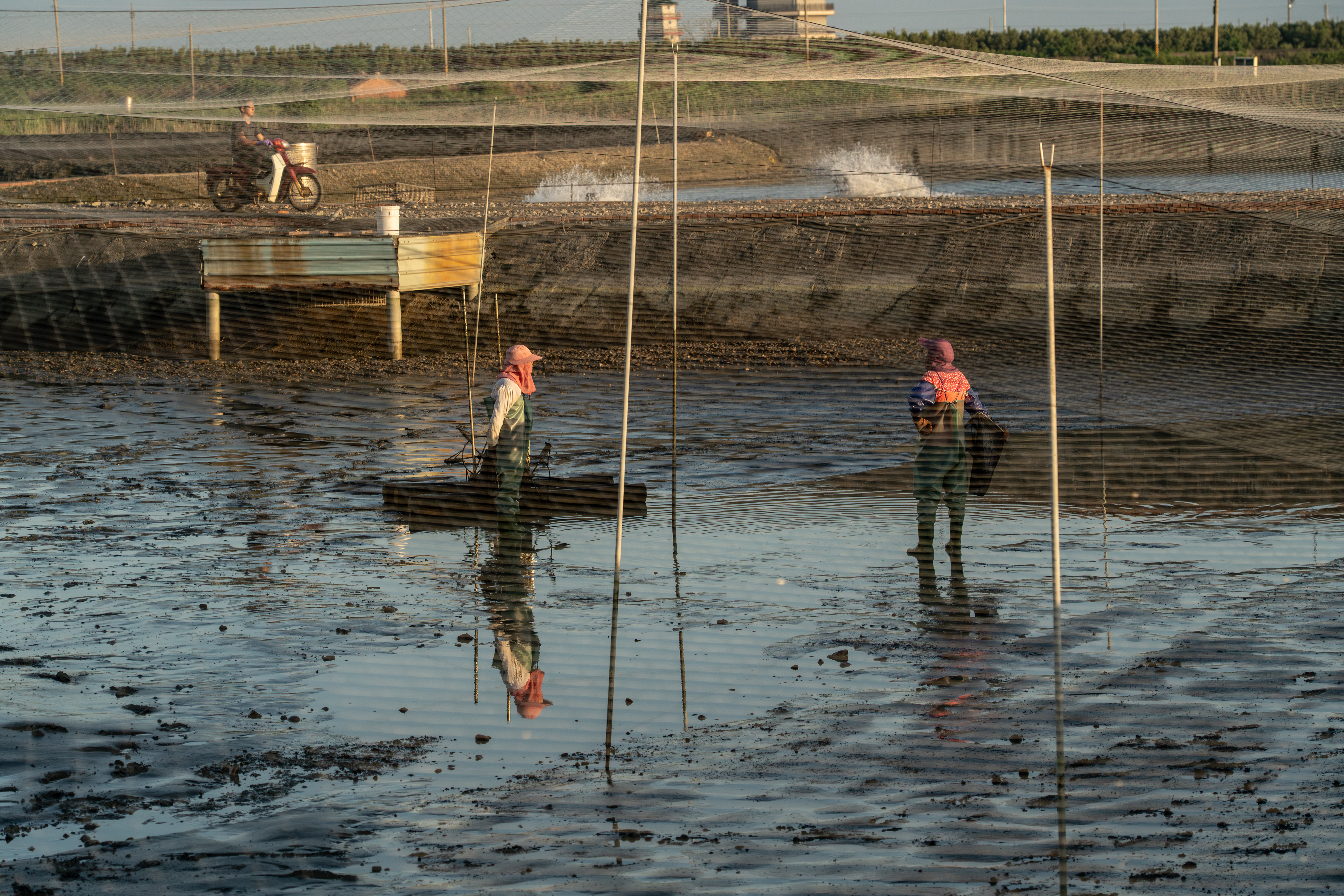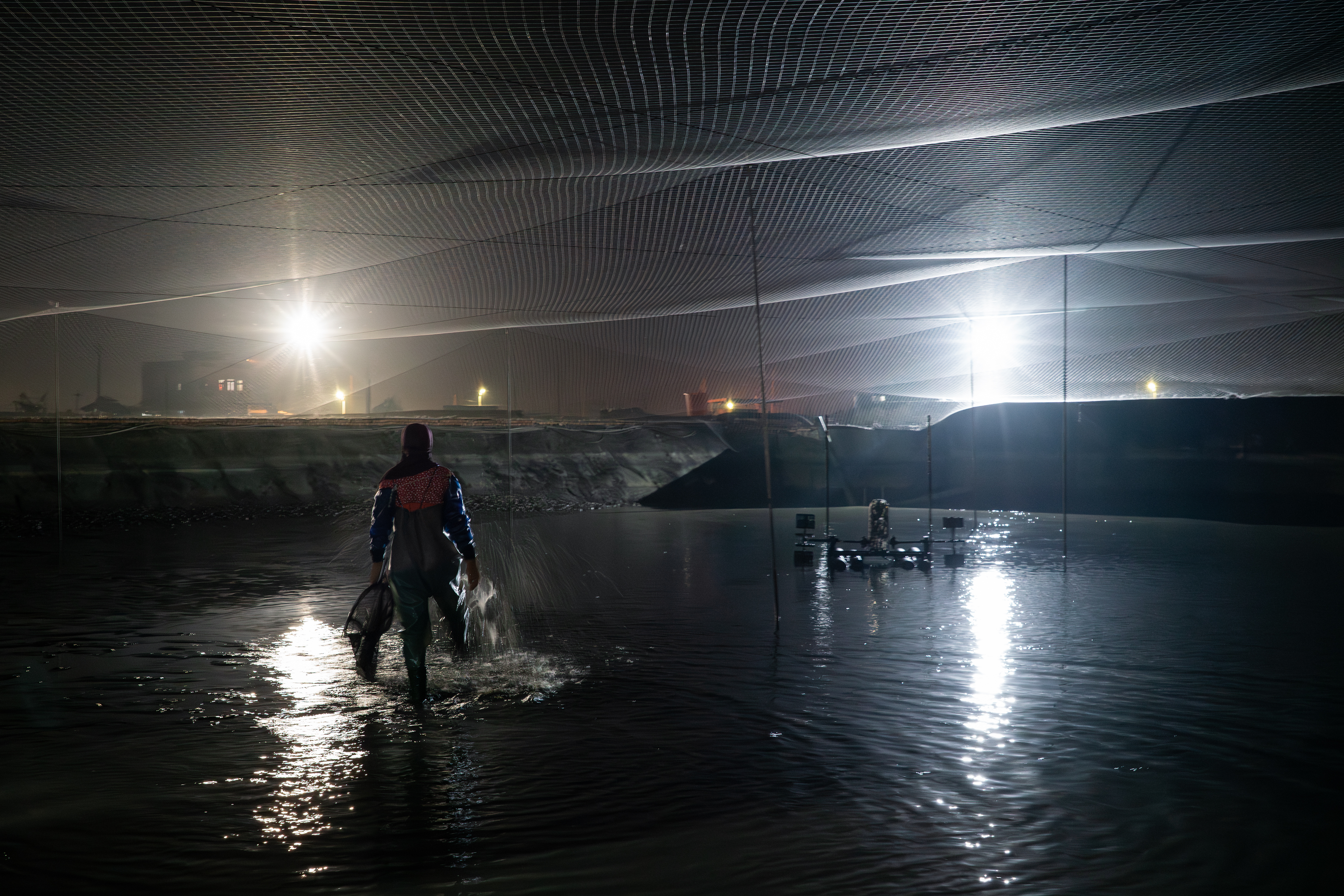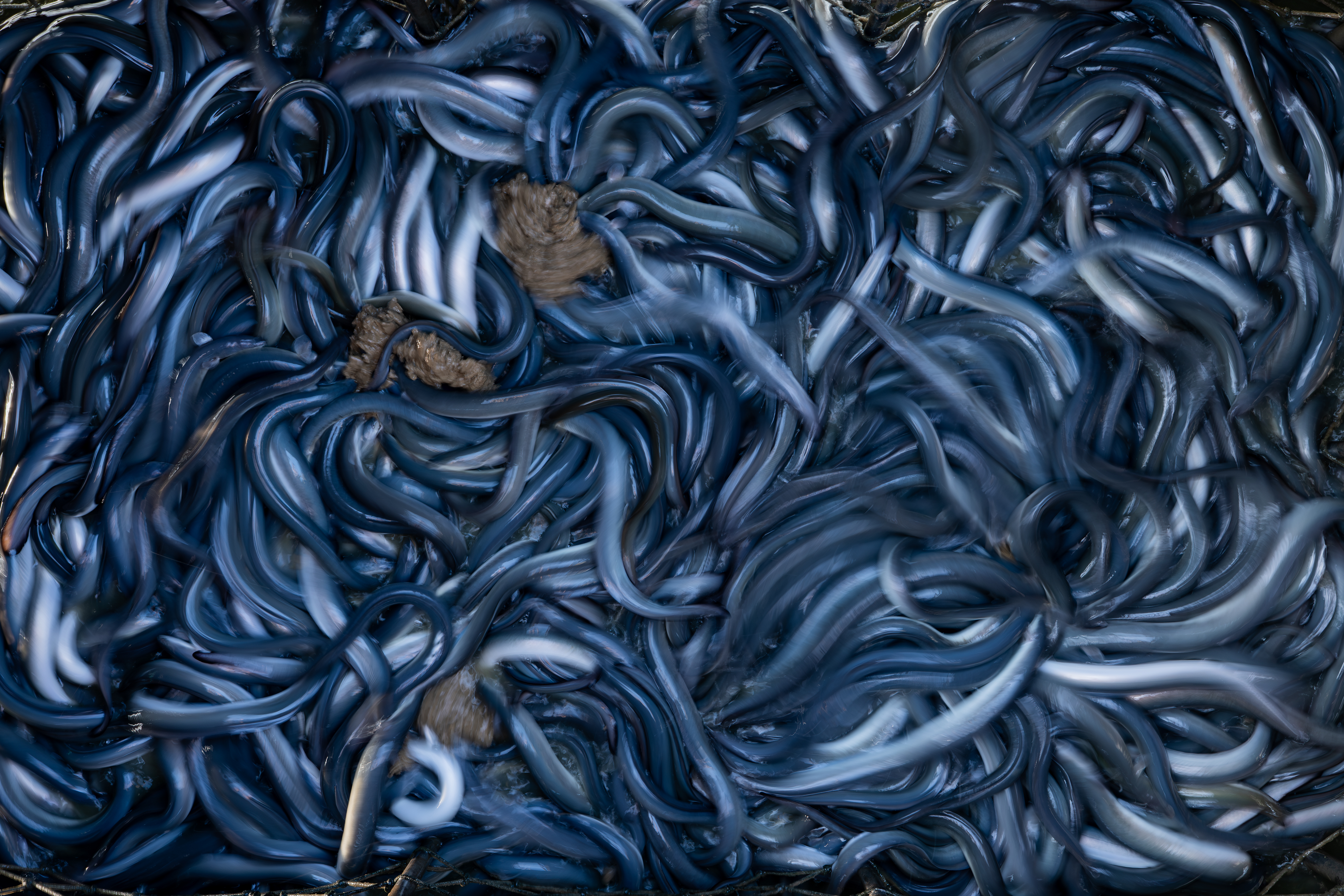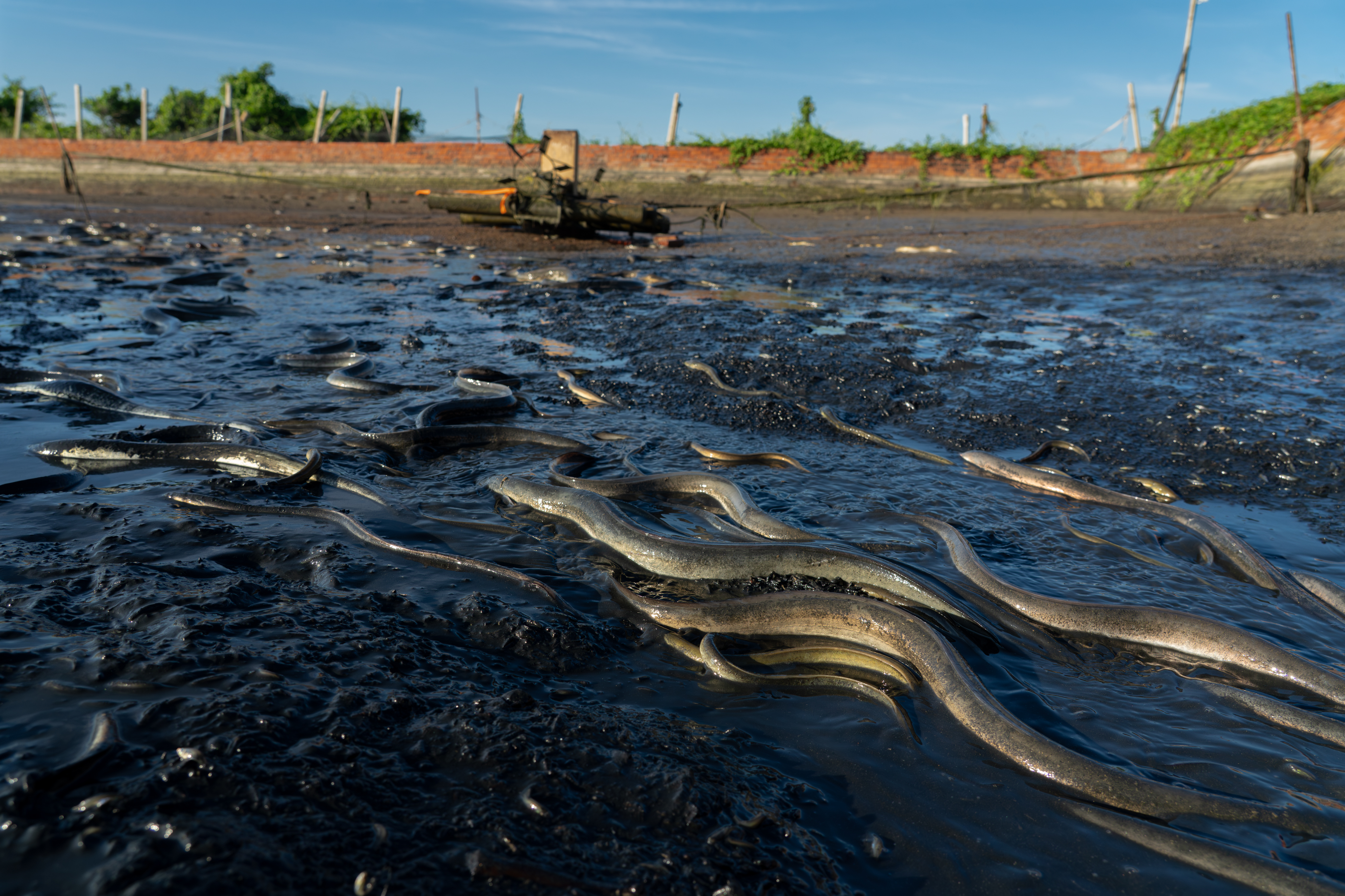 這次工作是要把 2.5P(編按:鰻魚規格常以「 P 數」表示,即「每公斤幾尾」的意思。2.5P 指一公斤 2.5 尾)成鰻撈起來銷售。較小的鰻魚則過篩後放回池裡。