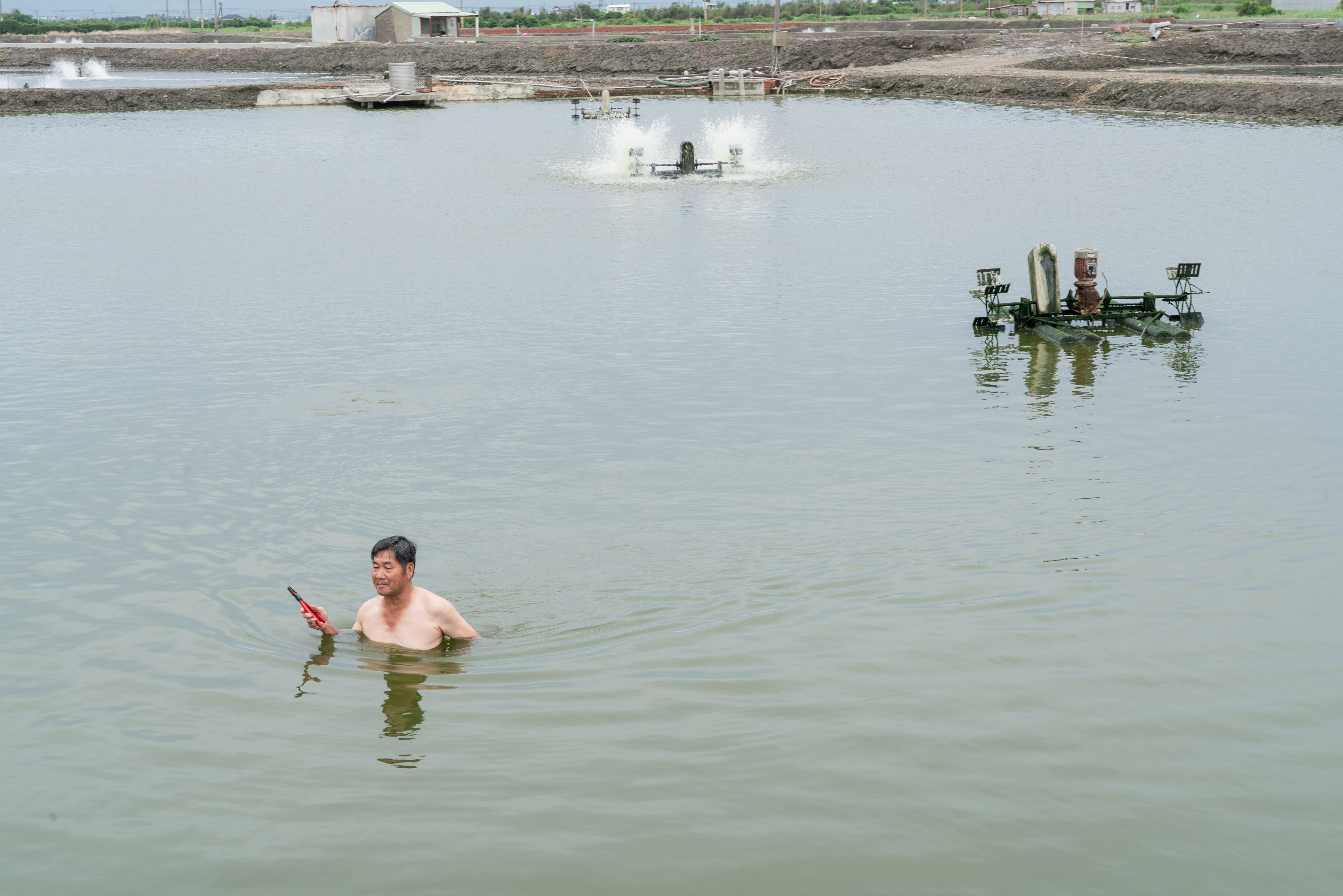 魚塭中的水車故障,一旁的兒子確認斷電安全後,李建宏帶著簡單的鉗子,就直接下池進行修復工作。