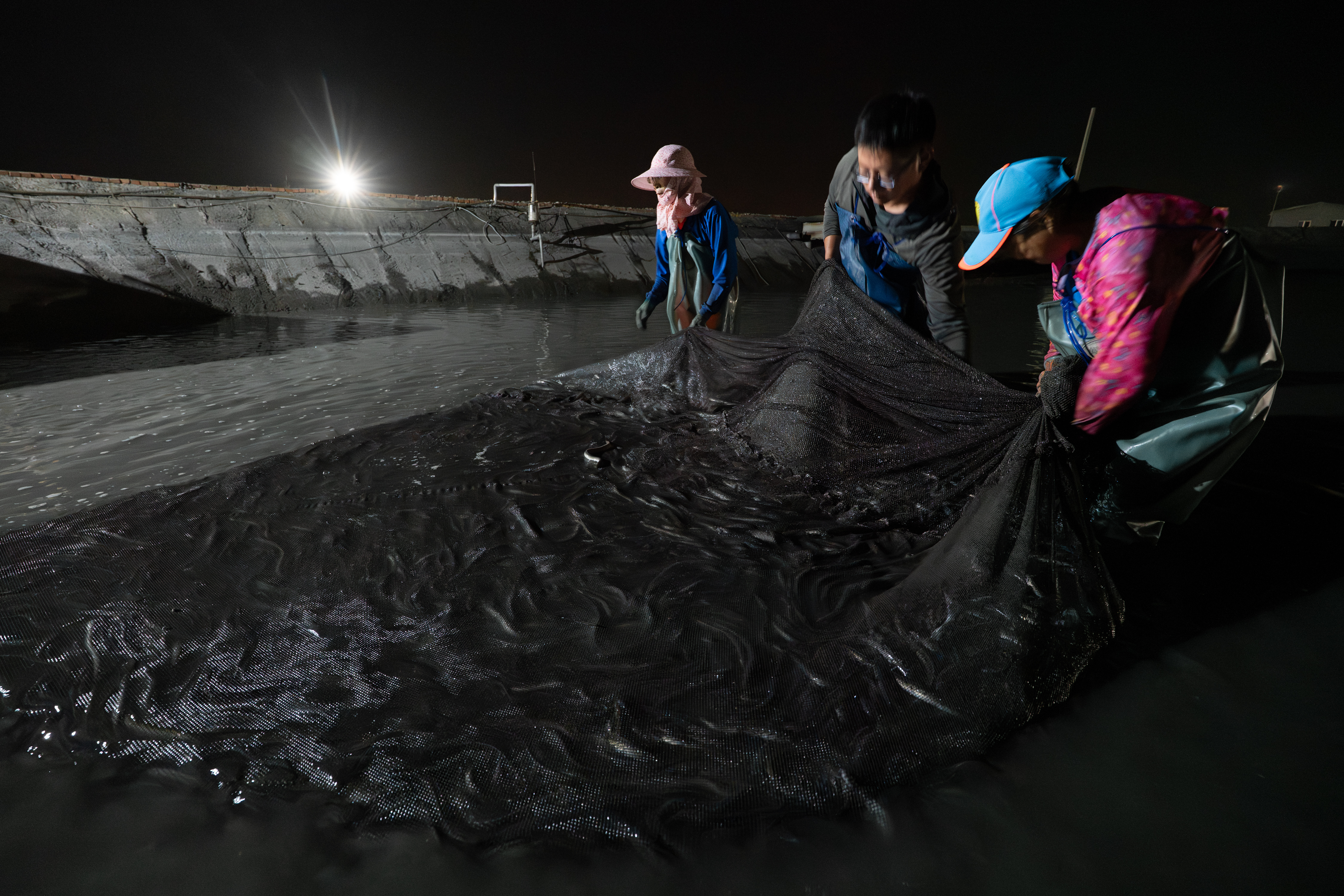 月光微霧的凌晨三點半,養鰻場燈火通明,李安靜帶著兩個兒子、雇來的幫手,一隊人馬四點不到,開始今天鰻魚過篩換池工作。夜行性的鰻魚待李安靜餵食後,隨日出而眠。