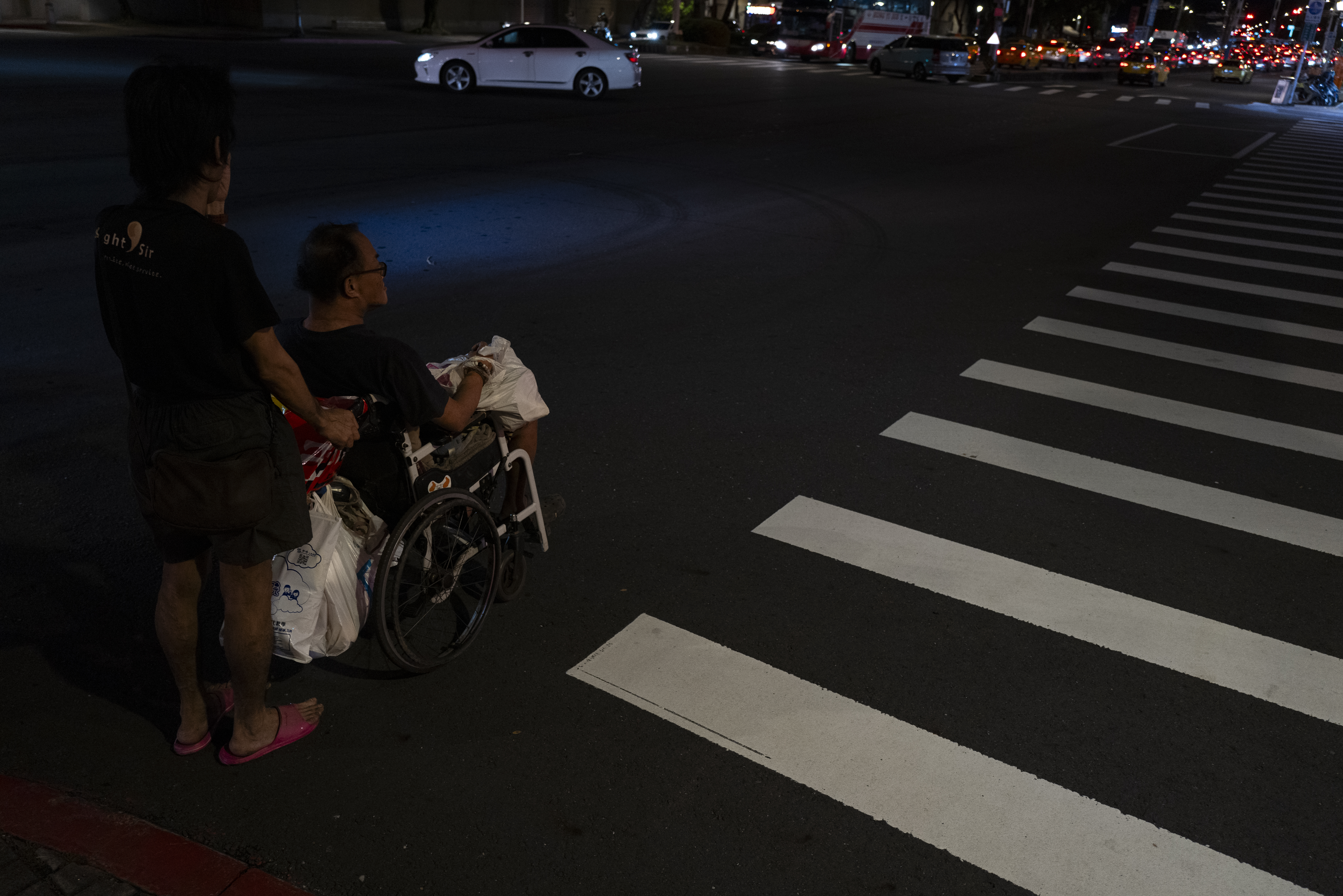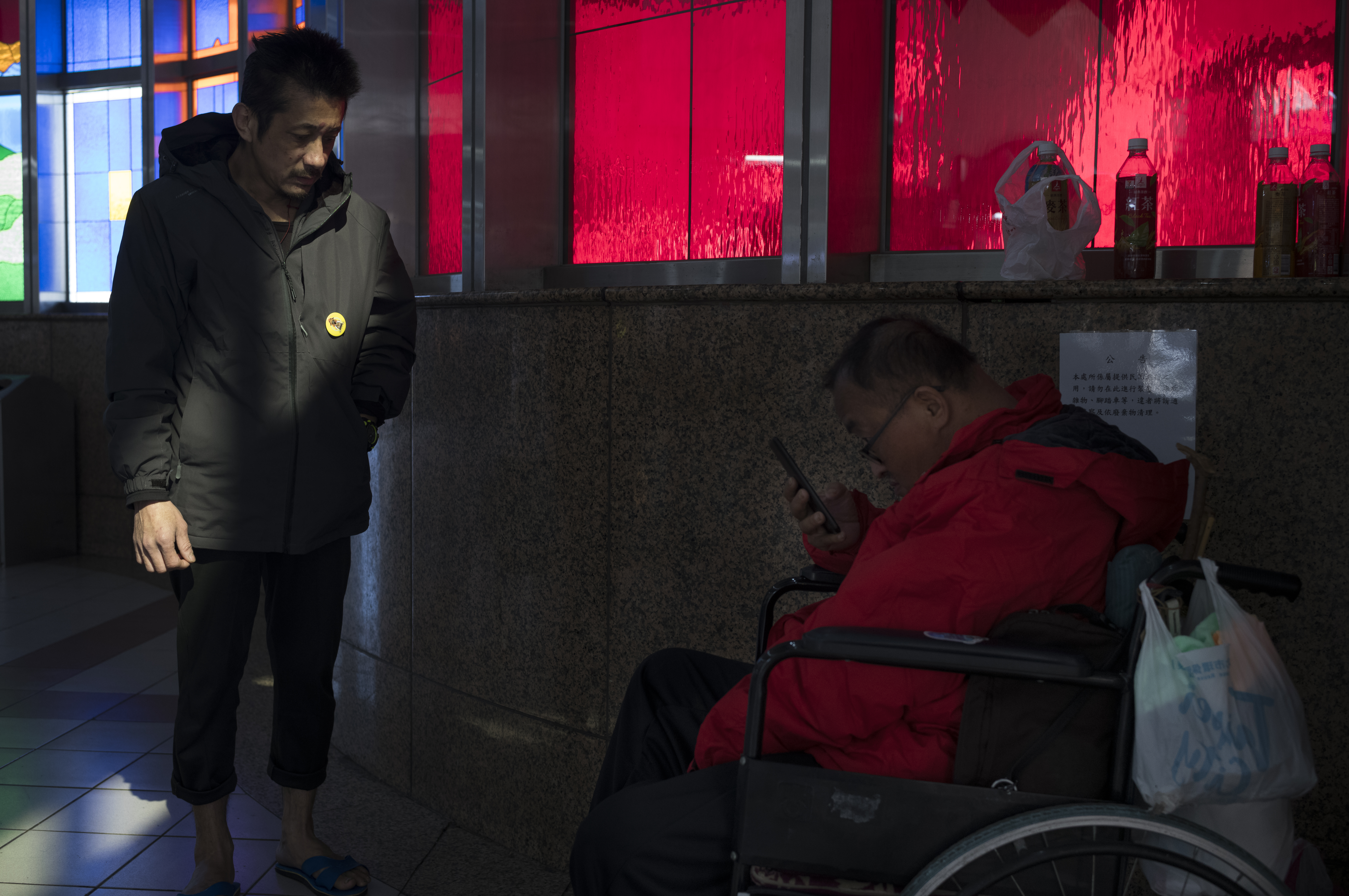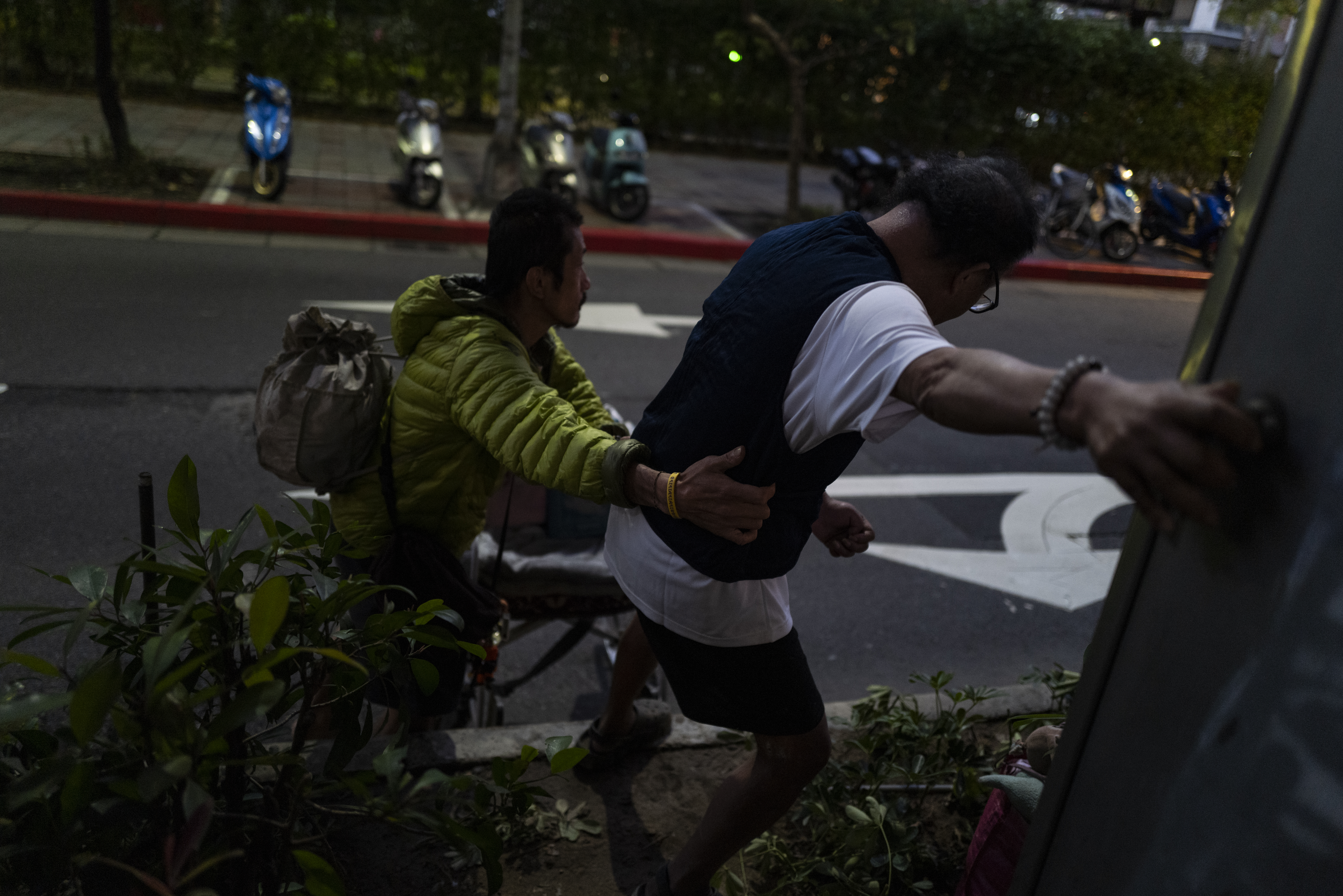 2018 年,因為經常光顧附近一家網吧,老闆聘用了他們做夜班管理員,讓他們晚上毋需露宿。但疫情期間,網吧倒閉。禍不單行,2020 年阿成中風,從此要坐輪椅出入,日常生活需靠阿強照顧 — 上下床、坐輪椅、去廁所。阿強其實是個無微不至長照人員。他有時會去廟會巡遊打工,賺到錢就買阿成喜歡的食物。