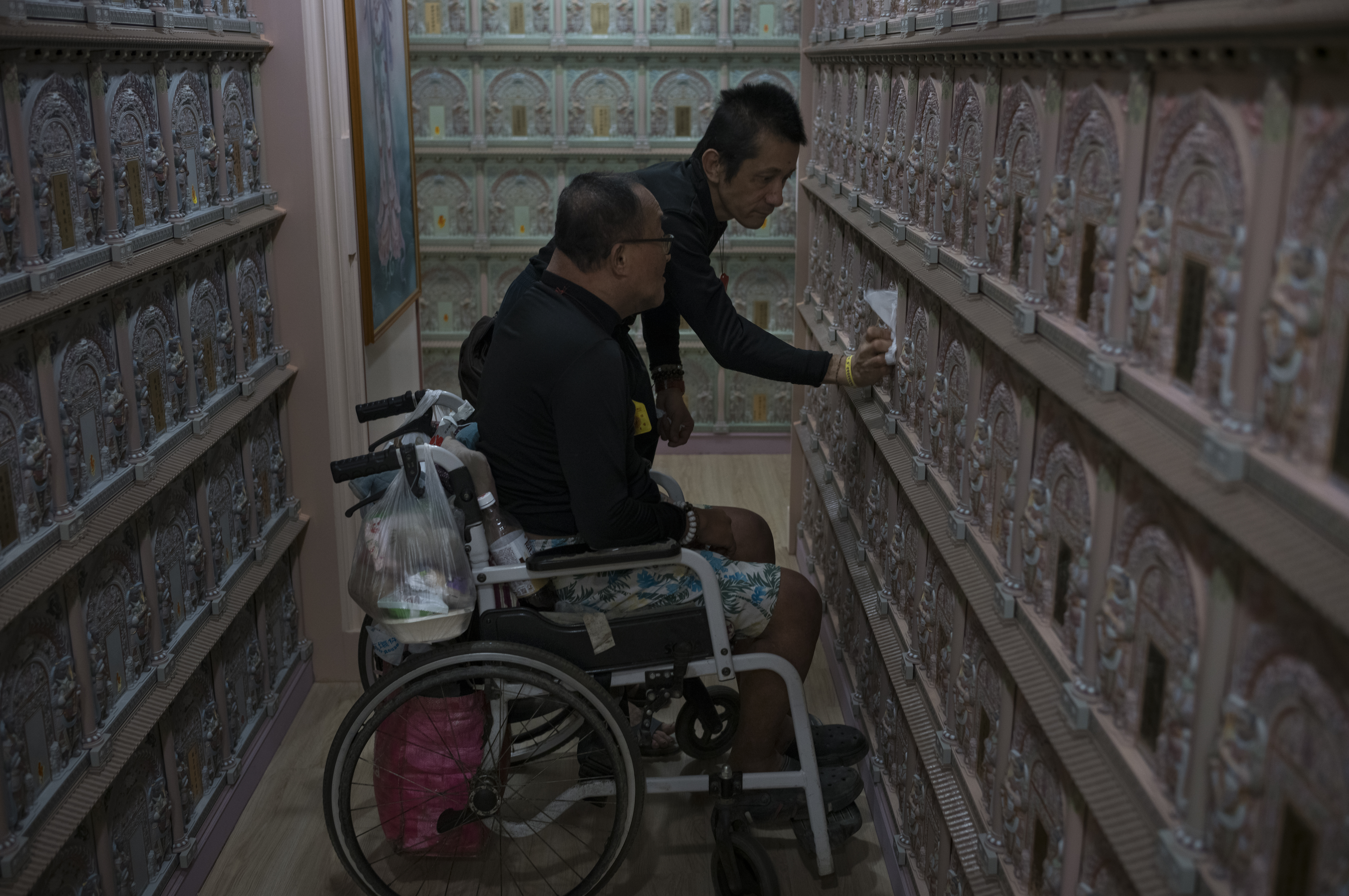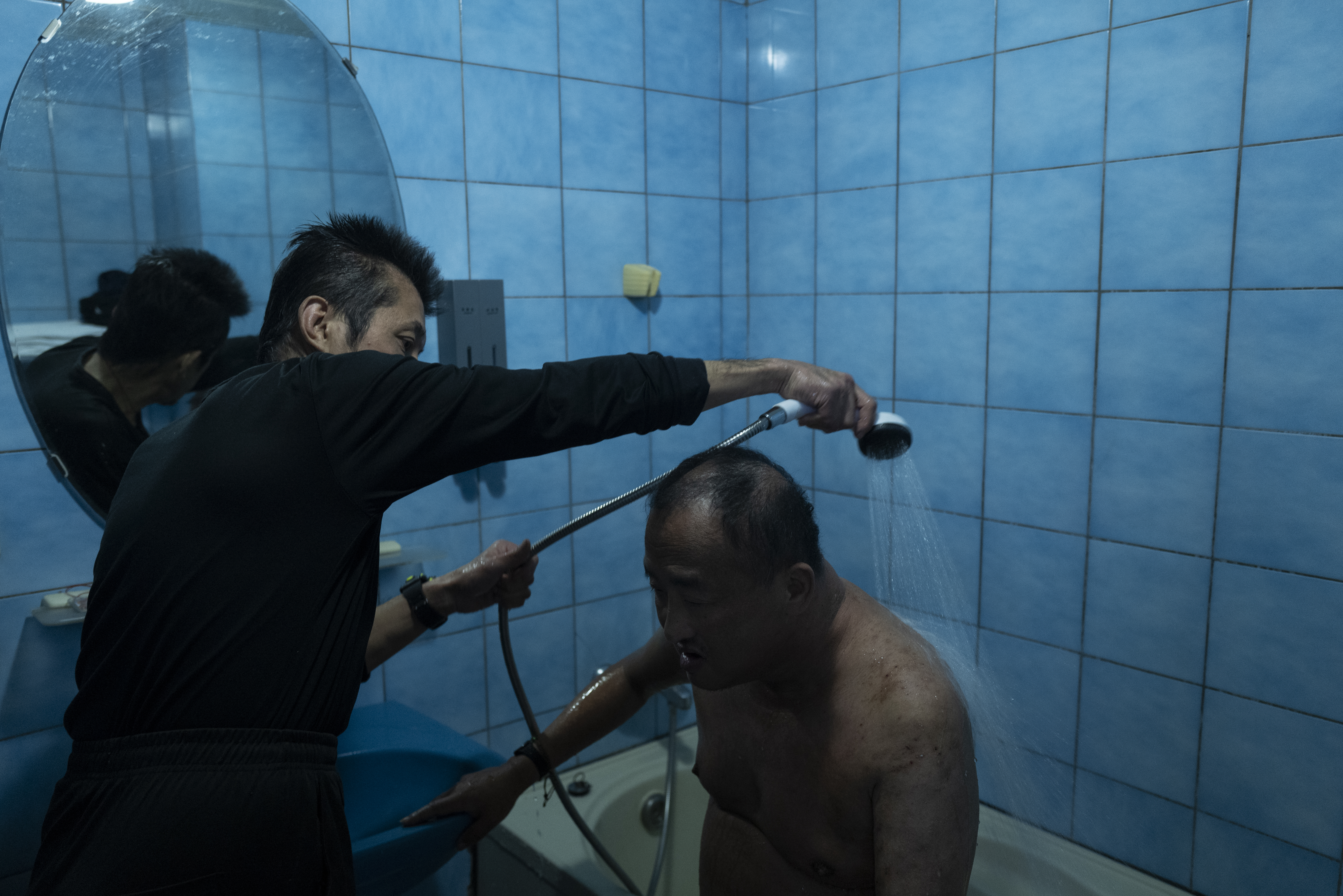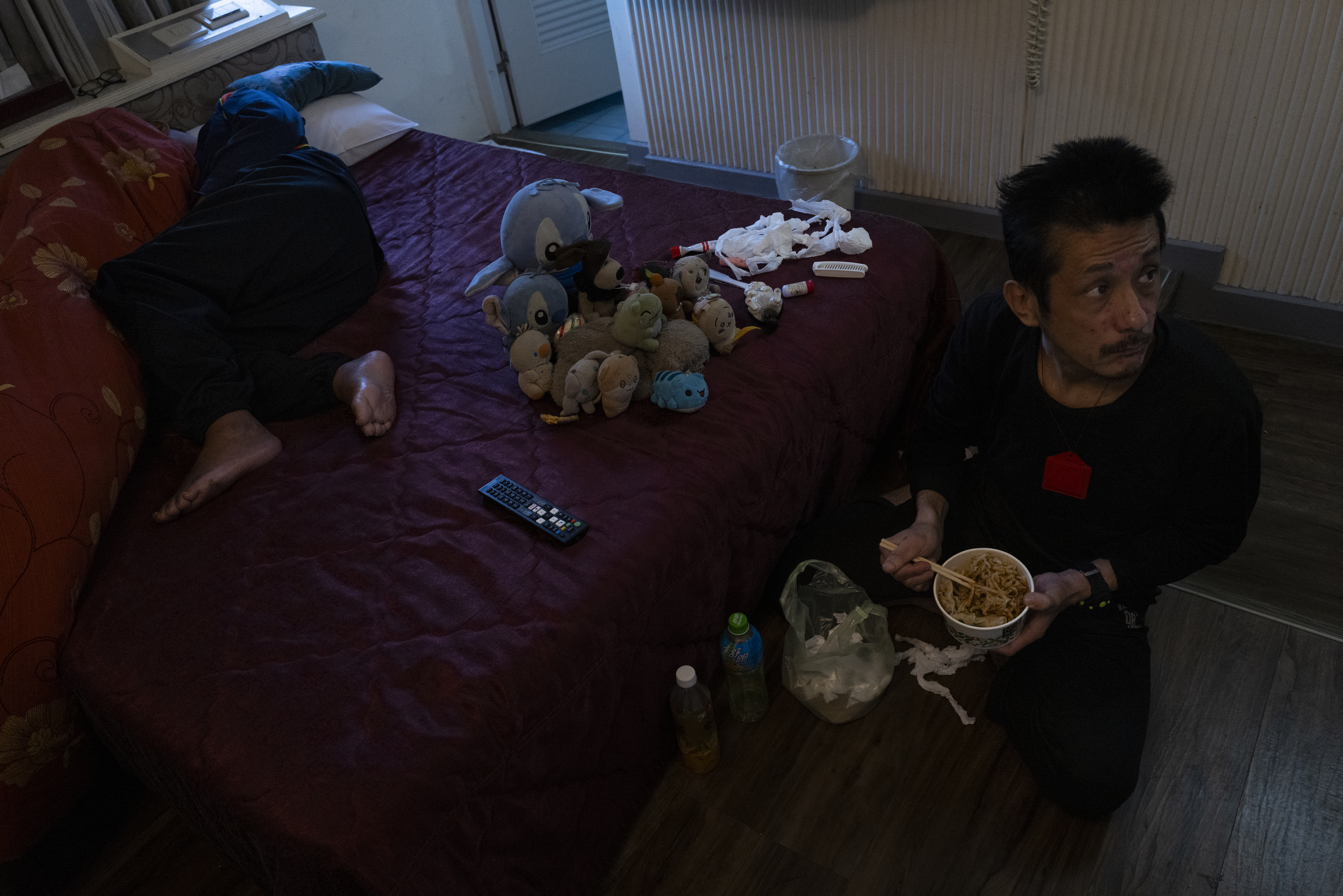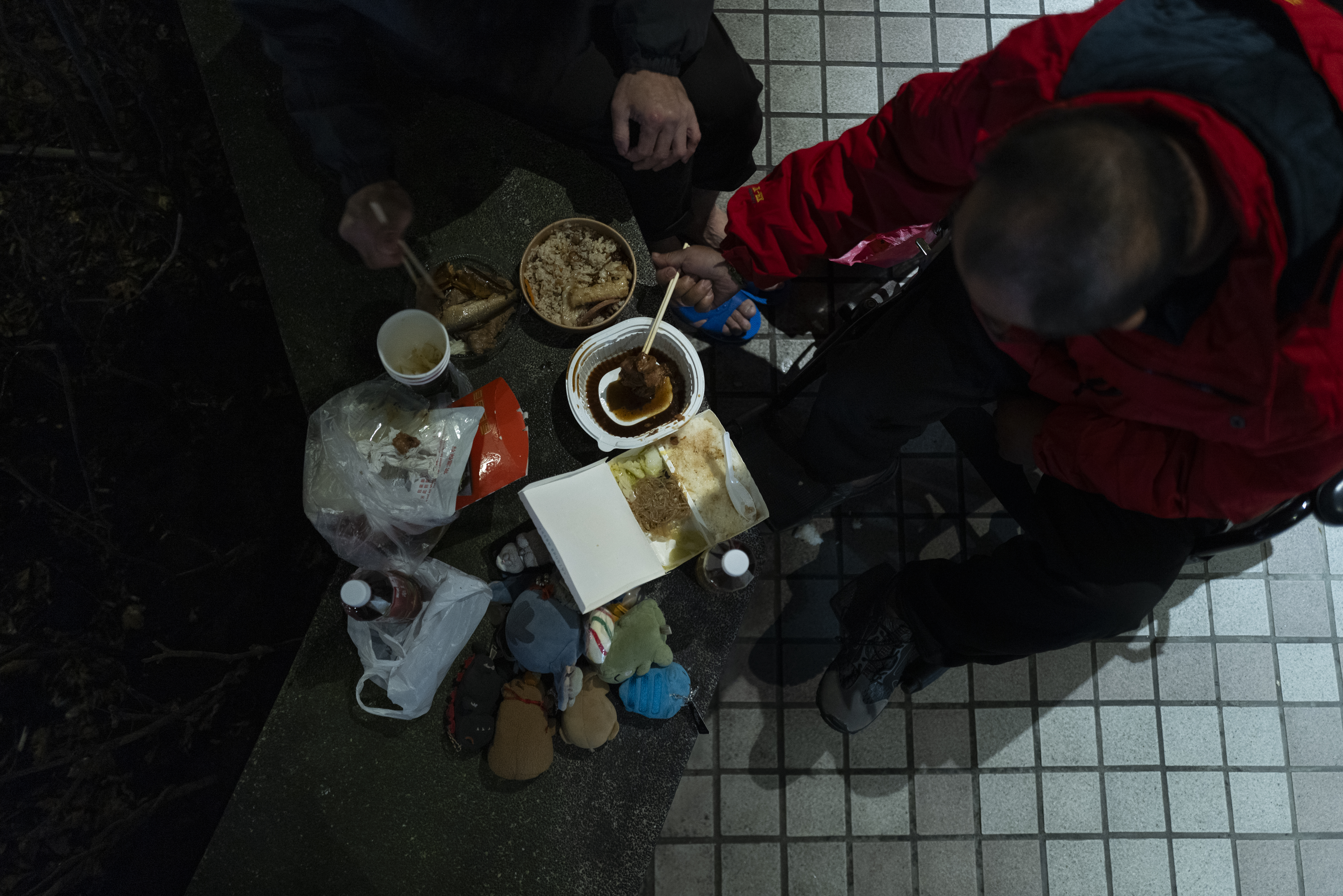 2018 年,因為經常光顧附近一家網吧,老闆聘用了他們做夜班管理員,讓他們晚上毋需露宿。但疫情期間,網吧倒閉。禍不單行,2020 年阿成中風,從此要坐輪椅出入,日常生活需靠阿強照顧 — 上下床、坐輪椅、去廁所。阿強其實是個無微不至長照人員。他有時會去廟會巡遊打工,賺到錢就買阿成喜歡的食物。