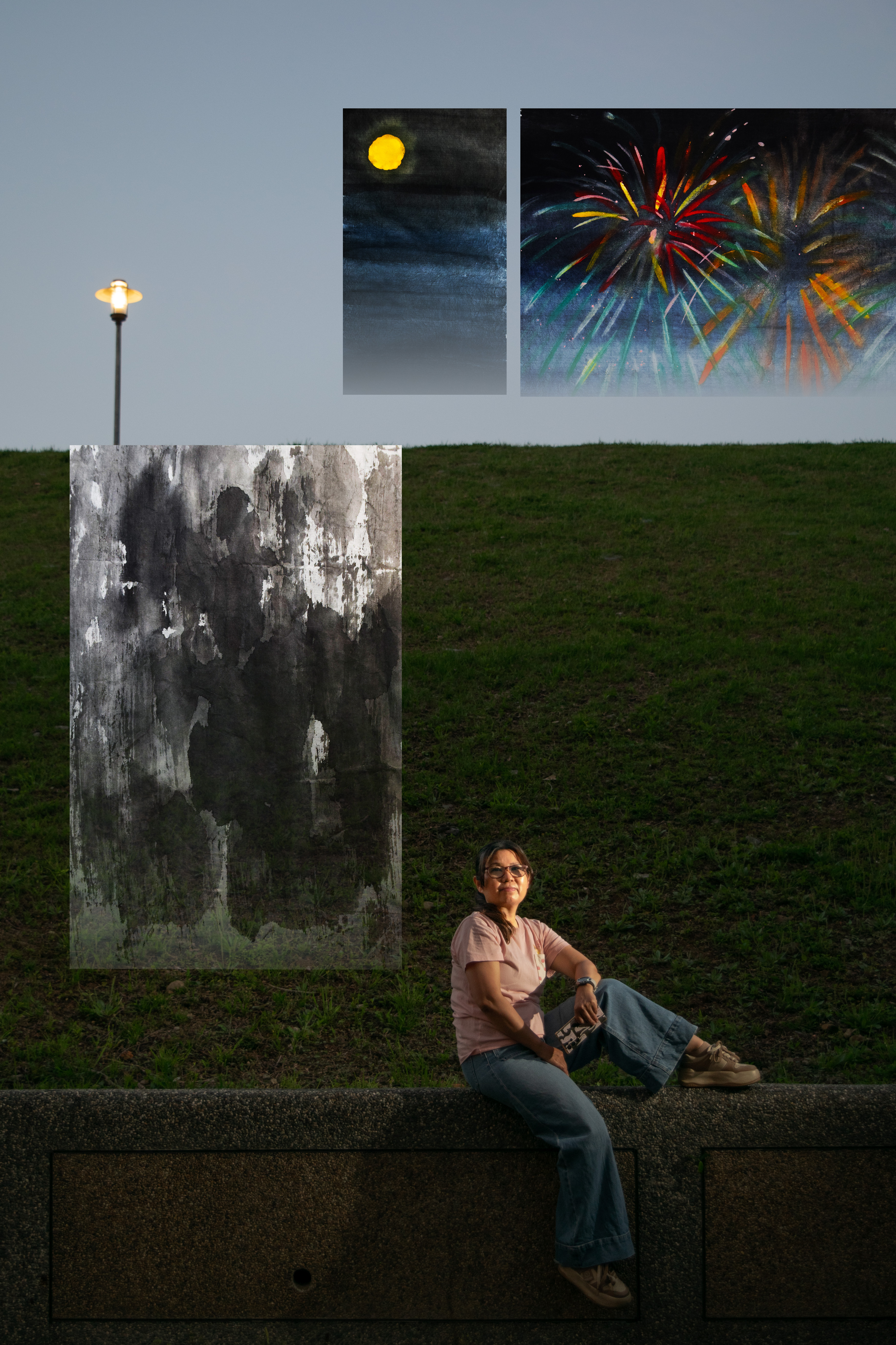 拍攝完畢時已過黃昏,河堤邊的路燈亮起,橘黃色的光芒襯著灰藍色天幕。我靜靜地聽她談著過往回憶,眼角餘光不時瞥見河堤上方移動的黑影。