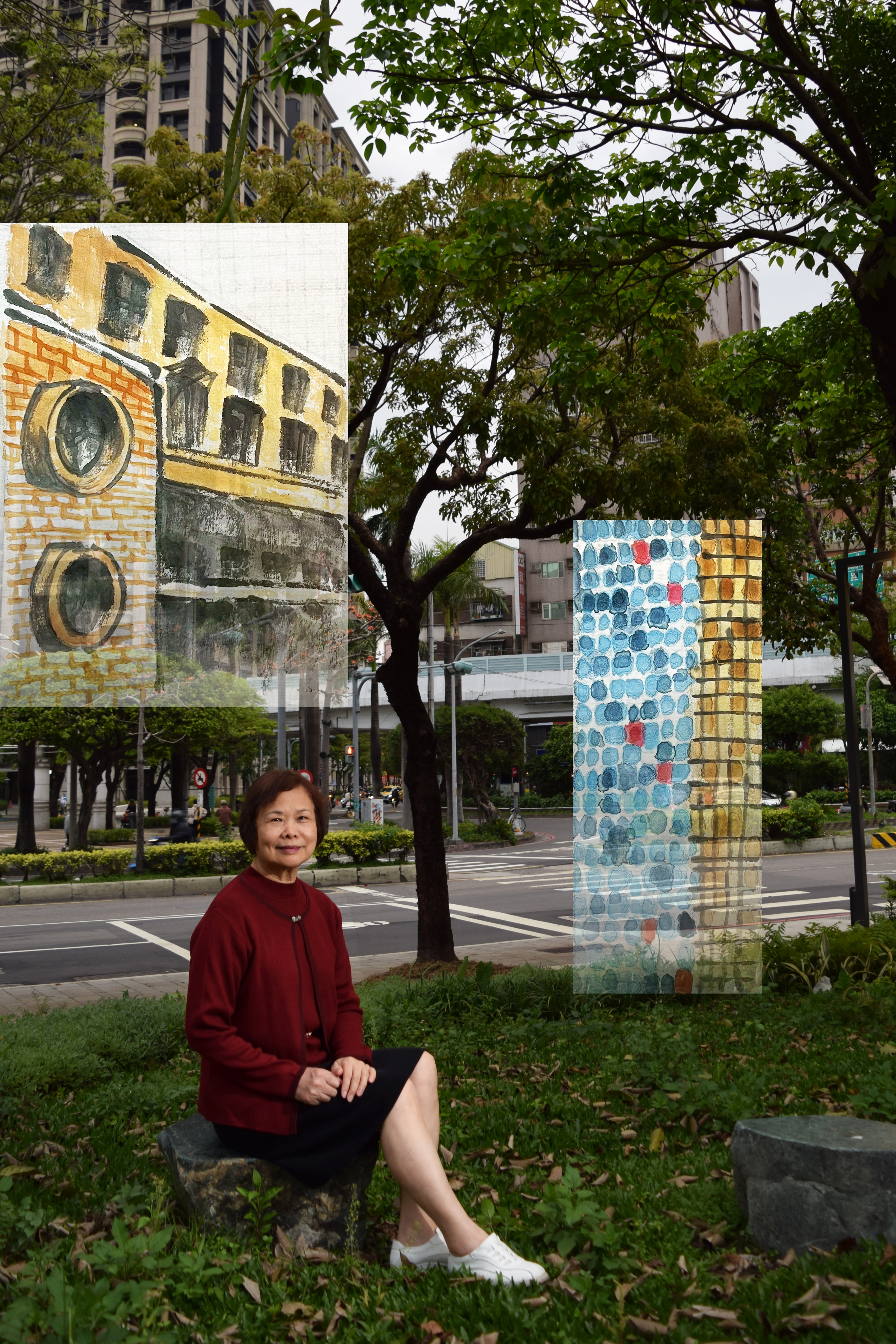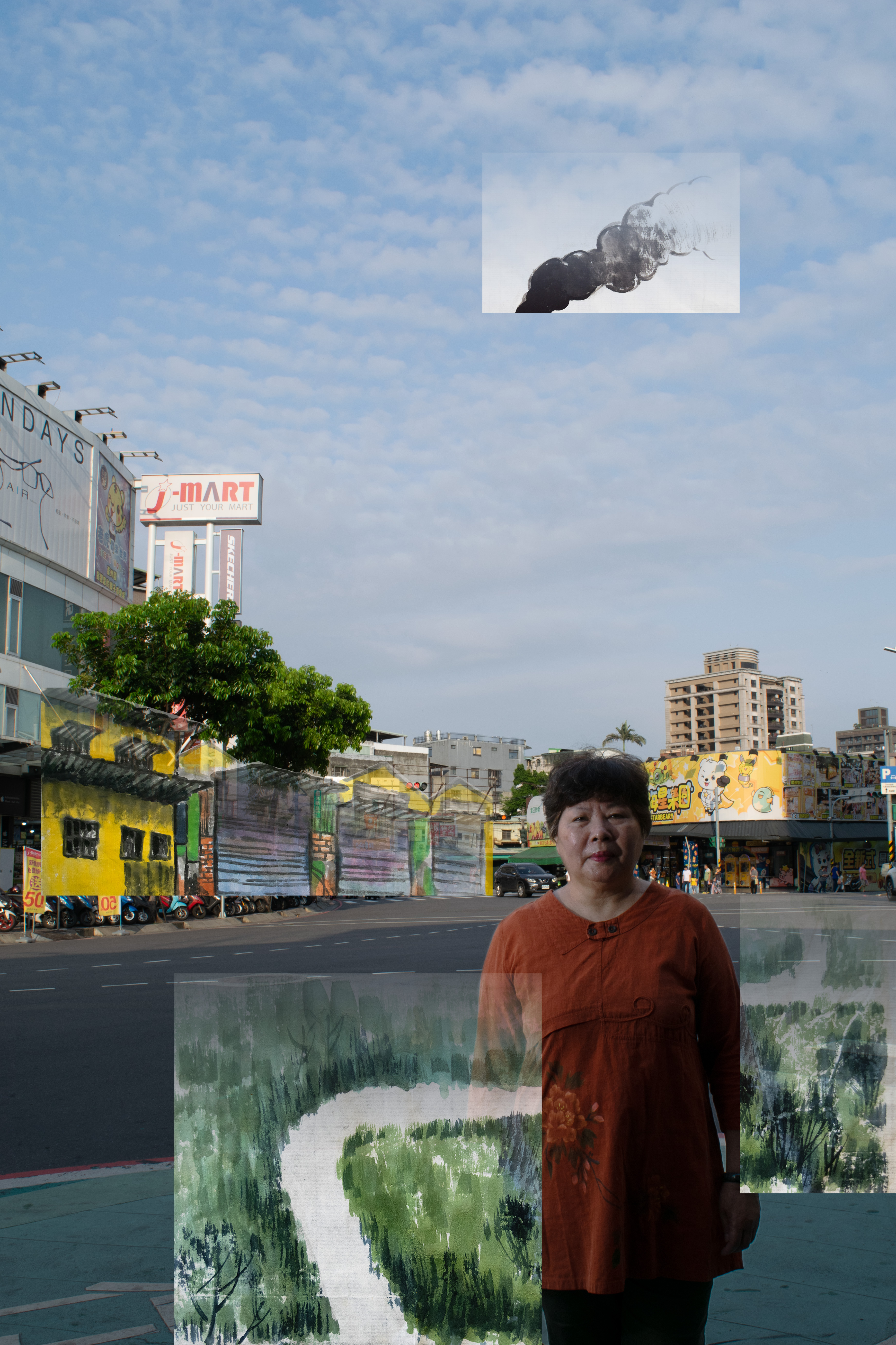 拍攝當天是假日下午,街上充滿逛街吃飯人潮。為了以現今最熱鬧的商圈地帶為背景,我們在一處人來人往的連鎖商店前反覆調整位置與等待。陳小姐話語中那曾充滿田地與荒地的地區,與當天身處的景象形成強烈對比。