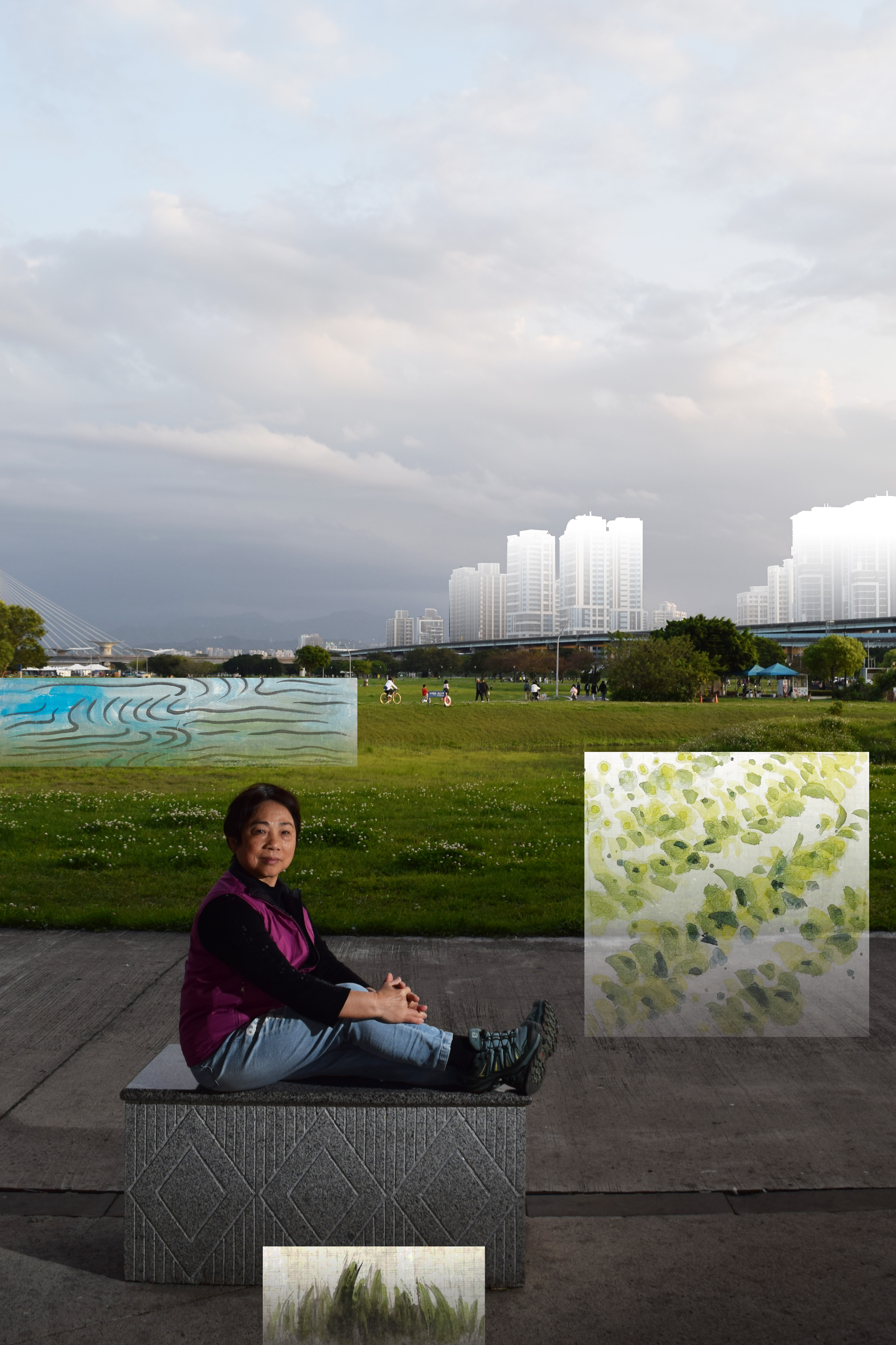 拍攝這日適逢兒童節,大都會公園擠滿了前來參與活動和遊玩的家庭。我與岩小姐邊聊天邊穿越擁擠人潮,在一處高架橋下的空長椅上拍攝。後方奔跑的孩童與腳踏車在畫面中迅速移動,似乎也應證了人與水共存的痕跡。