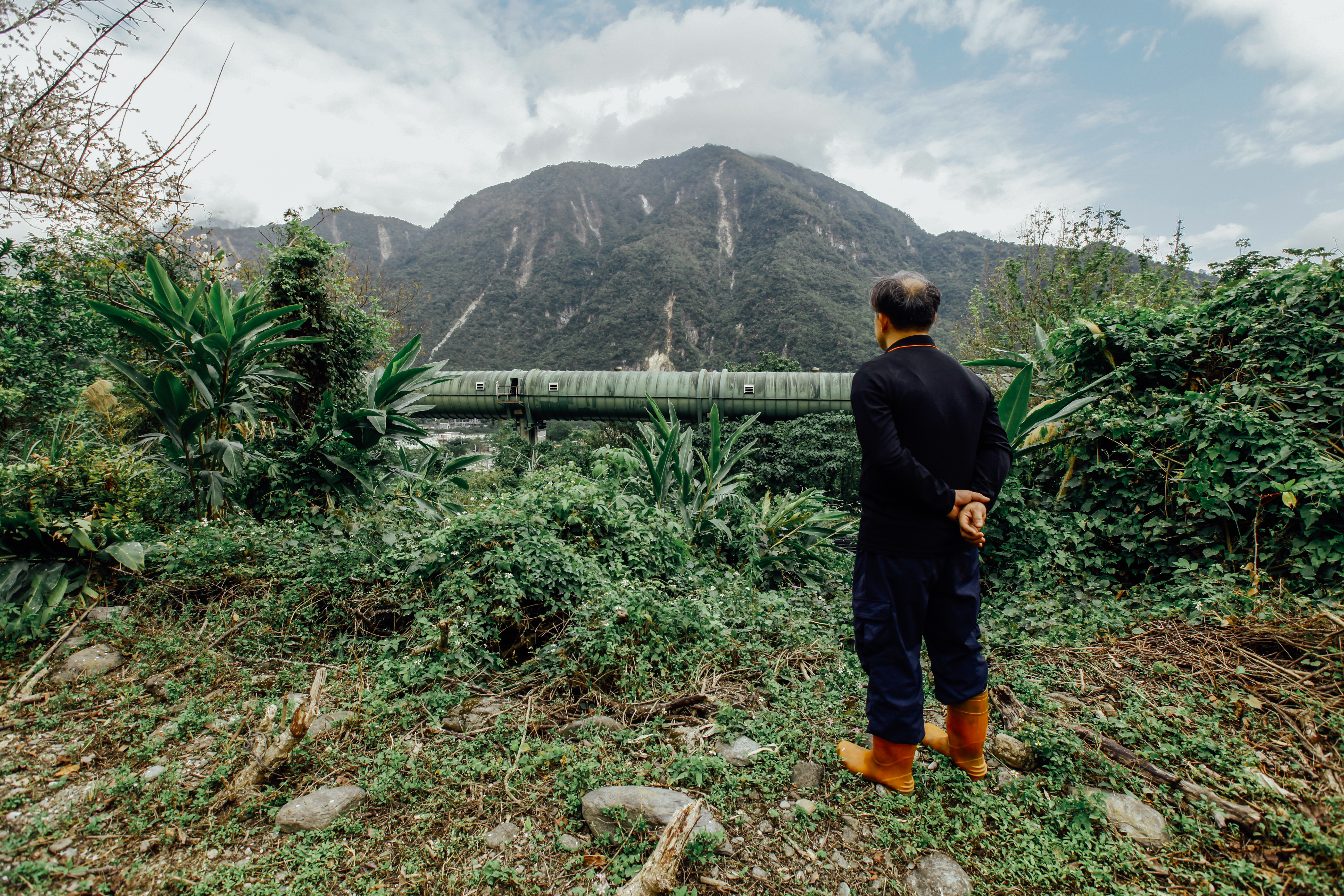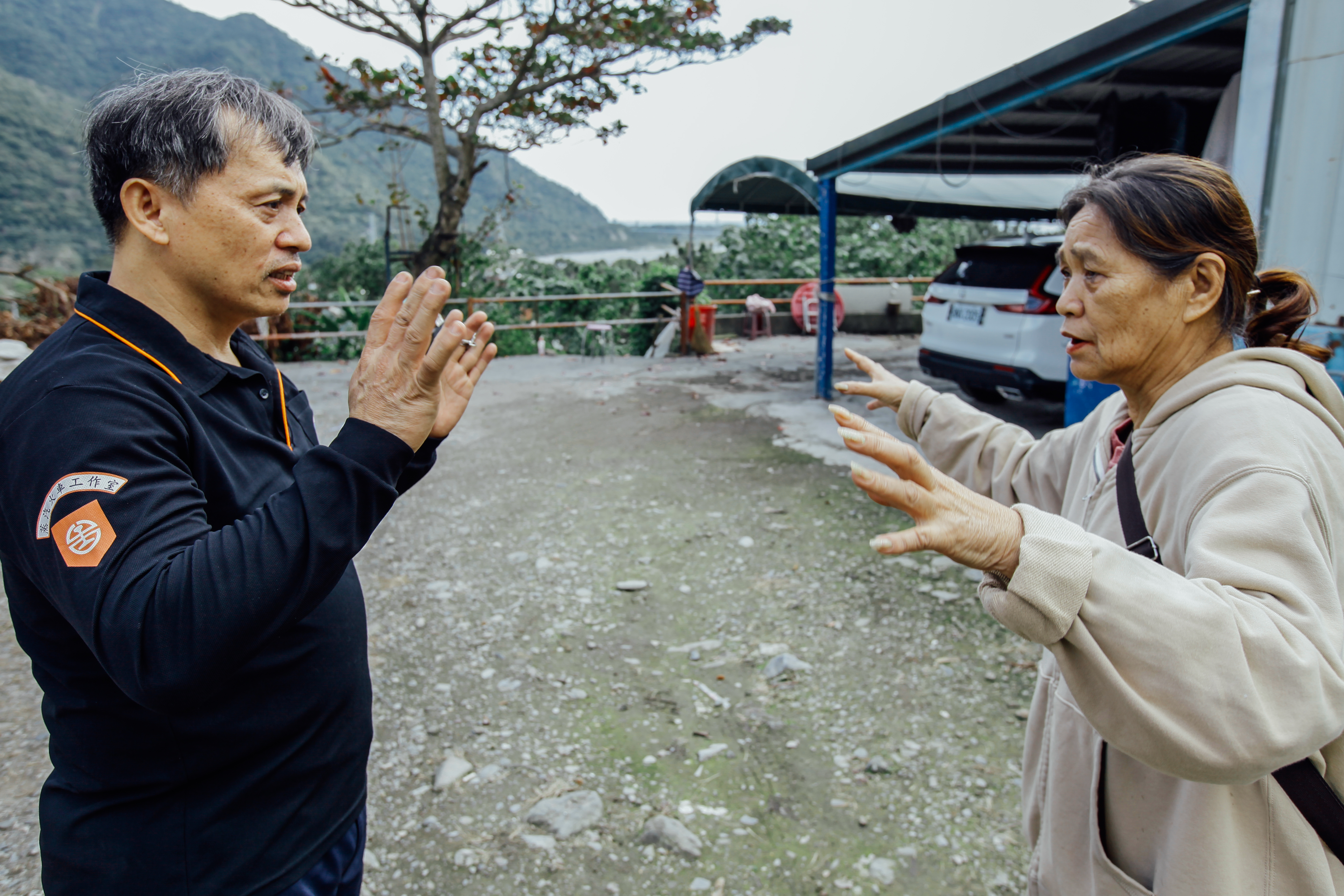 車停在山下的活動中心,隨後步行而上,這裡需要熟人領路。Buya 是礦區土生土長的 Truku 族,曾參與多次「土地返還」運動,也關注礦場居住安全。這次地震後,採礦爆破對山體的影響更受關注。