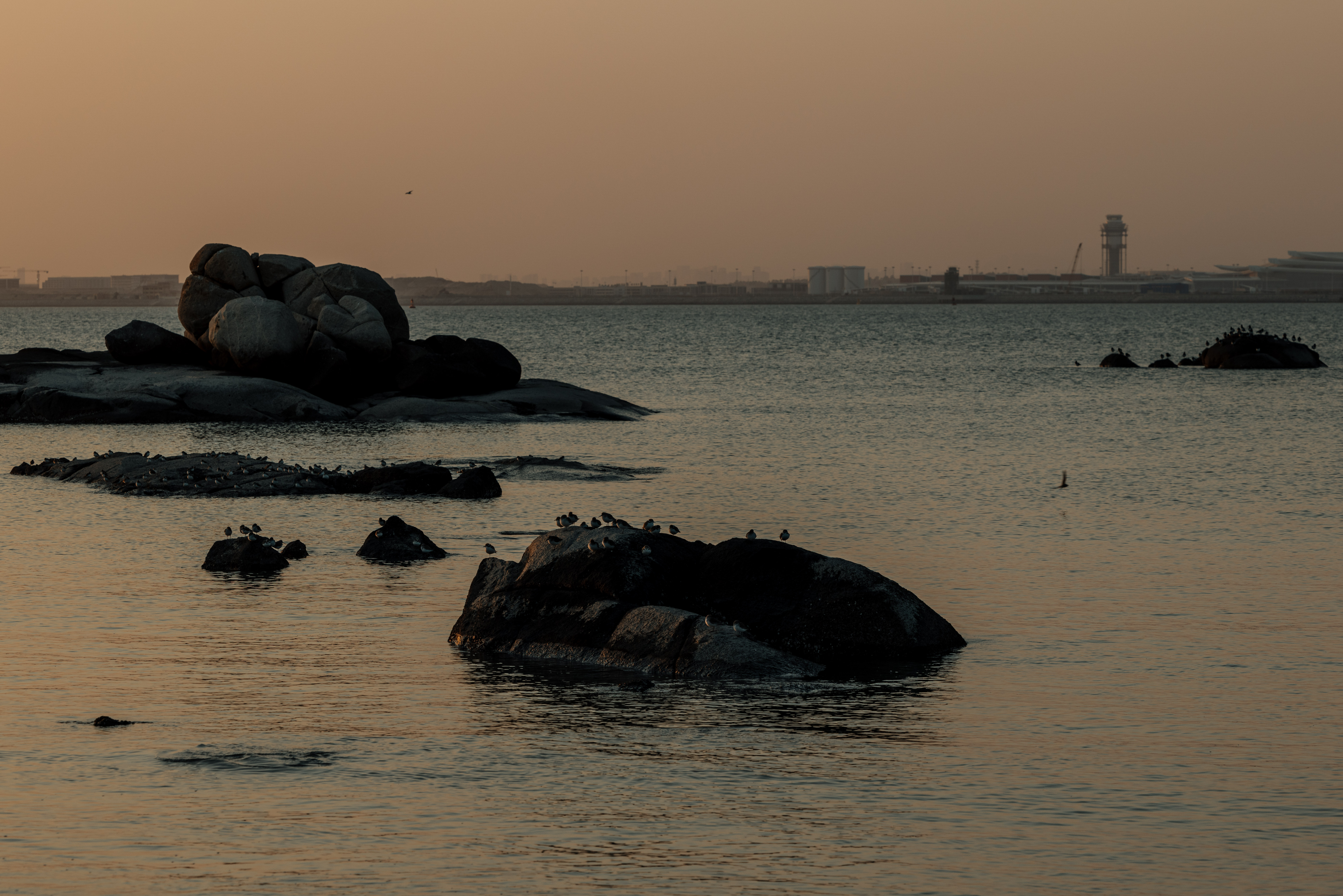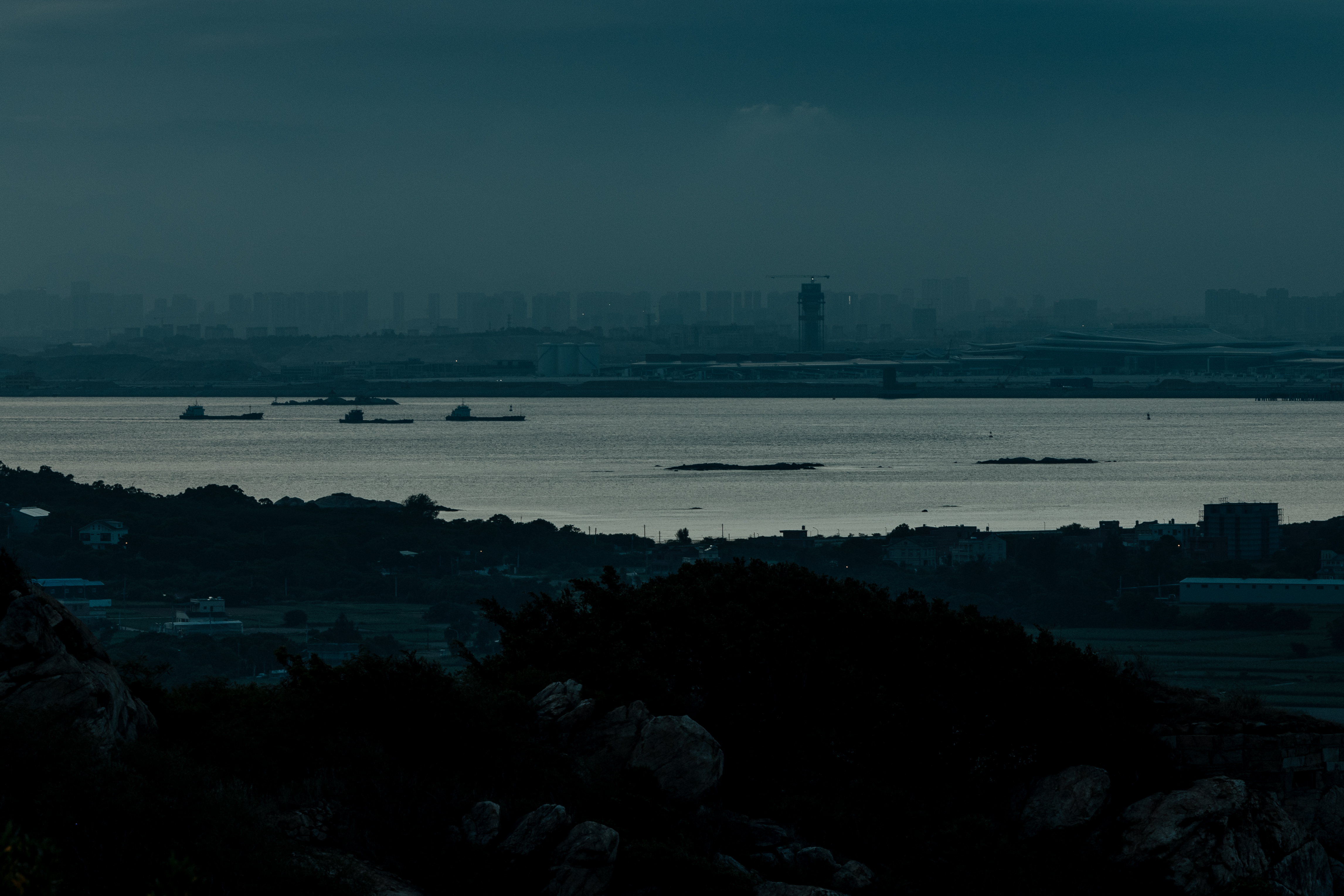 對岸海岸線的變化,在幾年間清晰可辨。層層堆起的土方連成新的地形,羽翼狀的屋頂鋪展其上,輪廓逐漸完整,像是一條正在形成的邊界。改變如此劇烈,卻又異常安靜。