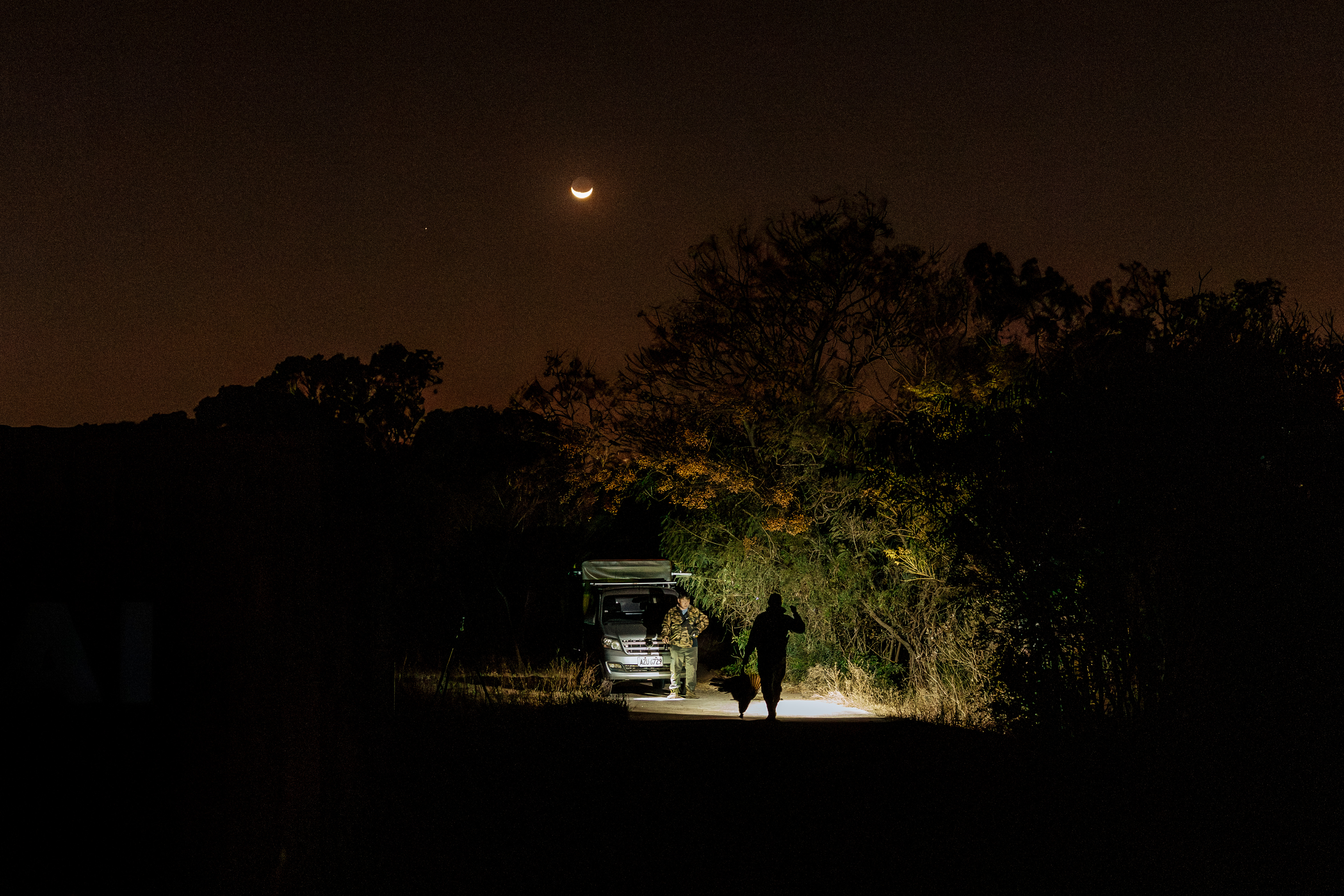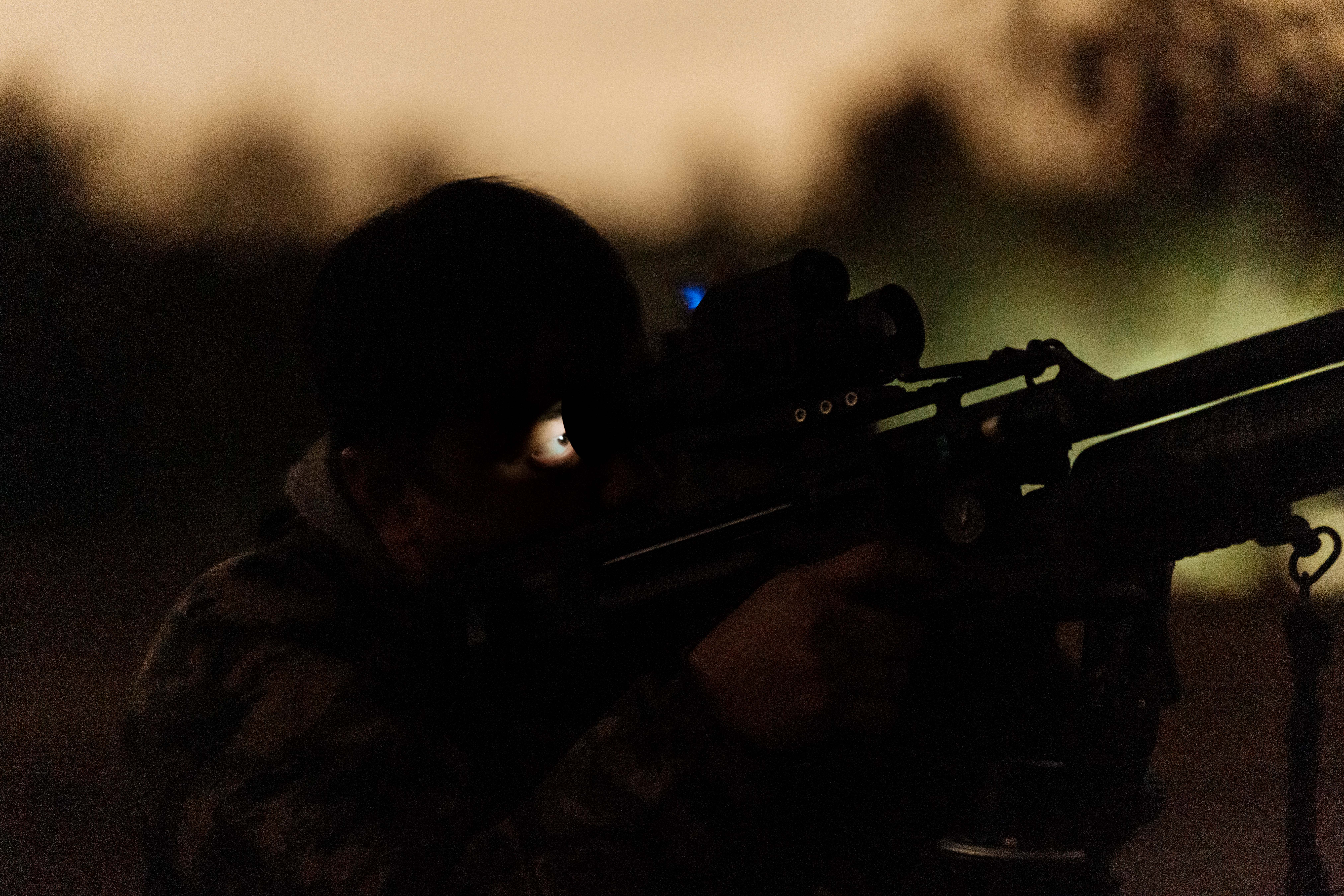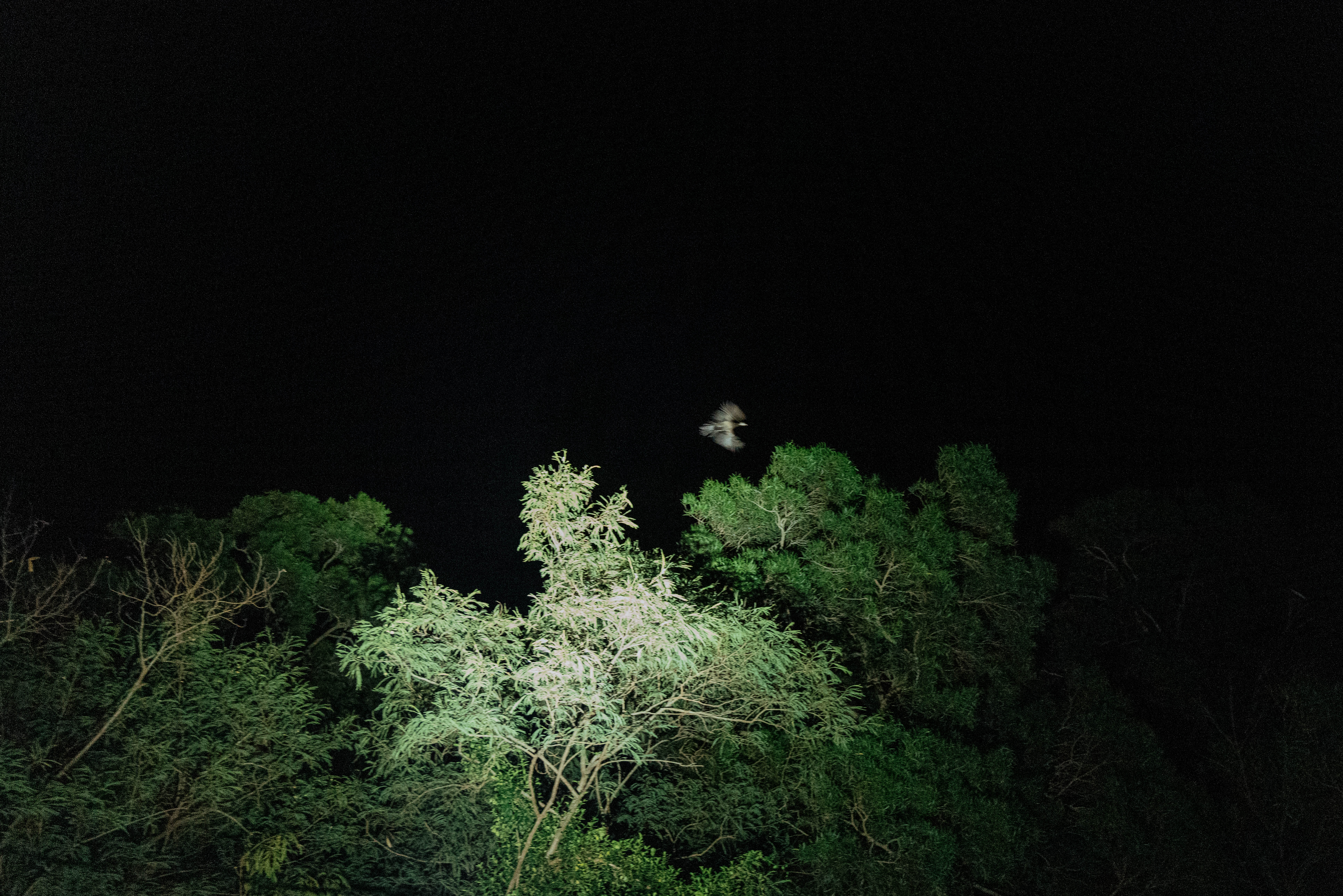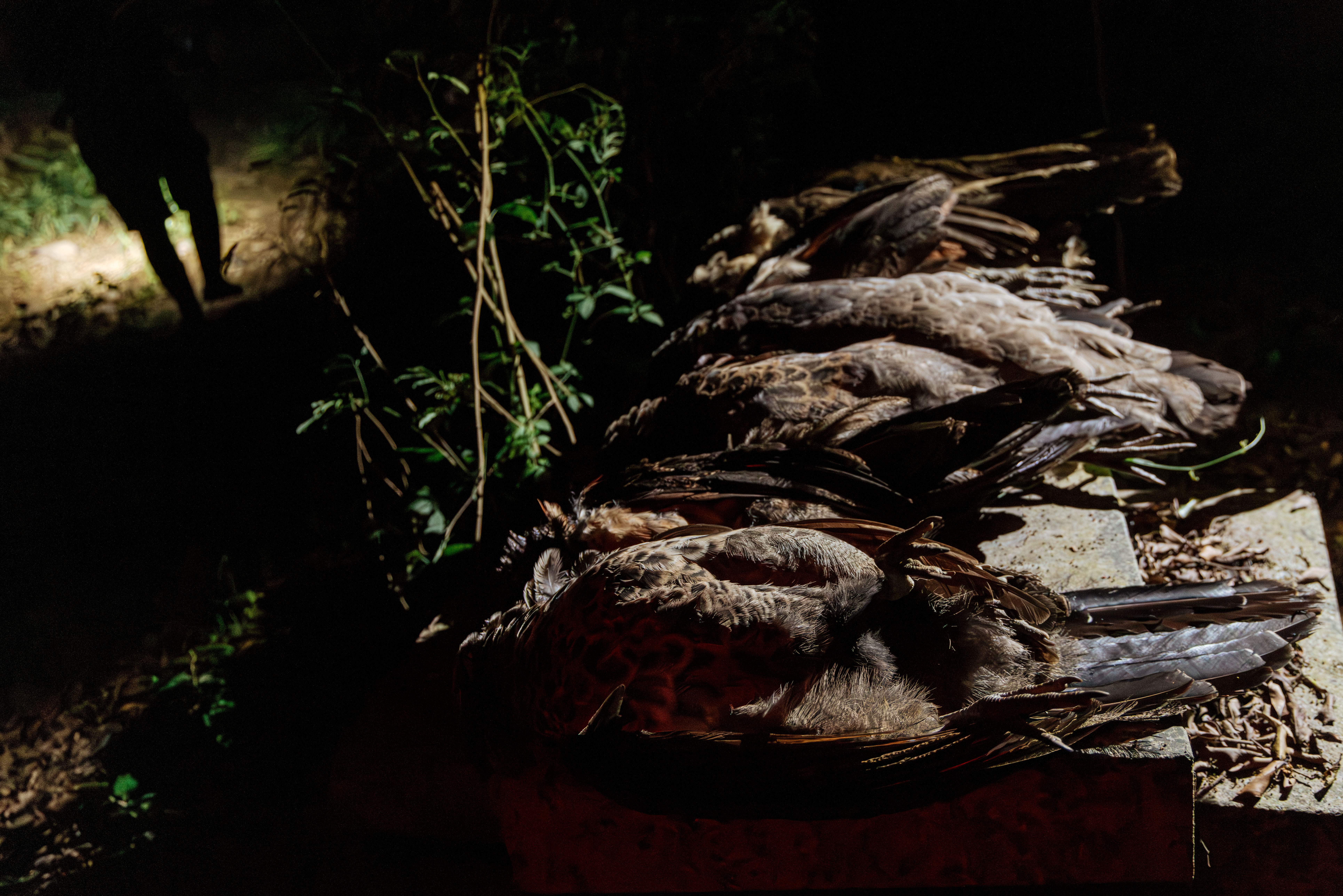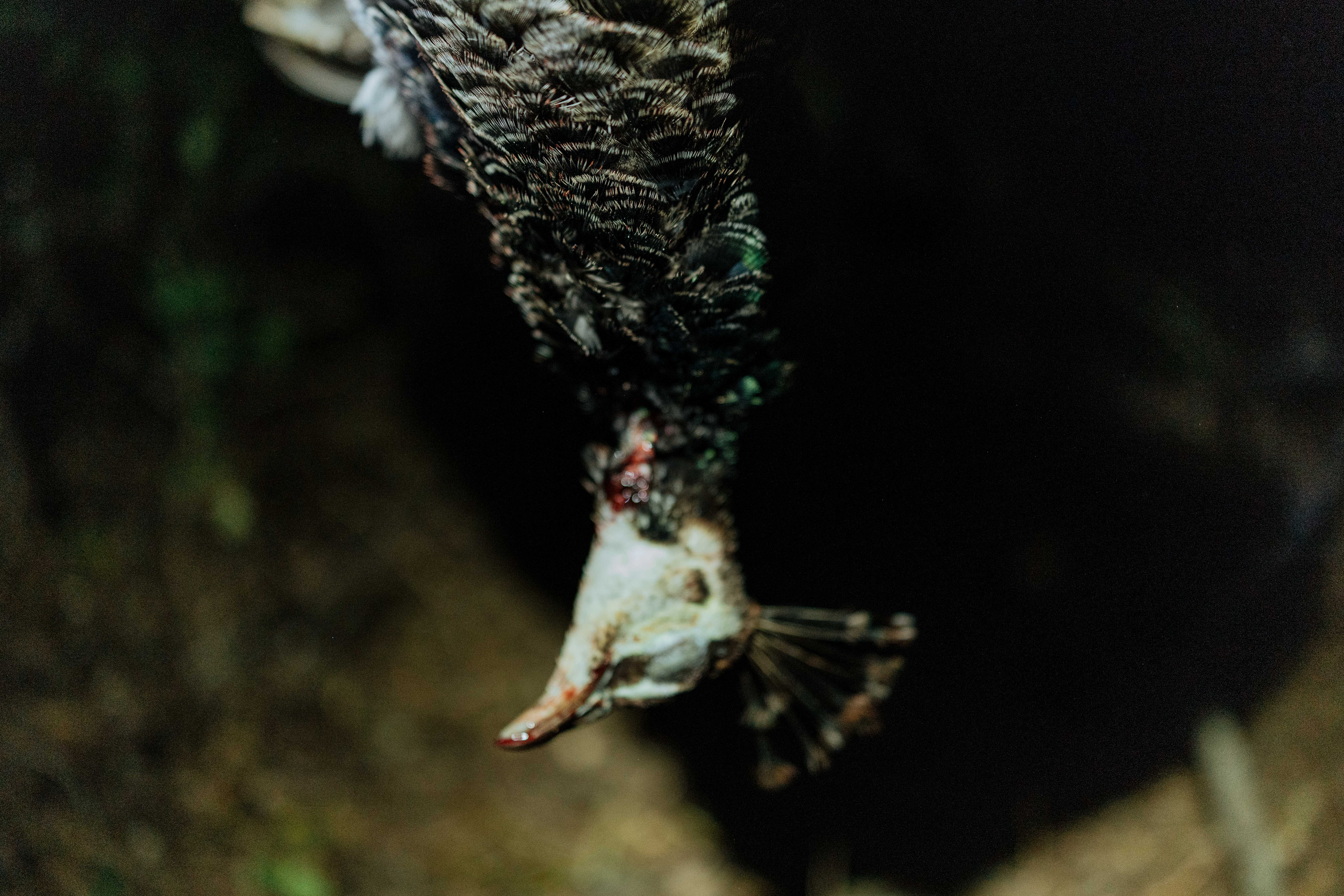「第一次去打,什麼都看不到,拉弓瞄準的時候會有一個孔,要對到準心。」夜晚的叢林,聖祺抬著手臂,瞄準半天,「我最後有點隨便,大概瞄到,就放出去,結果還真的把孔雀打下來。」