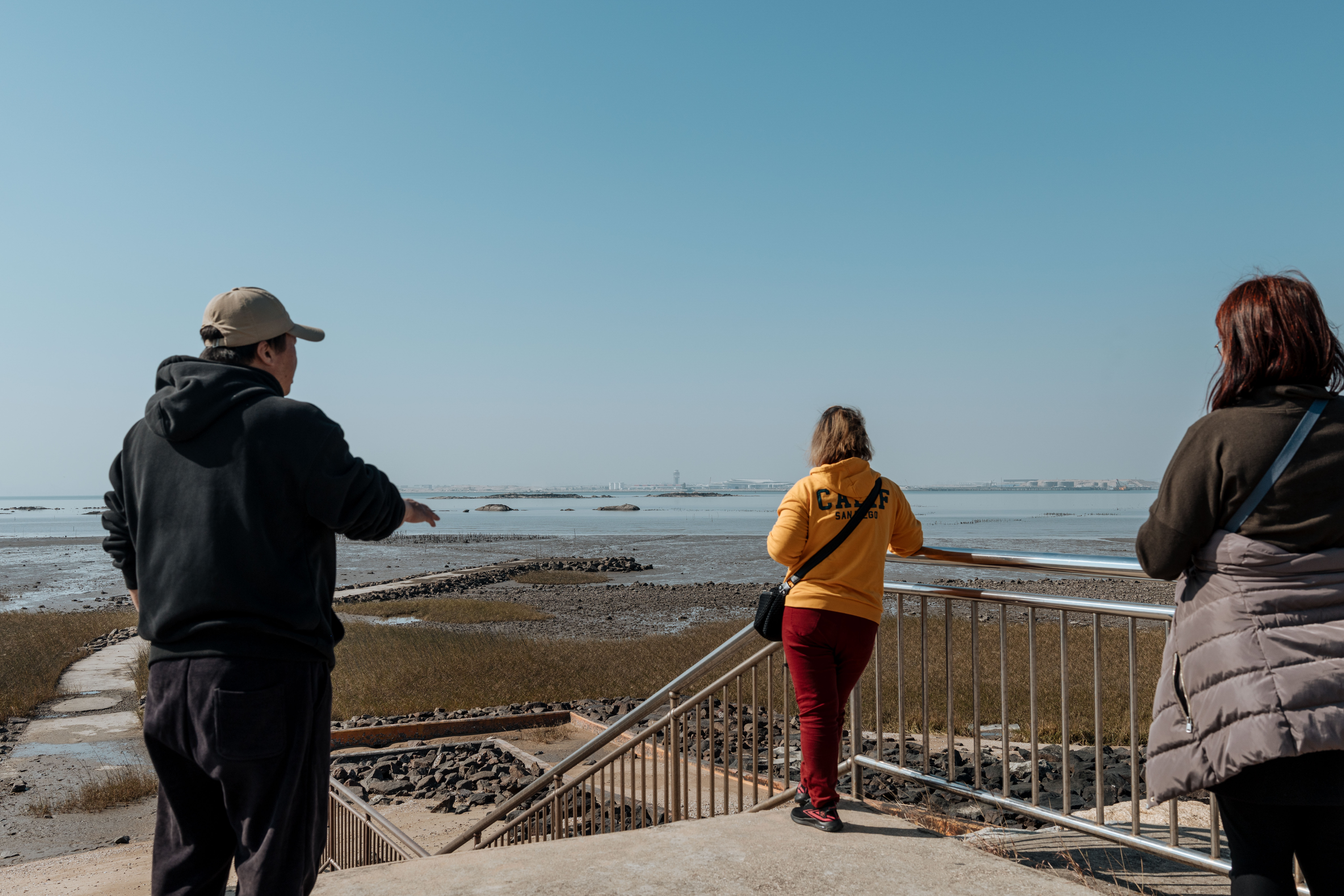 一輛黑色九人座箱型車駛來,停在官澳馬山三角堡堤防邊,車上走下一群觀光客,看起來像是家族旅行包車遊,新鮮的注視這一切地景,在地導遊生動的筆畫著,招呼大家望向對岸。