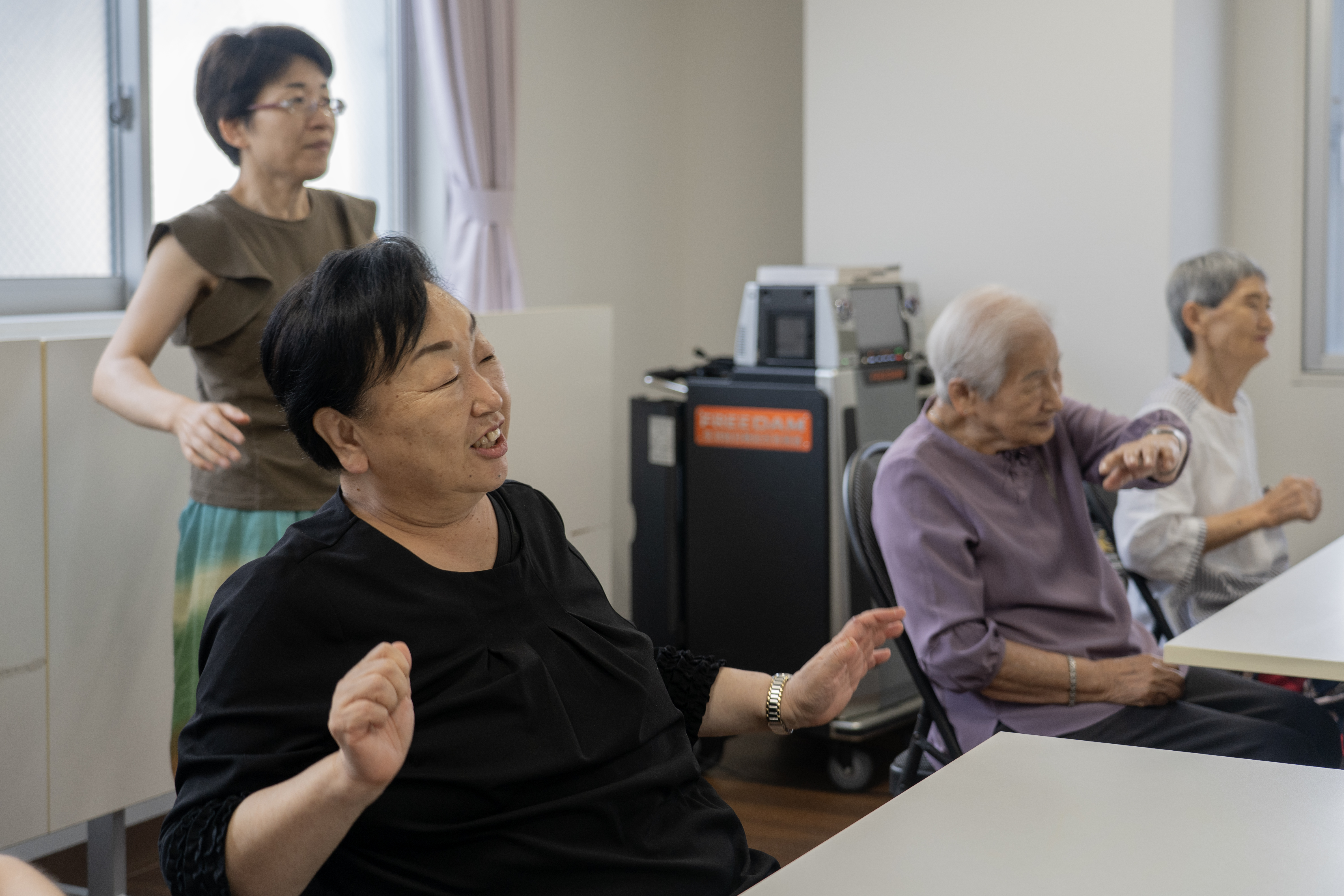 1989 年,金正姬因為想學歌舞與杖鼓來到川崎市交流館。那是她第一次踏入這個空間。多年後,結婚生子後的她帶著女兒再次參加活動,回想初次造訪的場景仍歷歷在目:「2006年我來的時候,現場有五、六十位阿姨們聚在一起,放著那種韓式快節奏的音樂,『滴滴滴滴』的節奏,大家邊唱邊跳,甚至還有人表演呼啦舞。整個氣氛熱烈得讓我嚇一跳。」