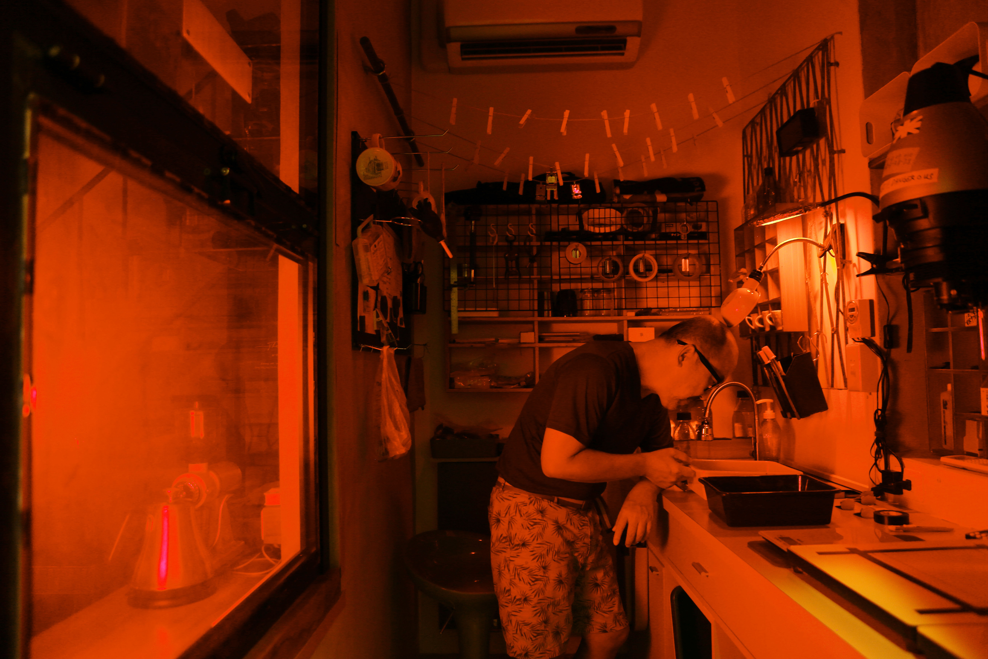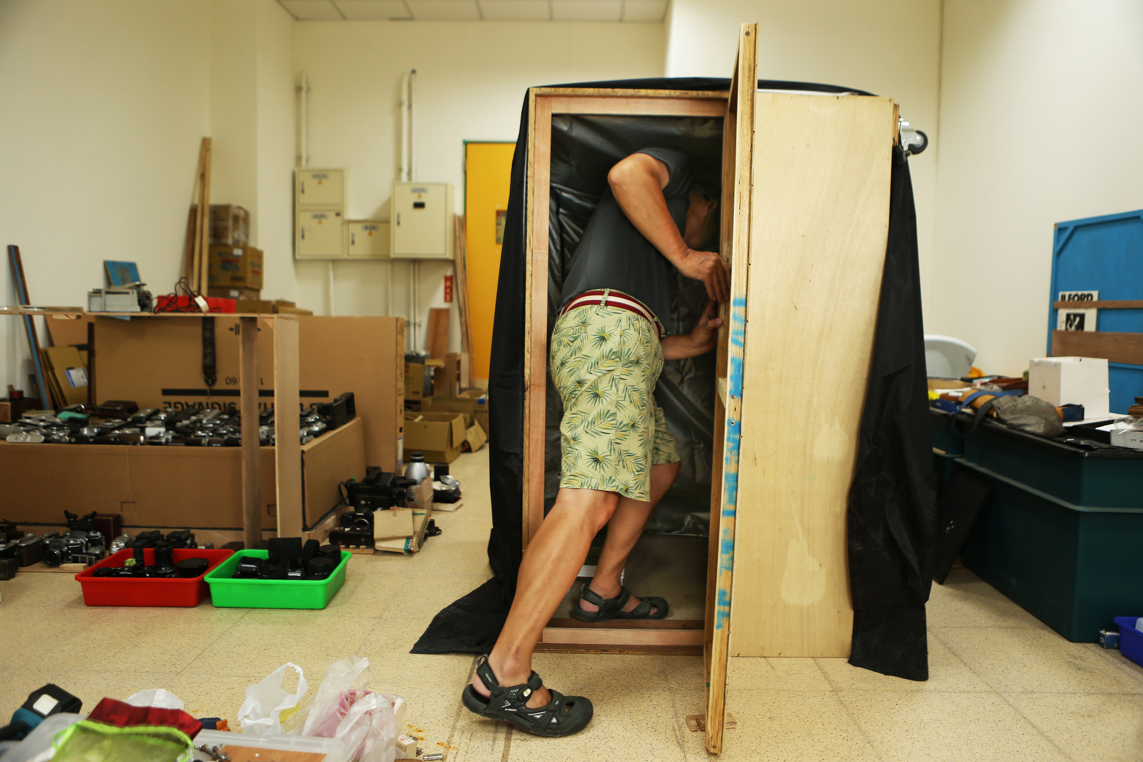 早在國二時,管憶華就對針孔攝影產生好奇。他最早的啟發,來自於課本裡面蠟燭透過小孔,在暗箱裡產生倒影的「神奇」現象。他當年曾用紙鞋盒製作暗箱,雖然實驗從沒成功,但這件事成為他持續創作的原型,也就是「房間相機」顯像的基本原理。