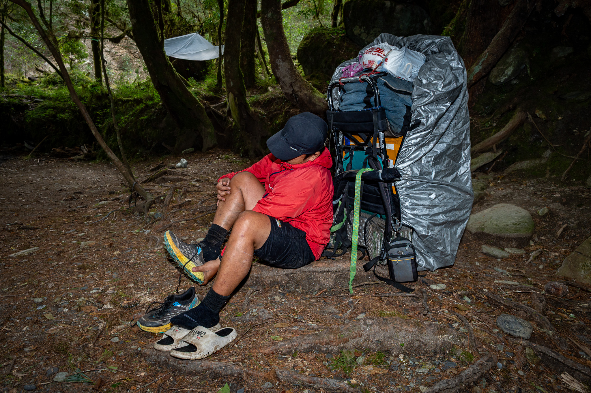 Hundiv (邱耀祖)是台東新武部落的一名協作,他幽默、健談,說話總點到為止,笑聲常在營地裡迴盪。耀祖曾在台北打拚十年,疫情期間父親過世,身為獨子的他選擇返鄉,踏入高山協作這條路。「東部工作機會不多,能選的大多是勞力活。」他說協作雖然辛苦,但收入相對穩定,也讓他看見未來創業的可能。