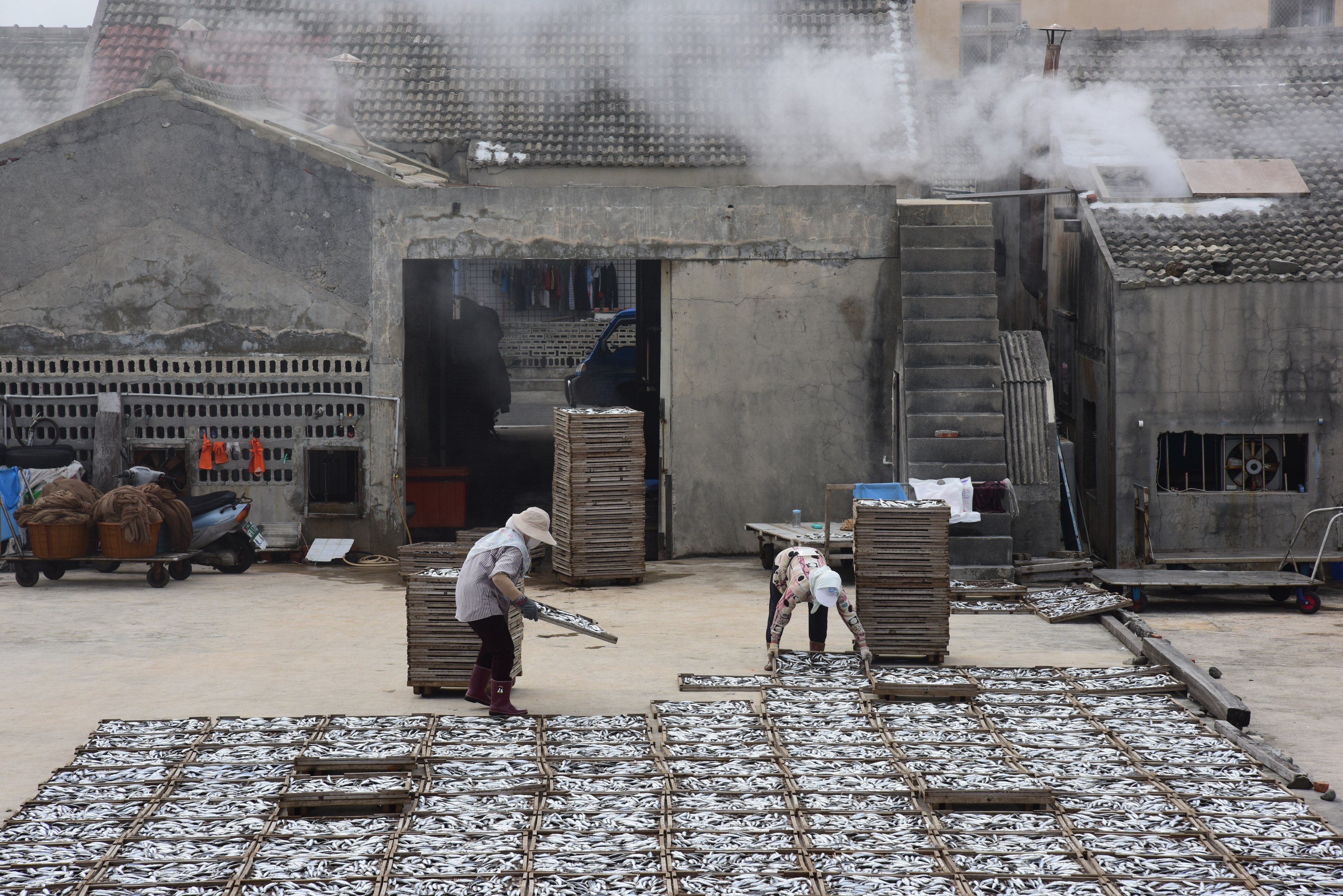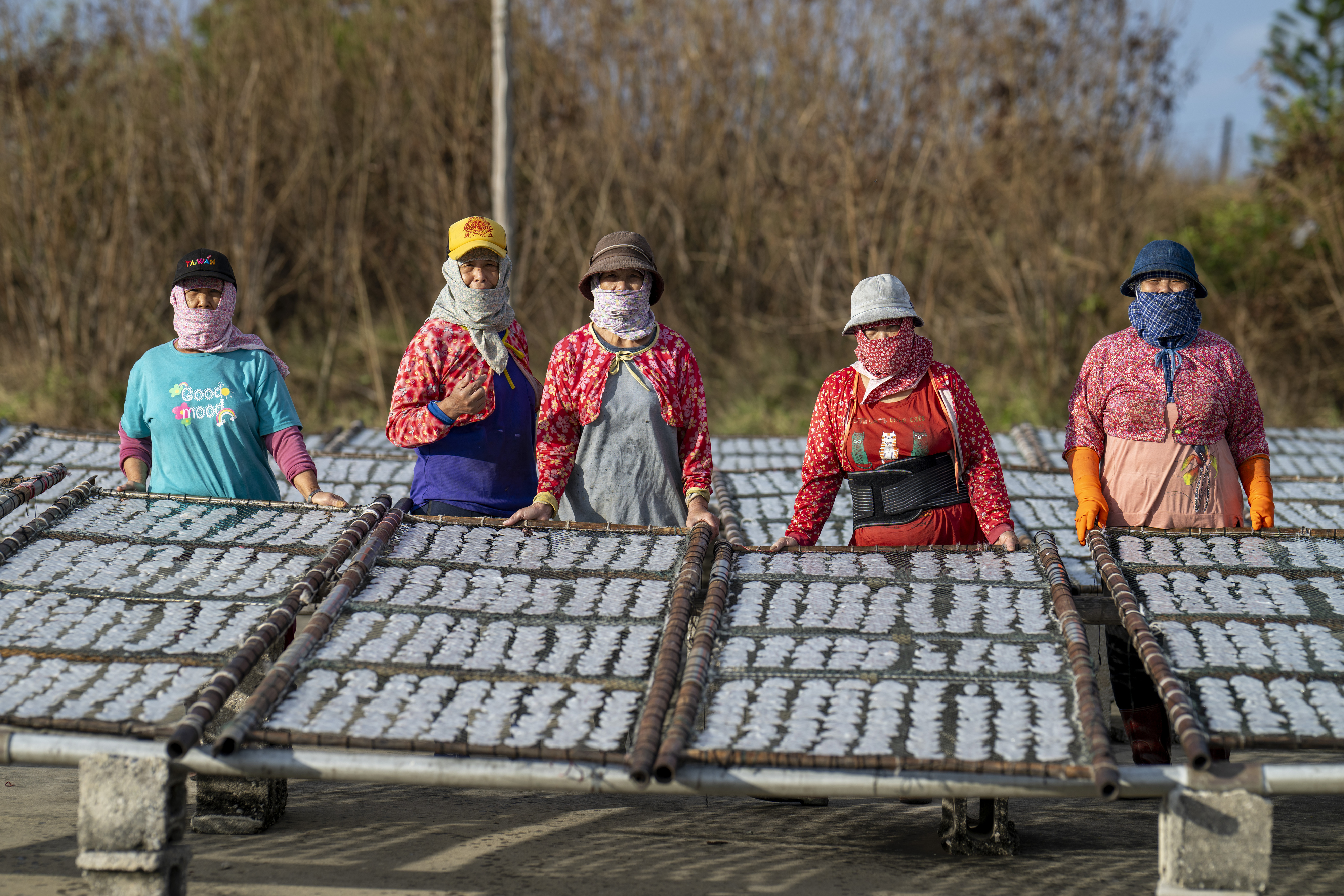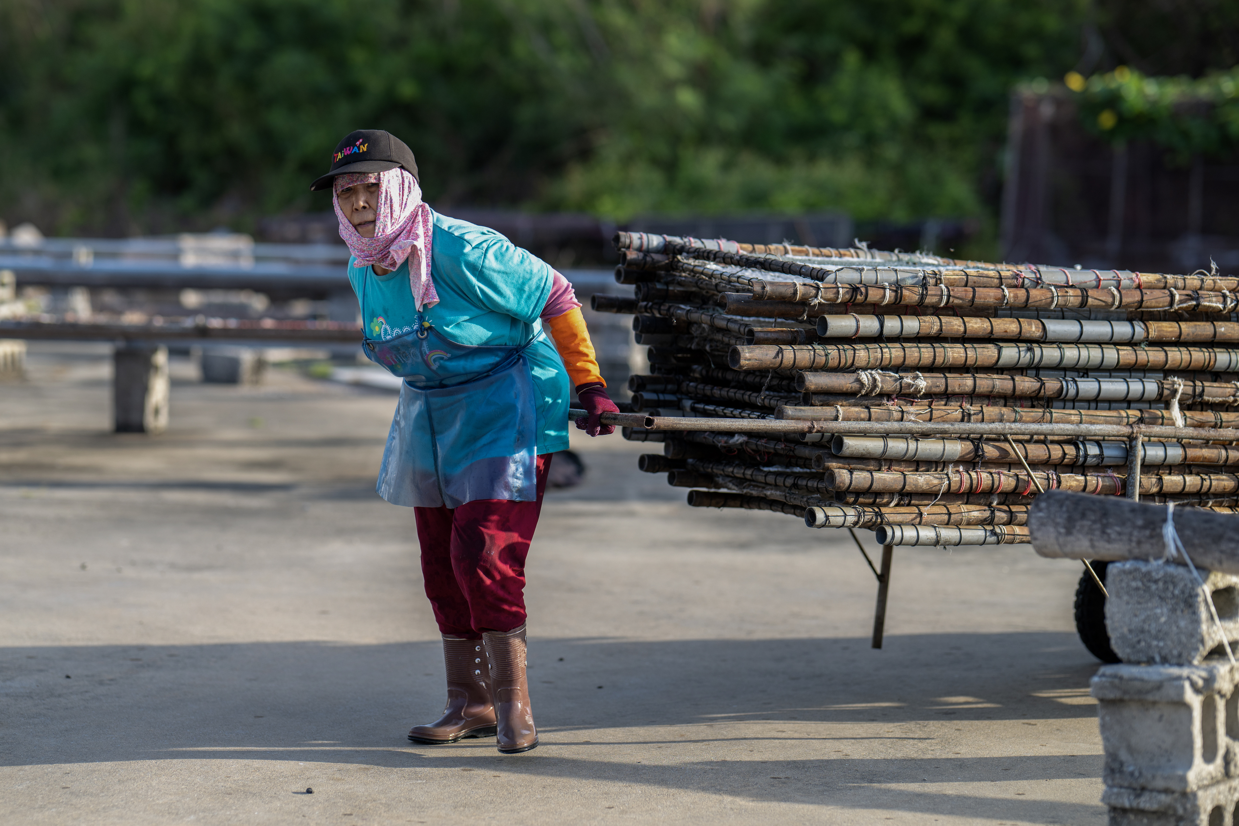 當大家還在熟睡時,女工們與夜相約,準時三點啟動一日的工作活;不分春夏秋冬,一年又一年。身為生產線的第一線人員,每日工作情形視進貨量而定。處理眼前的小管量,從剖小管到曬小管片,須清楚整個作業流程,互不影響。偶爾隔空閒聊一下,談談兒女在台灣的現況,聊聊最近種植的農作。