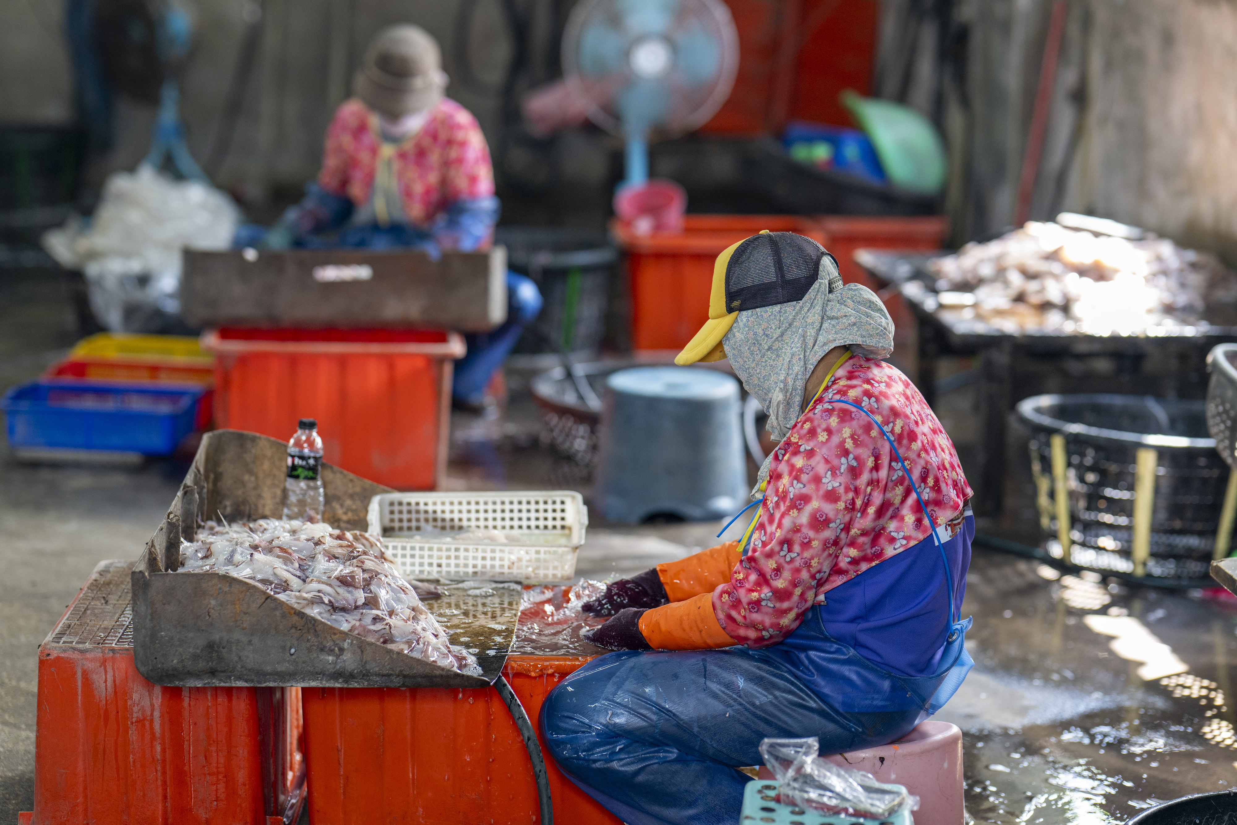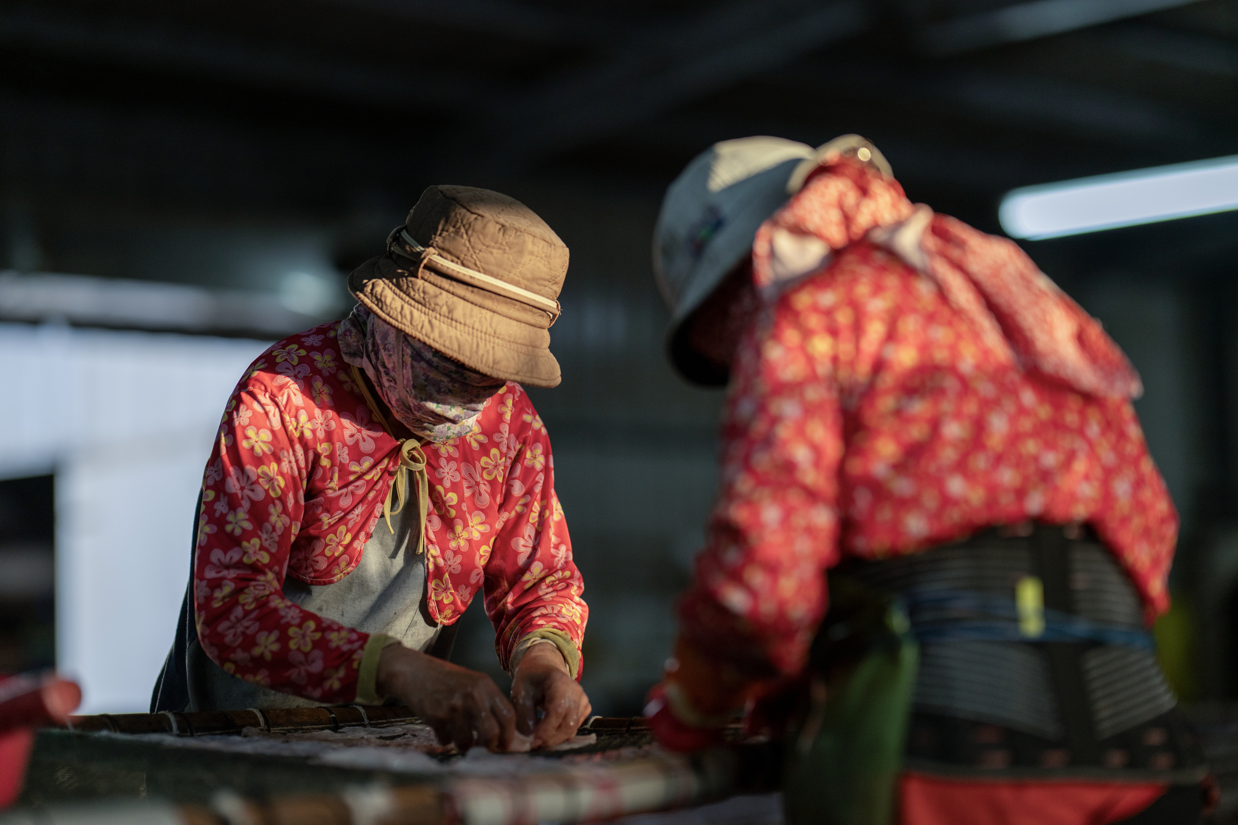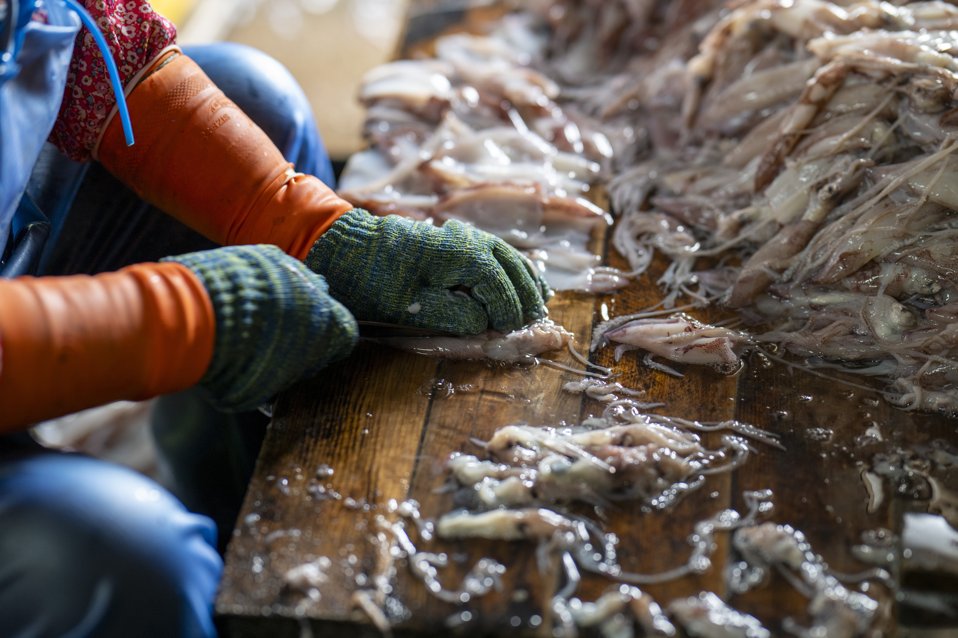 當大家還在熟睡時,女工們與夜相約,準時三點啟動一日的工作活;不分春夏秋冬,一年又一年。身為生產線的第一線人員,每日工作情形視進貨量而定。處理眼前的小管量,從剖小管到曬小管片,須清楚整個作業流程,互不影響。偶爾隔空閒聊一下,談談兒女在台灣的現況,聊聊最近種植的農作。