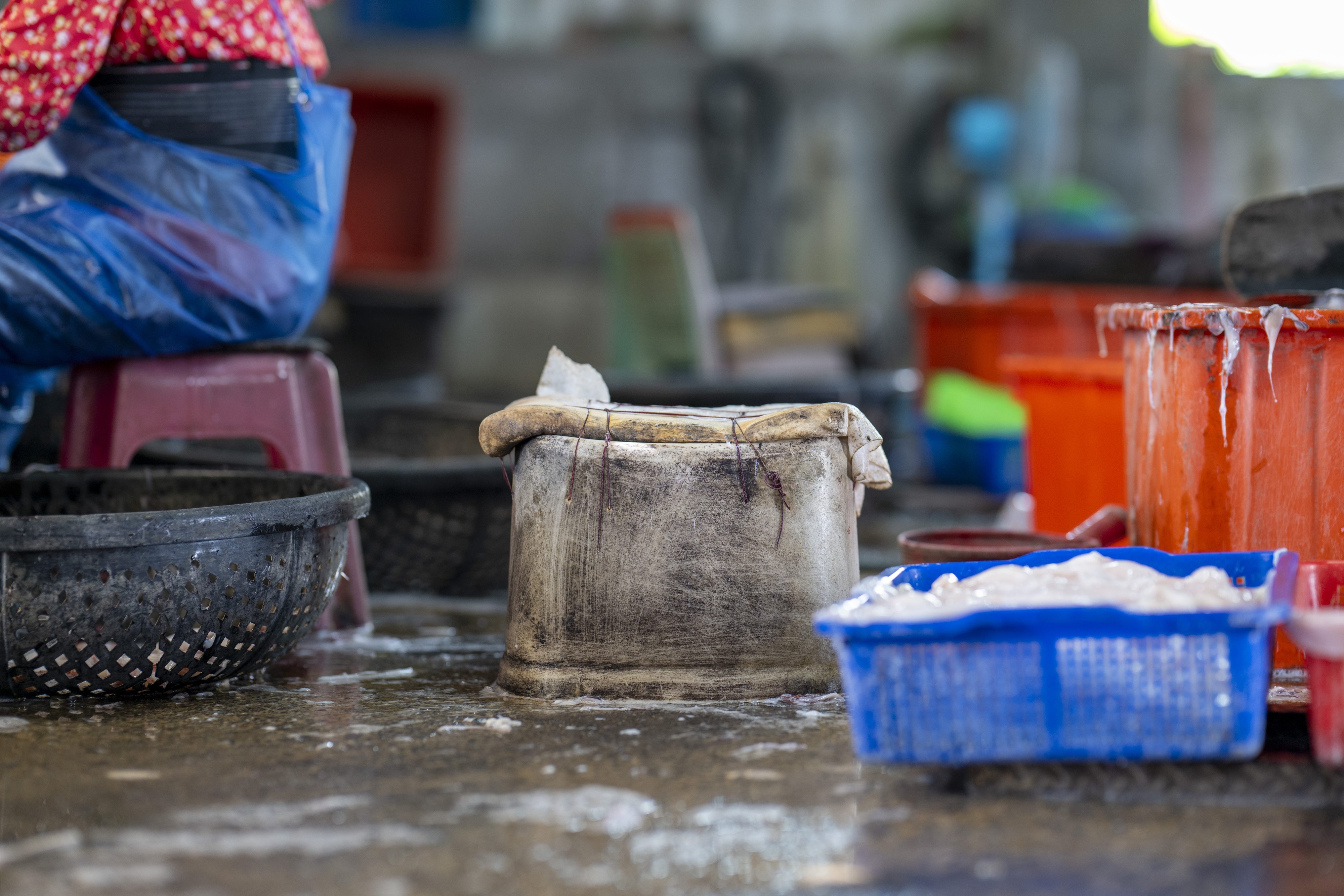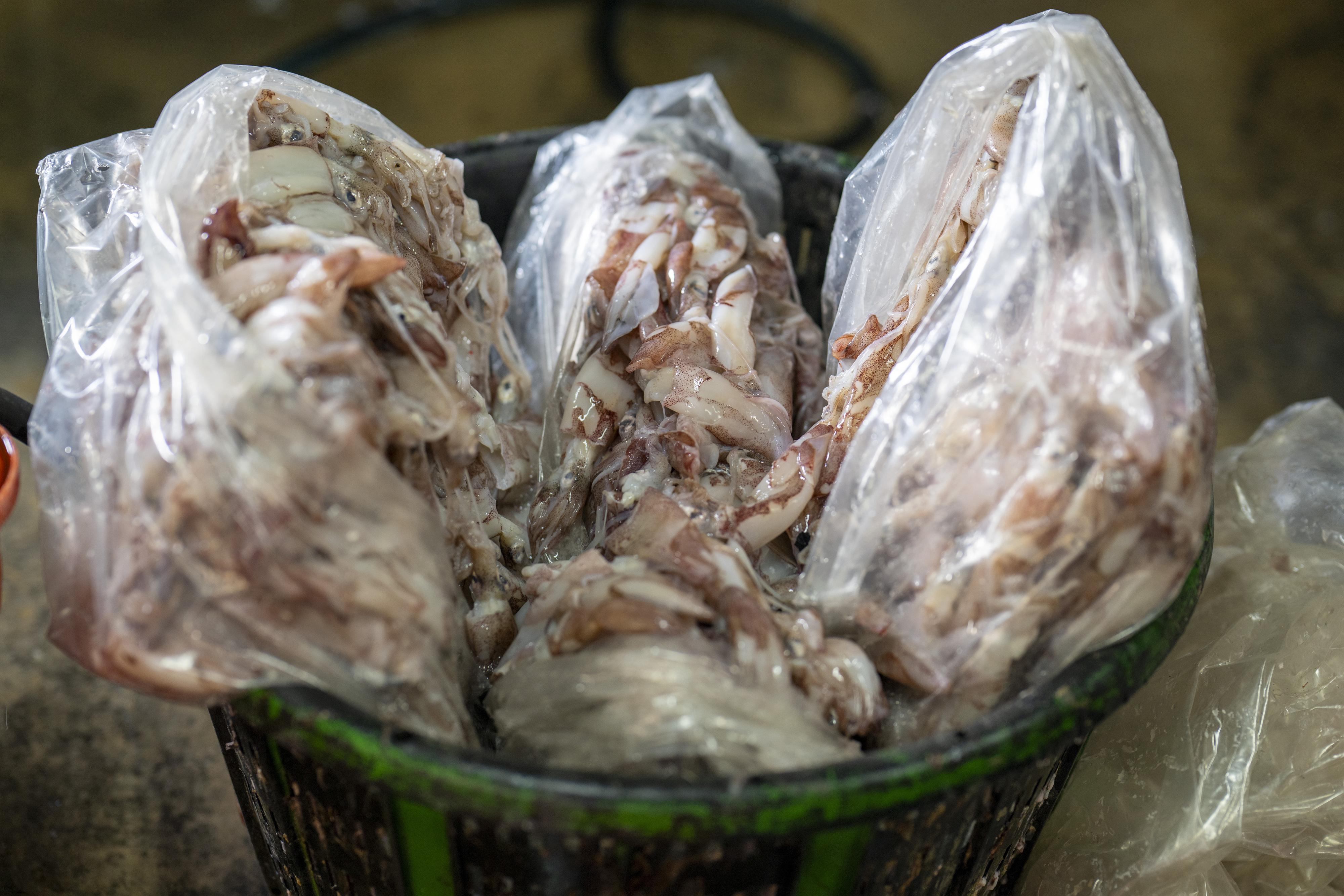 一名女工邊處理漁獲,邊與我相談。她身手熟練地專注在自己的工作,一面搓洗小管片,一面分類大小。為公平起見,長期以來她們的工作內容都靠抽籤,形成彼此心照不宣的默契。老頭家說,小管有大小之分,以同斤數而言,體形大份量少;體形小份量多,影響作業時間長短。每個人都希望抽到自己那支幸運籤,起碼爭取多一點休息時刻。