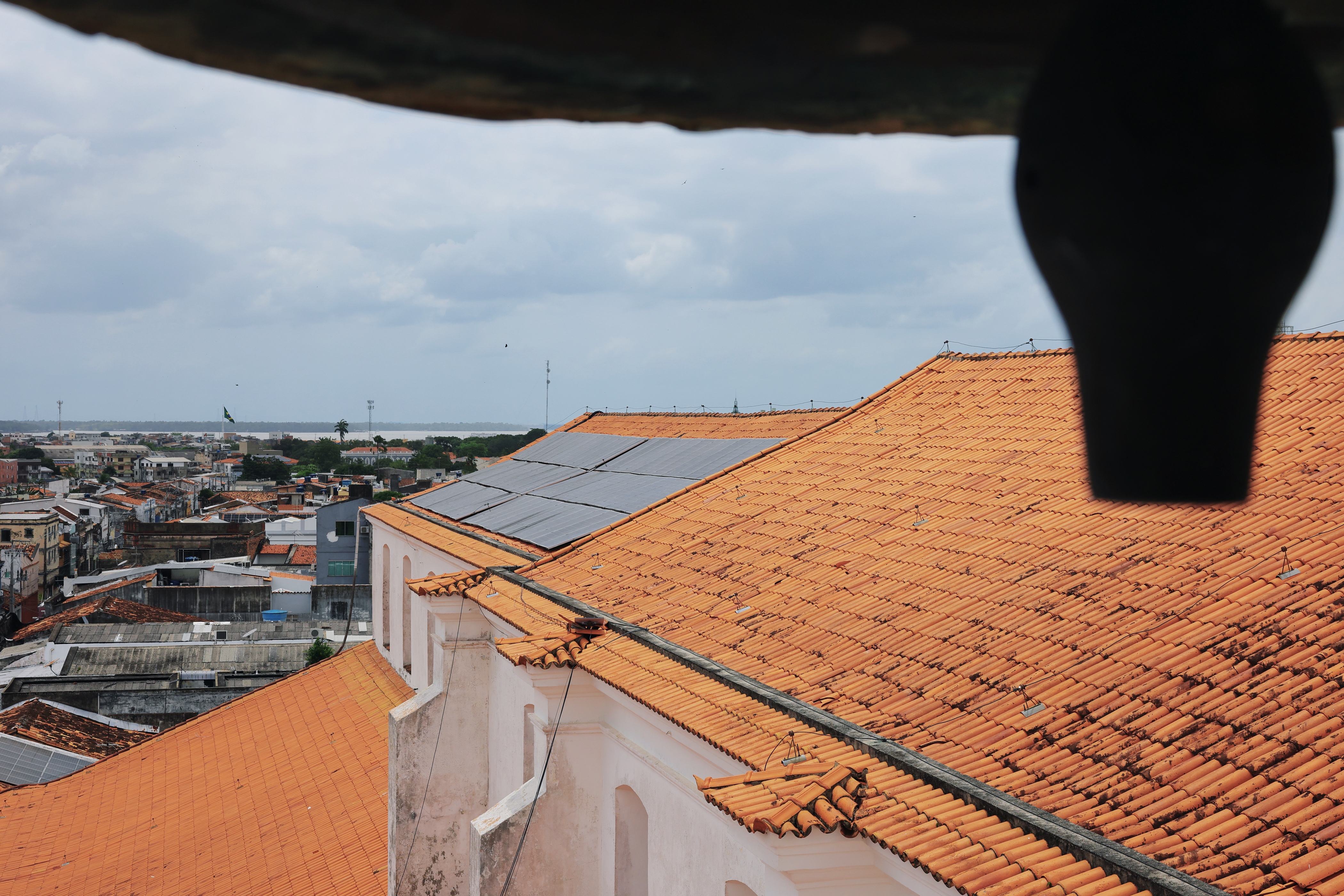 在城市另一端,巴西社會企業 Essências da Floresta 則在古老的教堂屋頂上,為貝倫點亮第一道太陽光電。記者跟著管理員走上不開放公眾通行的階梯直到頂樓,建於 18 世紀的貝倫大都會主教座堂(Catedral Metropolitana de Belém)的頂層還有幾座白色鐘樓。望向翼廊屋頂,馬上被紅色磚瓦上安裝的 156 片太陽能板吸引目光。