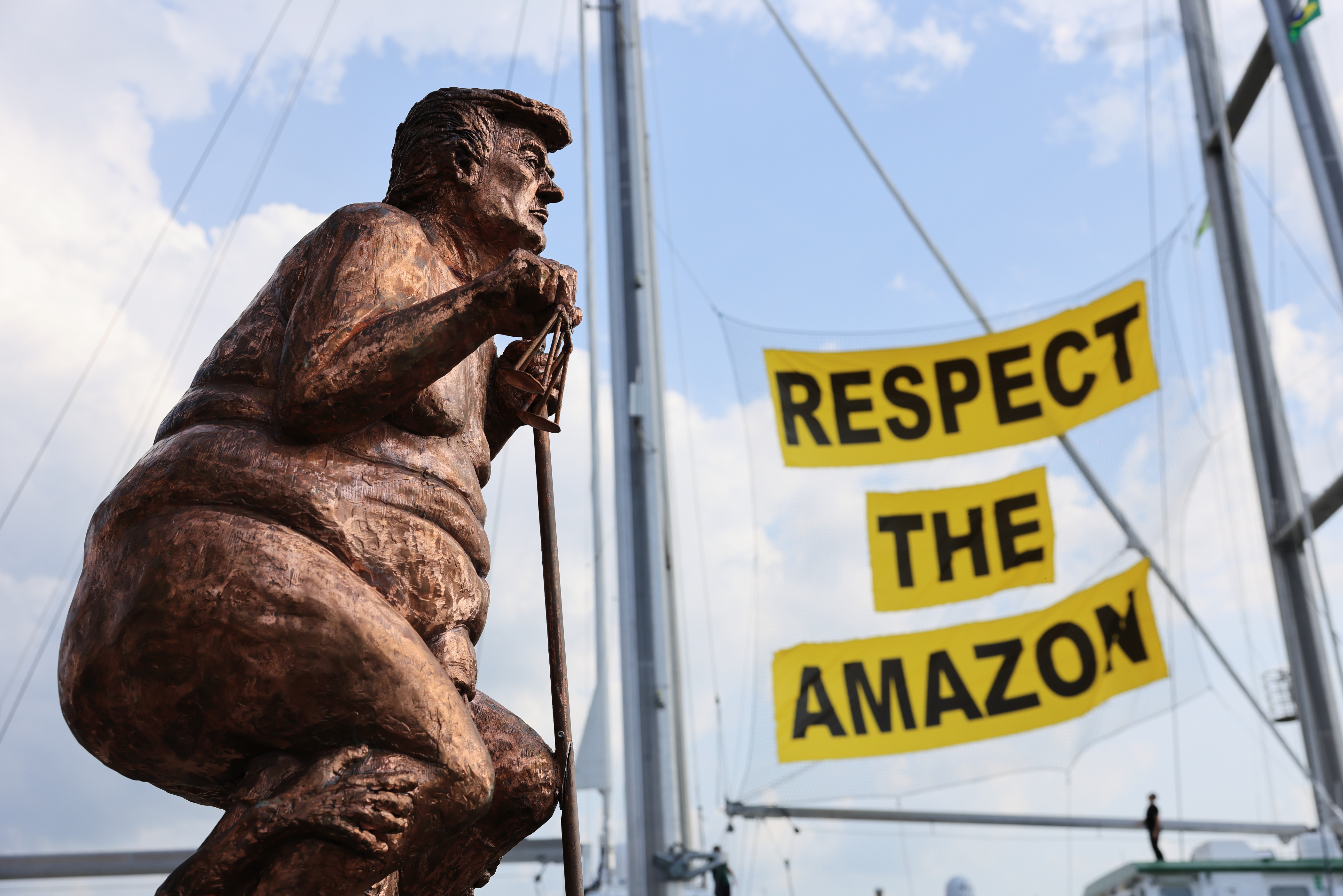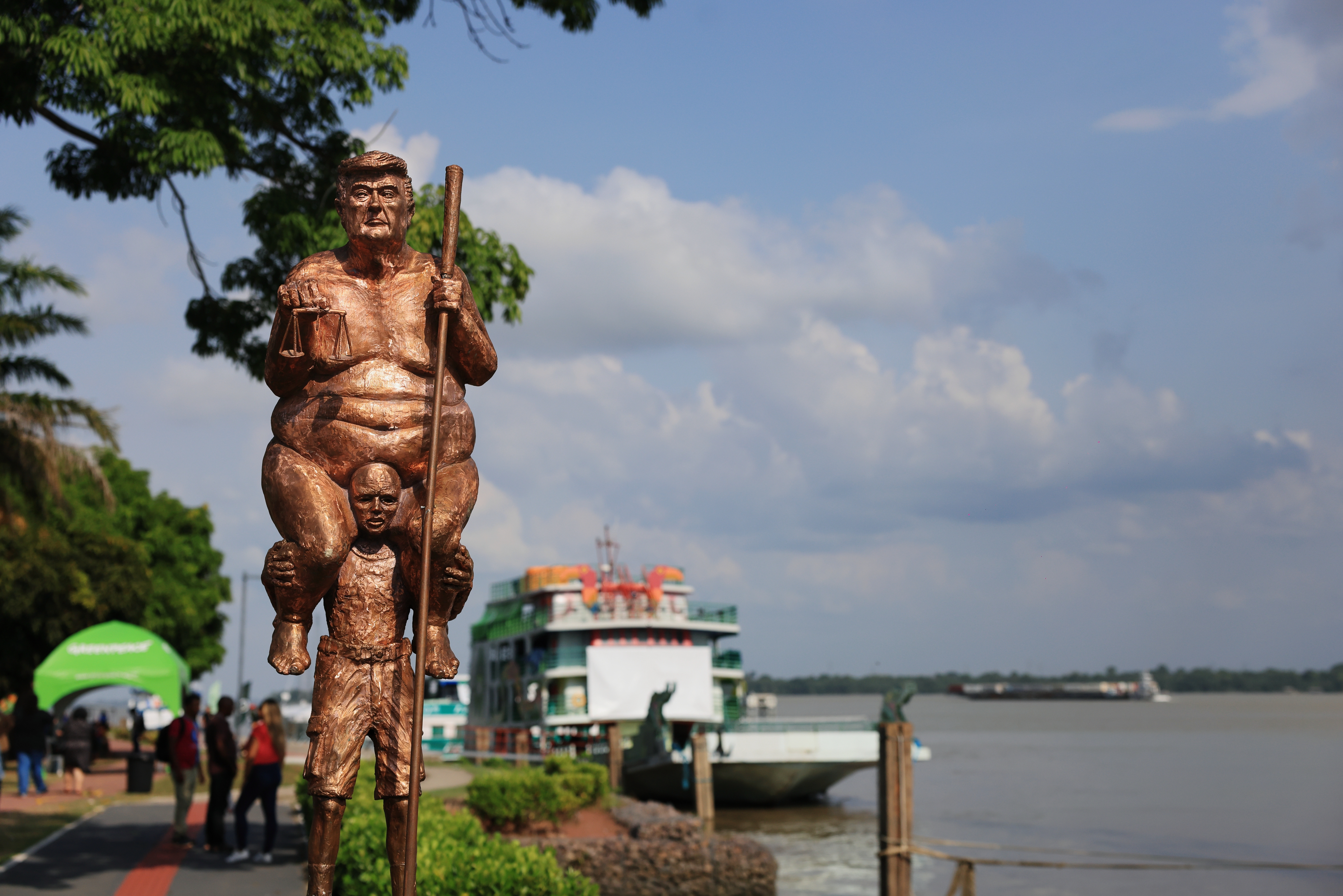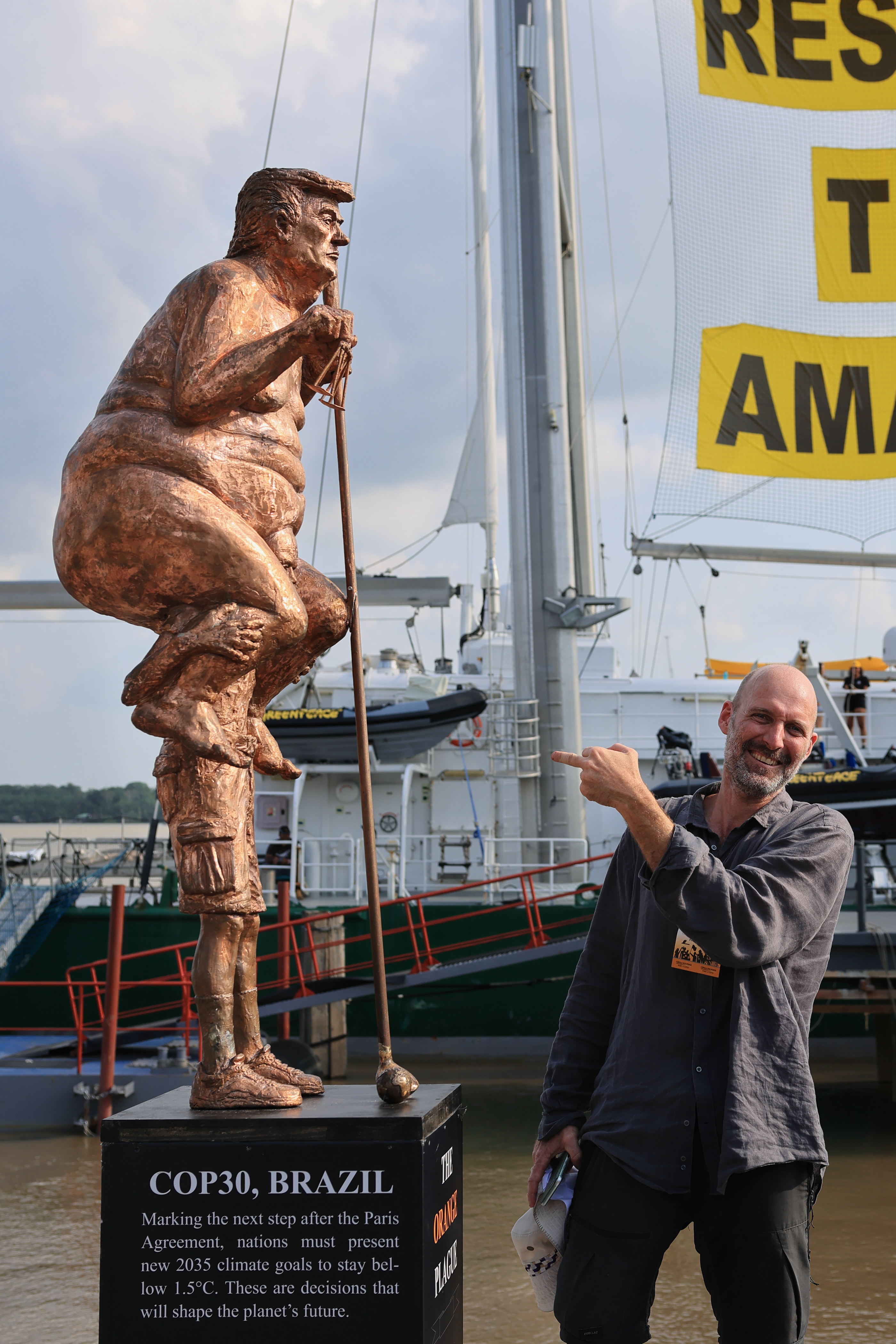 引起關注的還有環保團體綠色和平的傳奇船艦「彩虹勇士號」(Rainbow Warrior)。「彩虹勇士號」停泊在川普的雕塑後方,就在人民熱烈討論雕塑的同時,船的桅杆換上了巨幅標語:「Respect the Amazon」(尊重亞馬遜),在陽光下格外醒目。