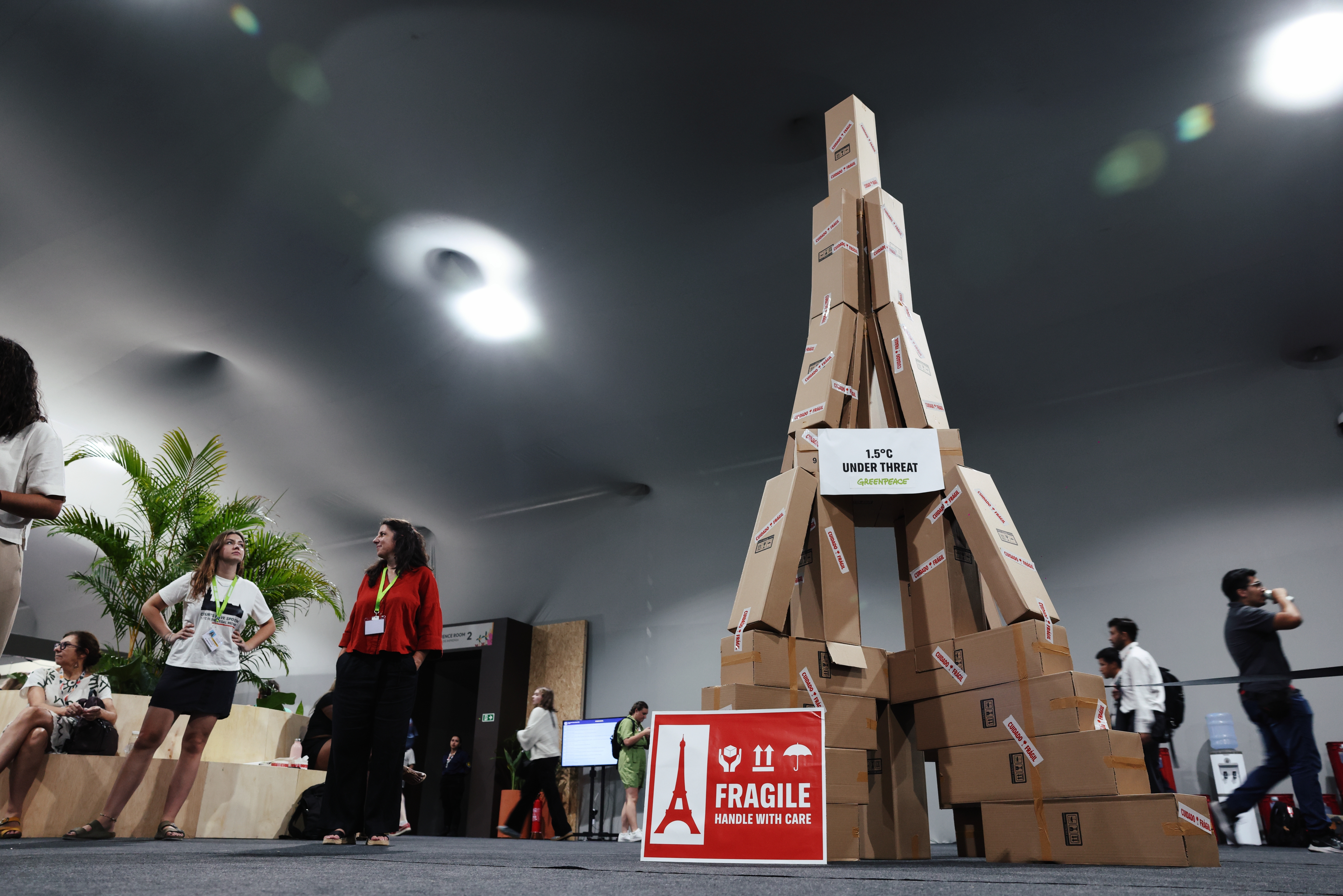 在 COP 主會場內,一座由紙板搭建、標示「易碎」字樣的艾菲爾鐵塔,一樣受到矚目。這是綠色和平設在談判室外的裝置藝術,巧妙地象徵《巴黎協定》十週年之際,1.5℃ 的氣候升溫上限已受到威脅。