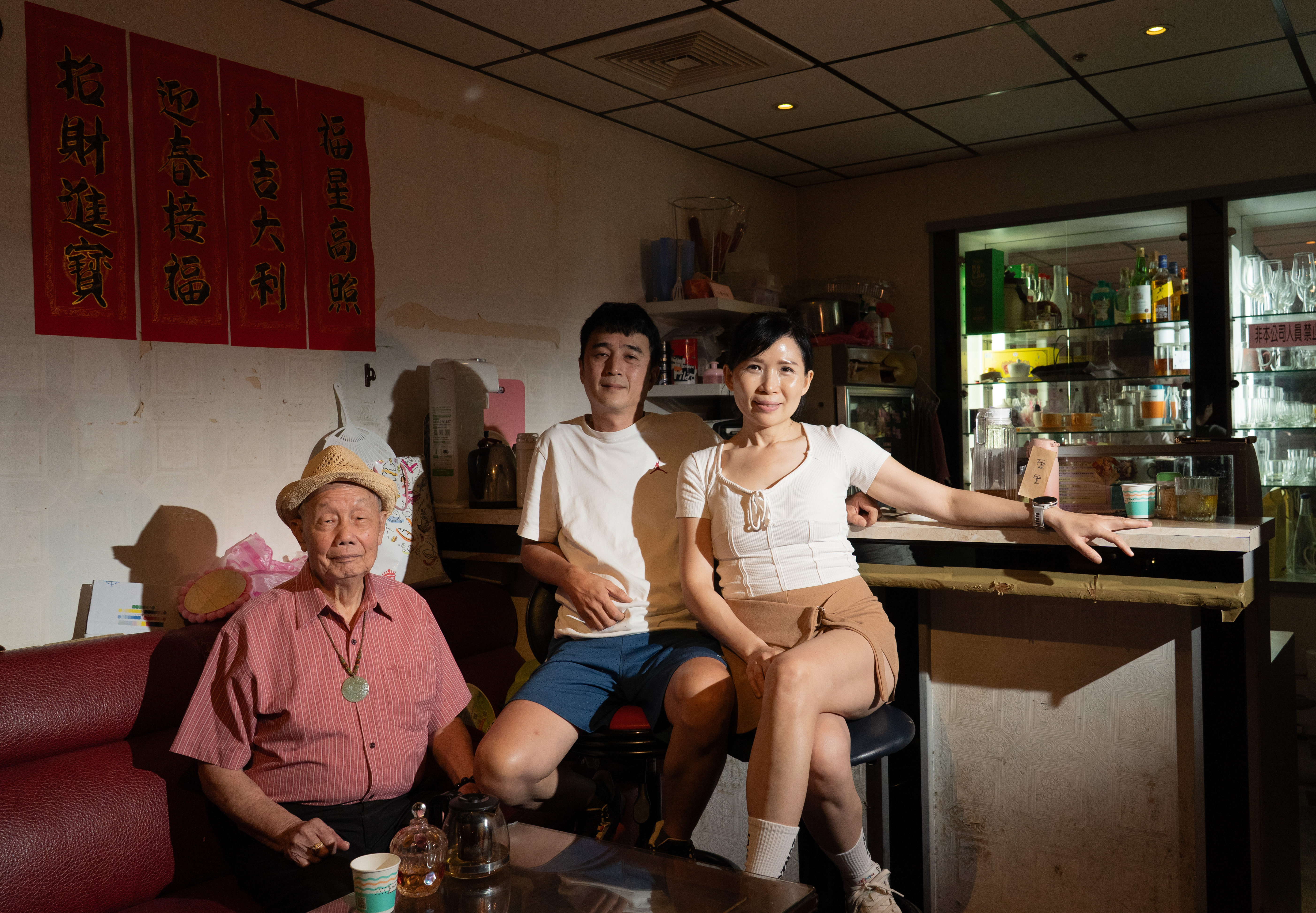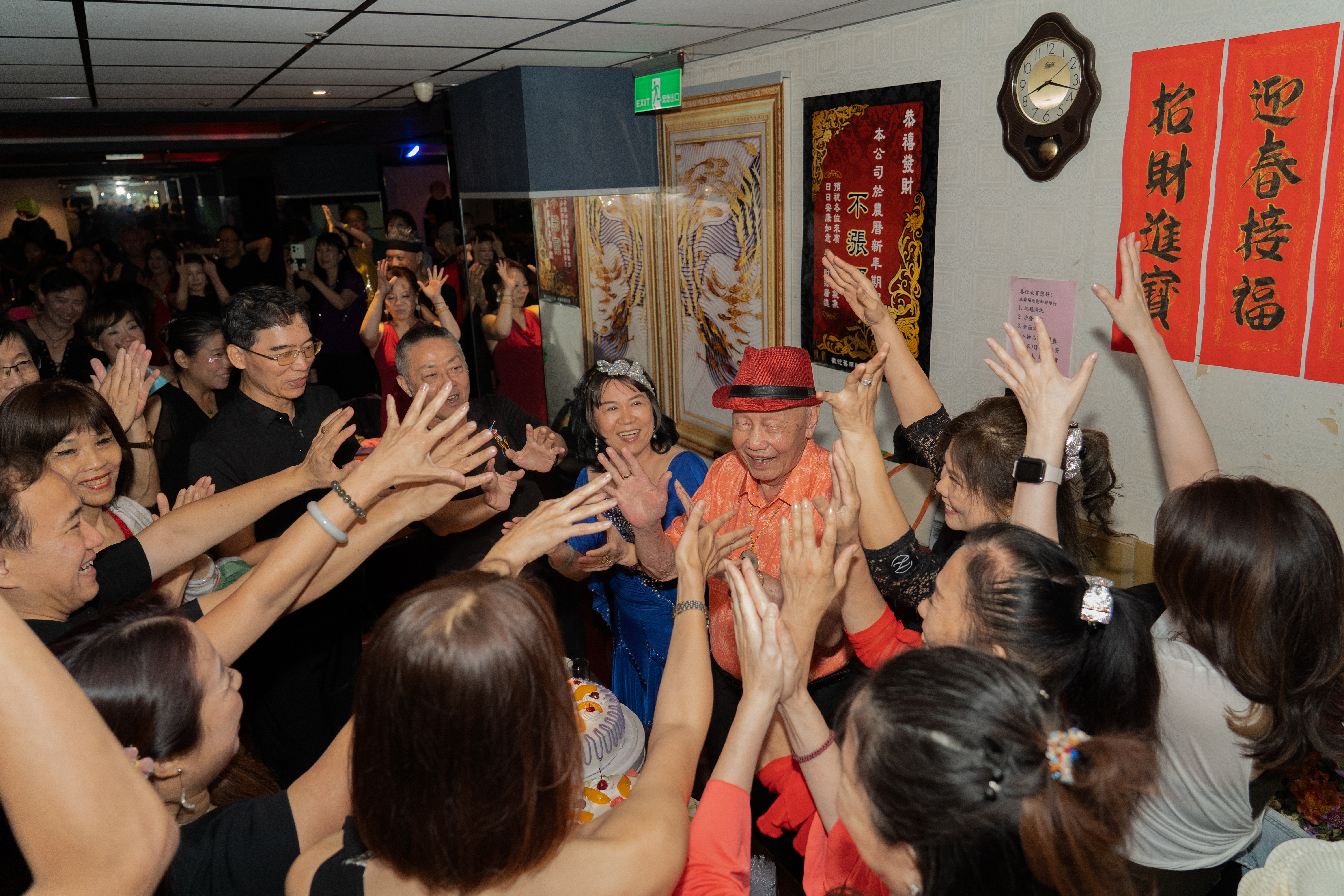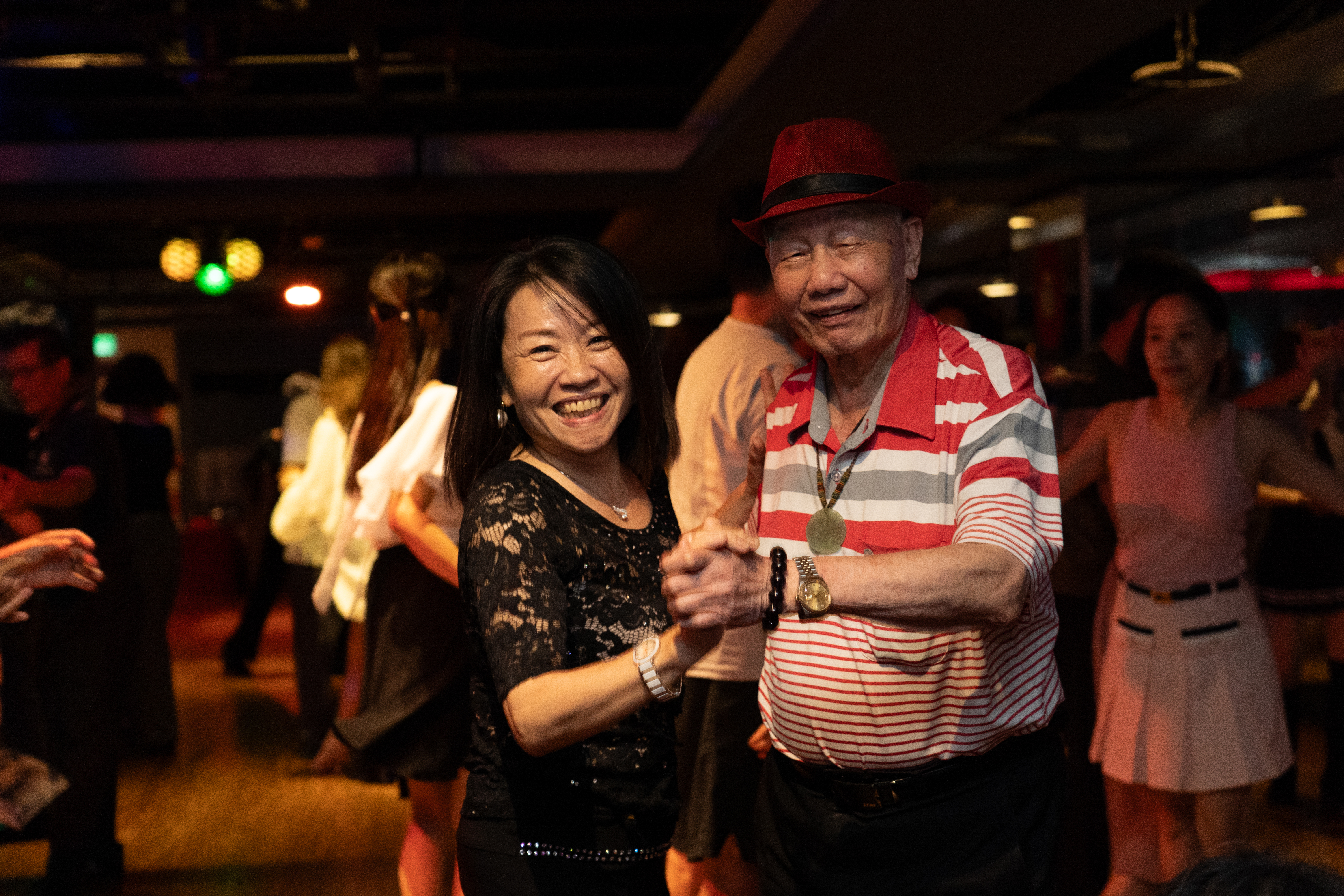「好久沒看到你了!最近過得好不好?」小慧姐笑臉迎客,招呼客人入座邊送上茶水,遇見獨自前來的舞客,小慧姐和明哥也會陪著對方跳上一段,不讓任何人在熱鬧裡感到孤單。舞客會和他們分享帶來的菜餚,也會在吧台喝威士忌談笑風生,甚至每季會有慶生會爲舞客慶生。拍攝那天正好是凱帝前老闆朱爺爺的 98 歲慶生會,舞客們輪番上前勾著手和朱爺爺跳舞,舞場氣氛比平時還要歡騰。