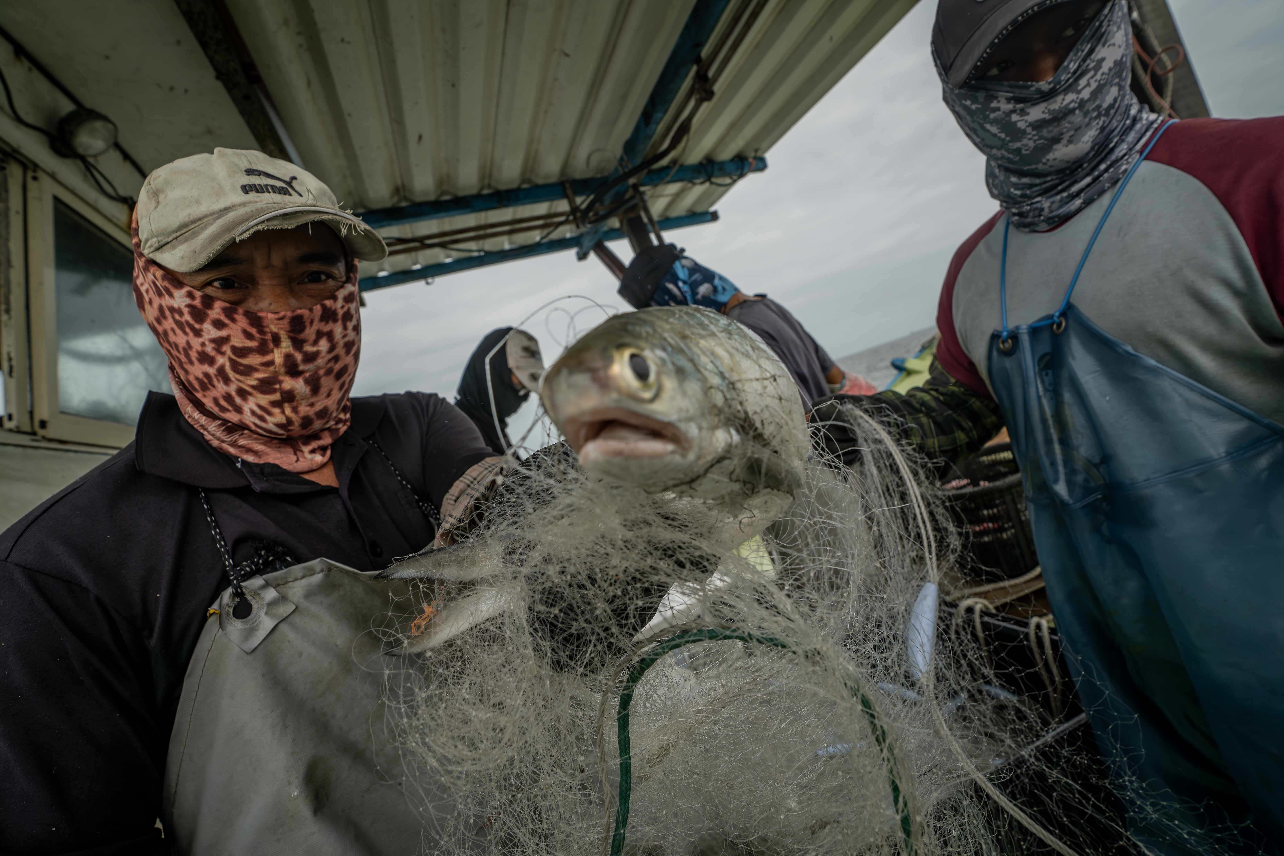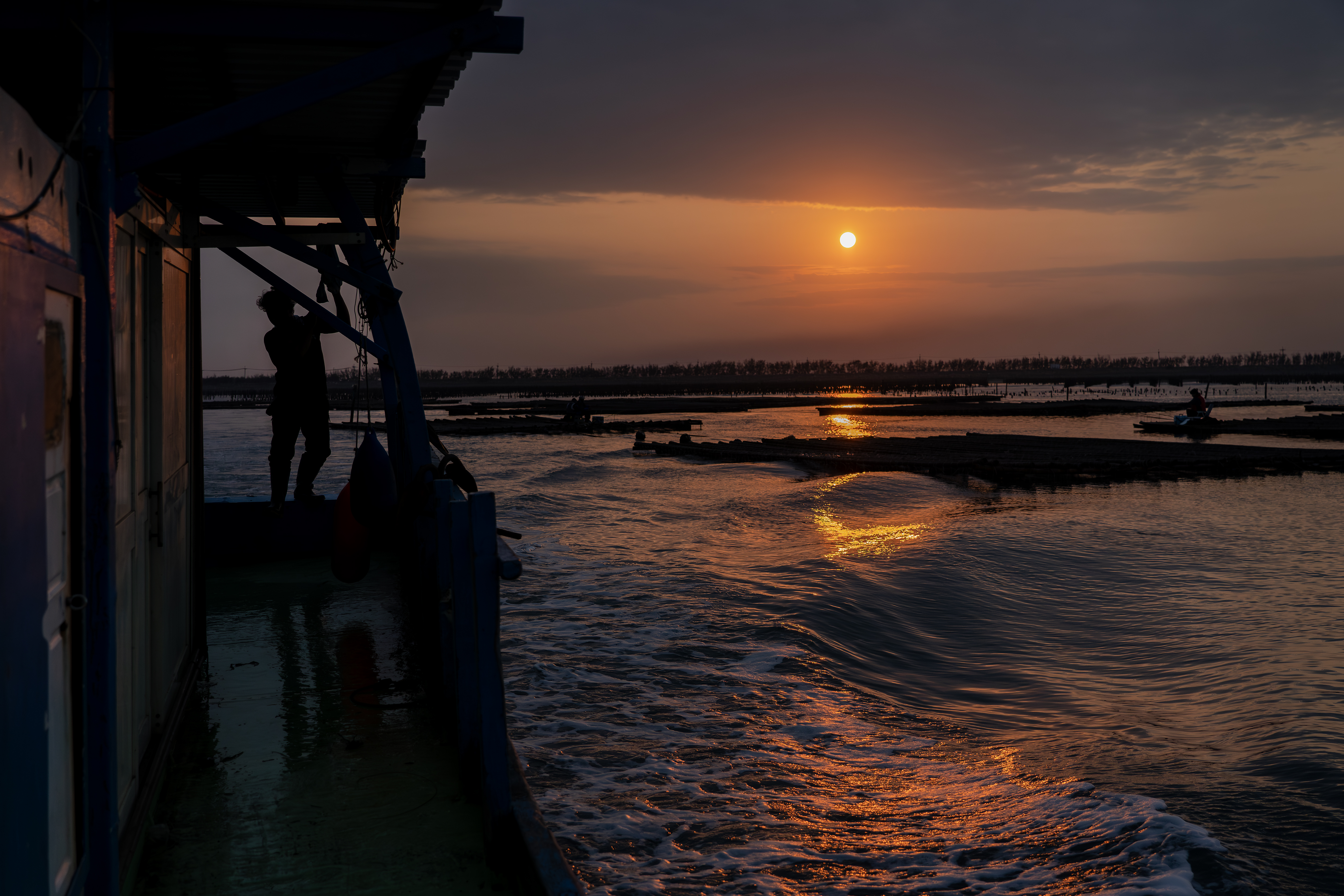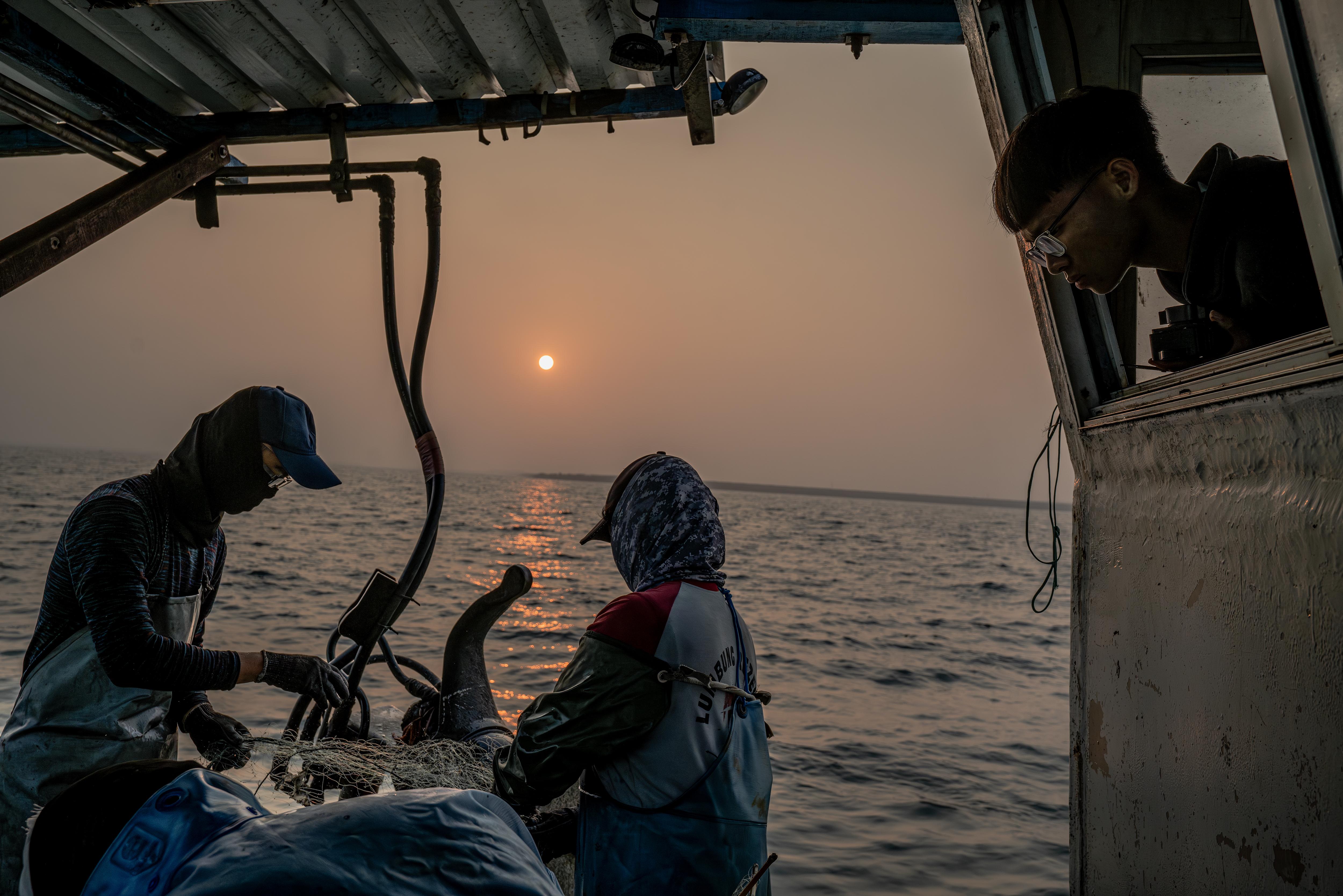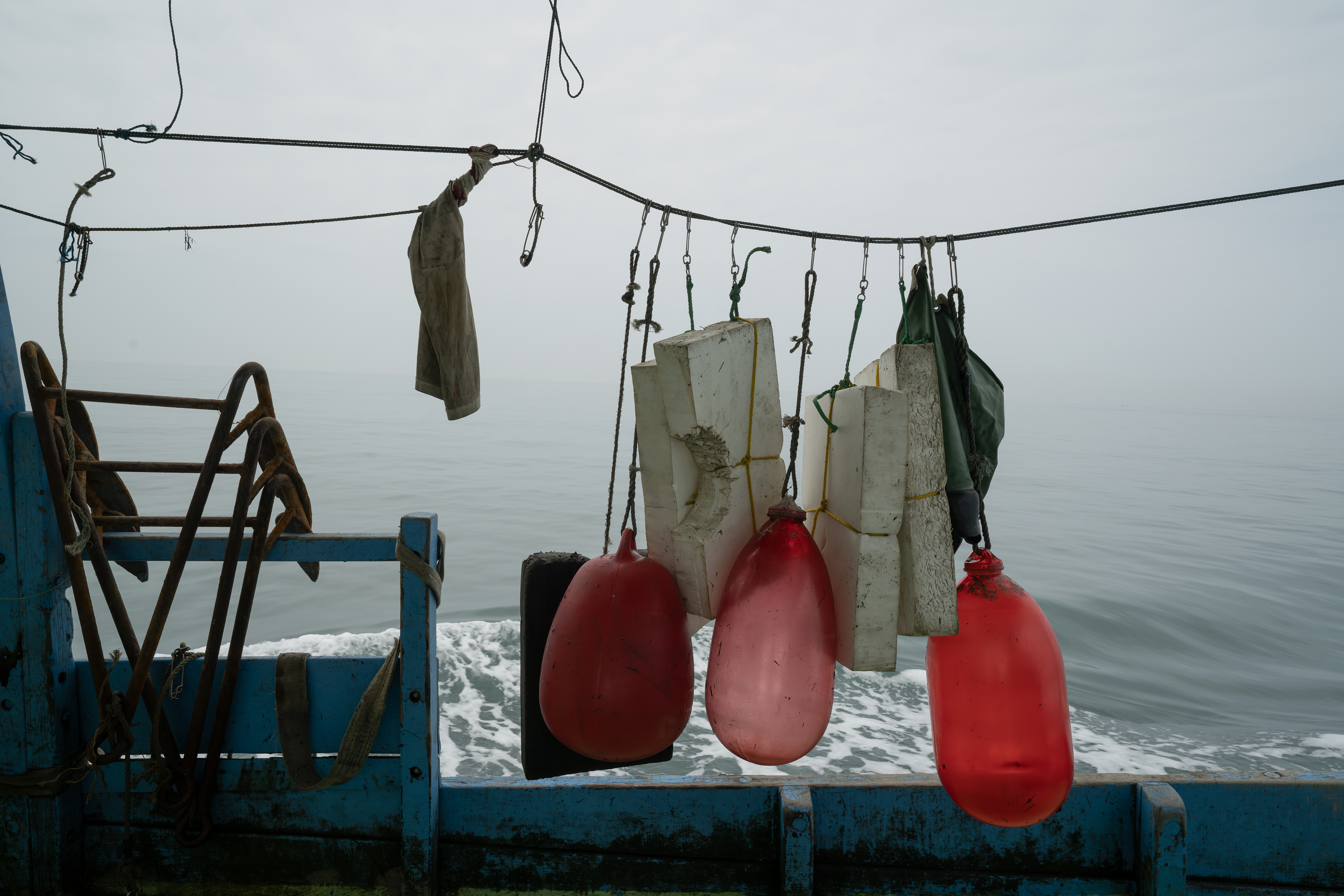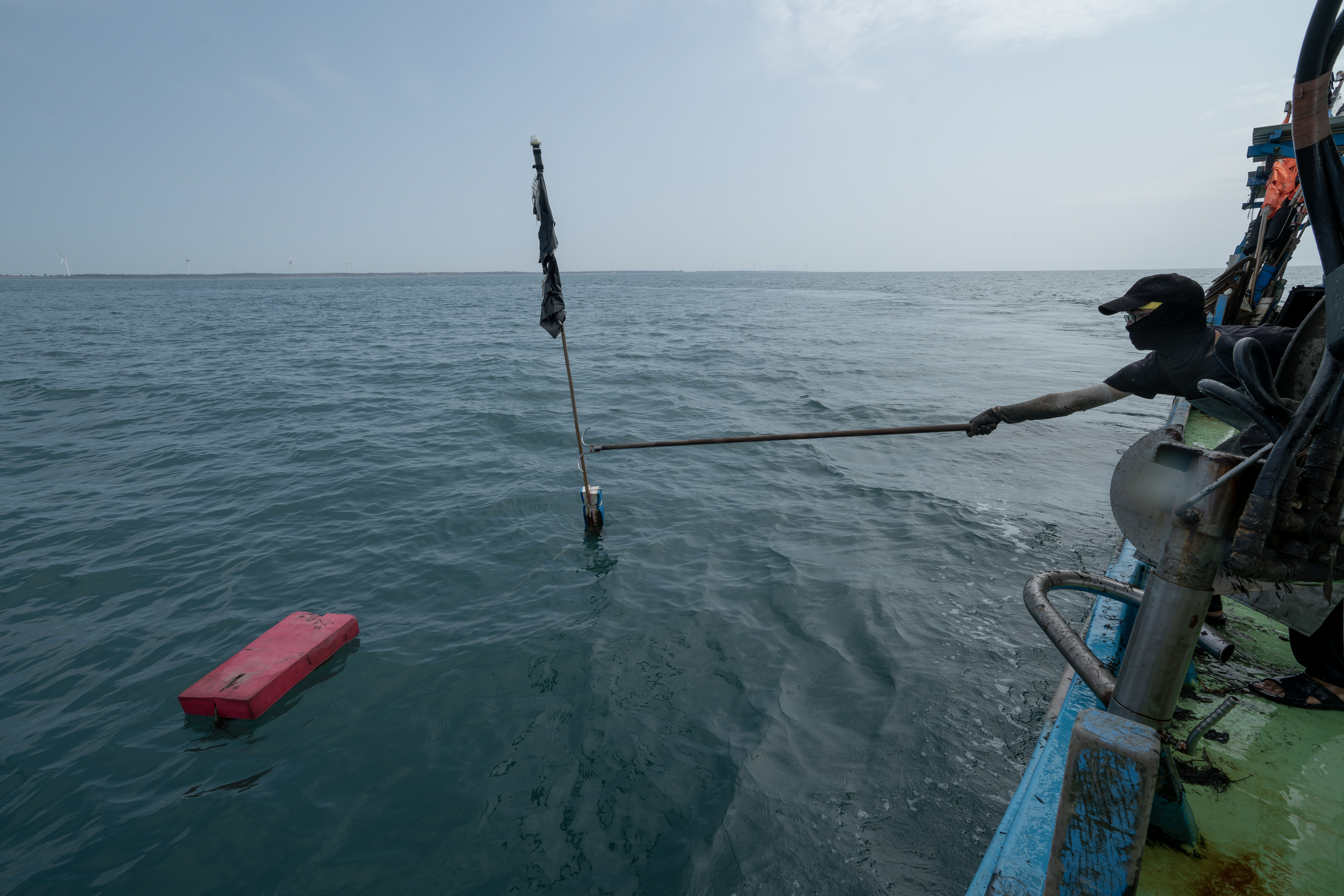 全速航行的引擎聲,無疑是清晨海面上最響亮的聲音;航行至下網處,聲音終於慢了下來。阿峰拿起拉桿看準浮標,快速從海中把帶引線的漁網拉了上來,繞上起網機開始這一潮汐的工作。