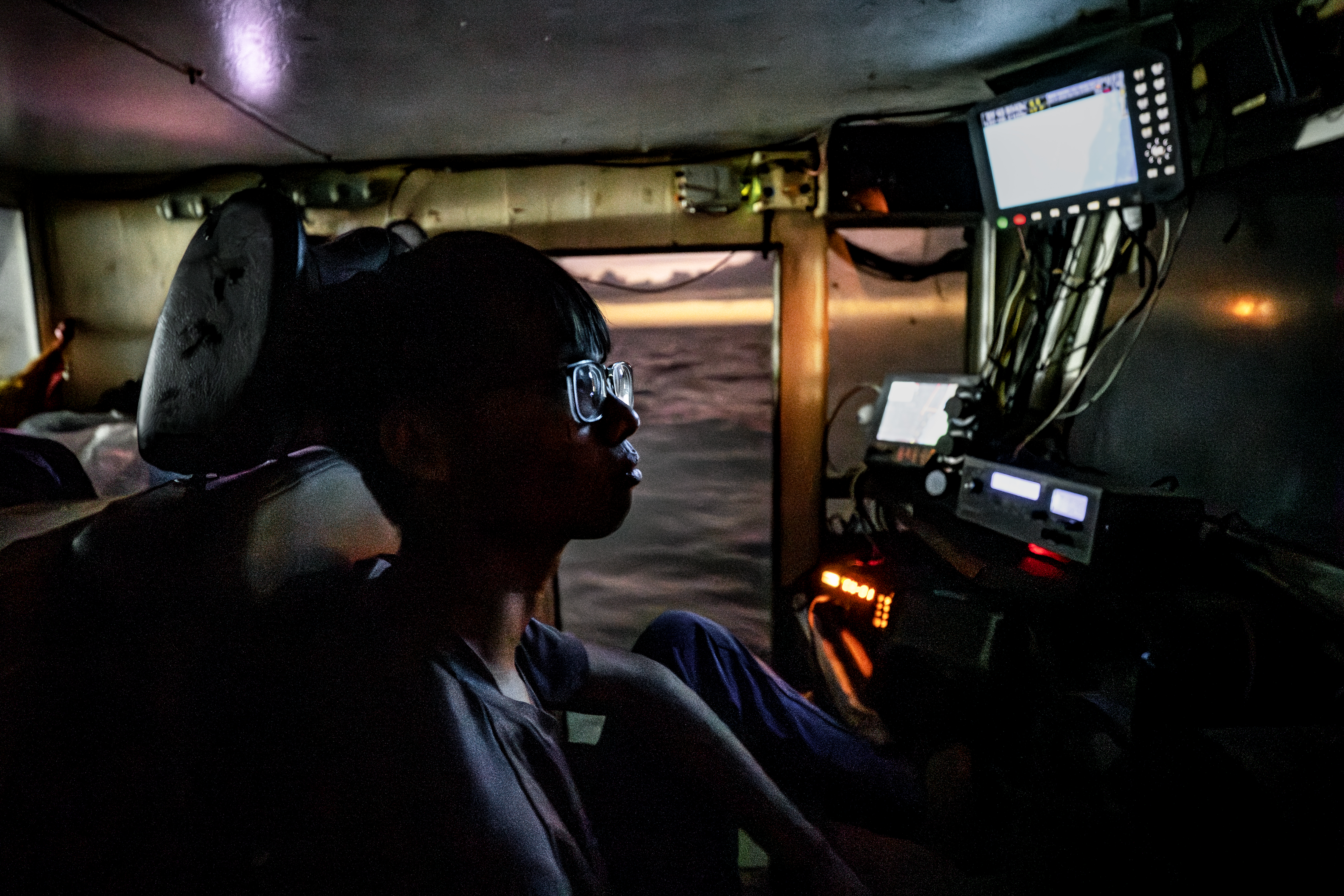 凱文看著 GPS 底刺網下網位置,這時阿峰與 Ludy 約有半小時喘息,只需盯著或理一下漁網,讓網子順著滑出漁船。 「我接觸海洋後,喜歡上這種自在的生活,就把唸大學的事丟在一旁,想先當漁夫幾年再說。」