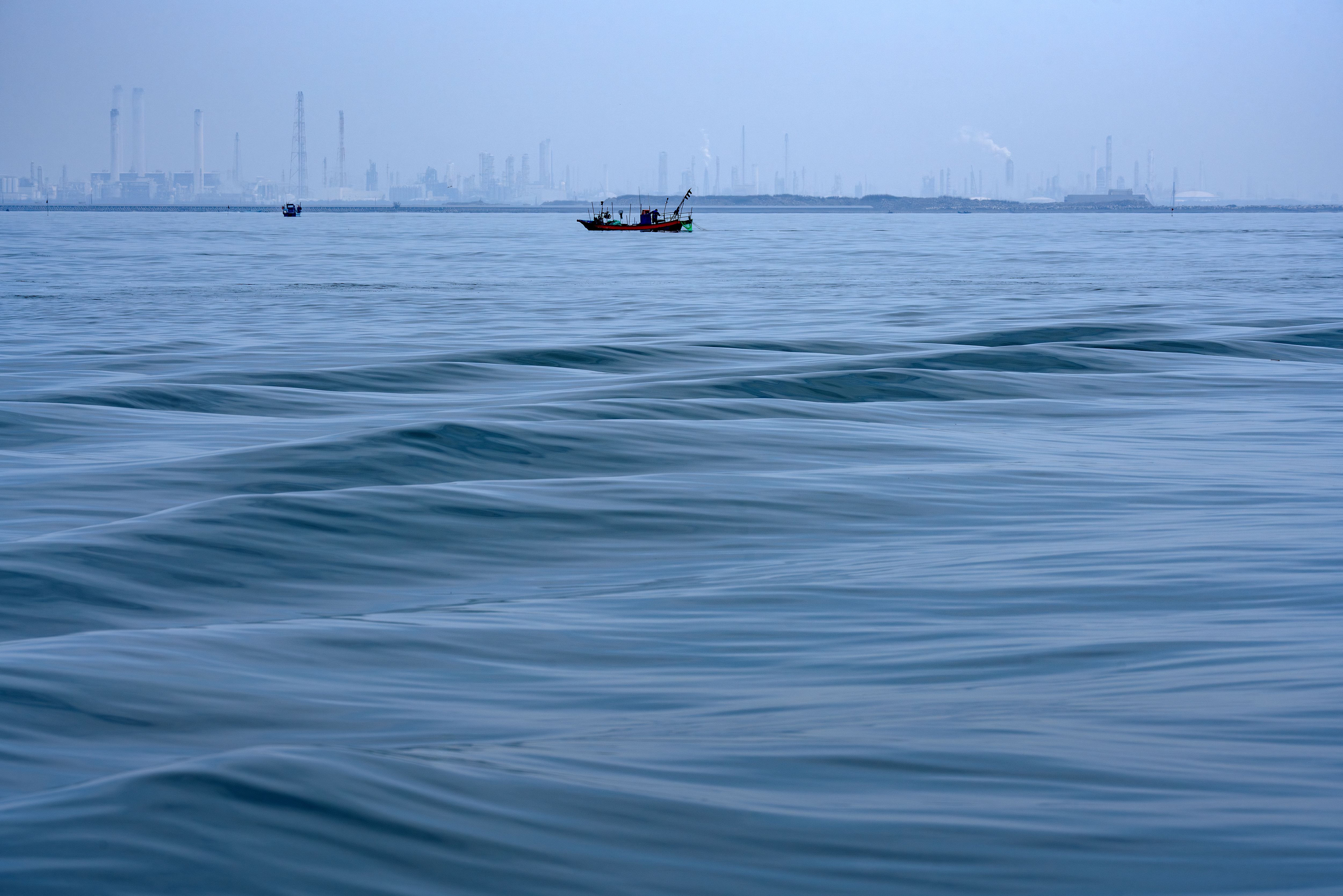 淺灘、港口、潮水、石化工業、太陽光電,與遠處猶如仙女棒般,代表著台灣當代海洋能源的陸域與離岸風機,完整勾勒出台灣海洋廊道的輪廓。在霏霧天色中,帶點模糊,卻也無比清晰。