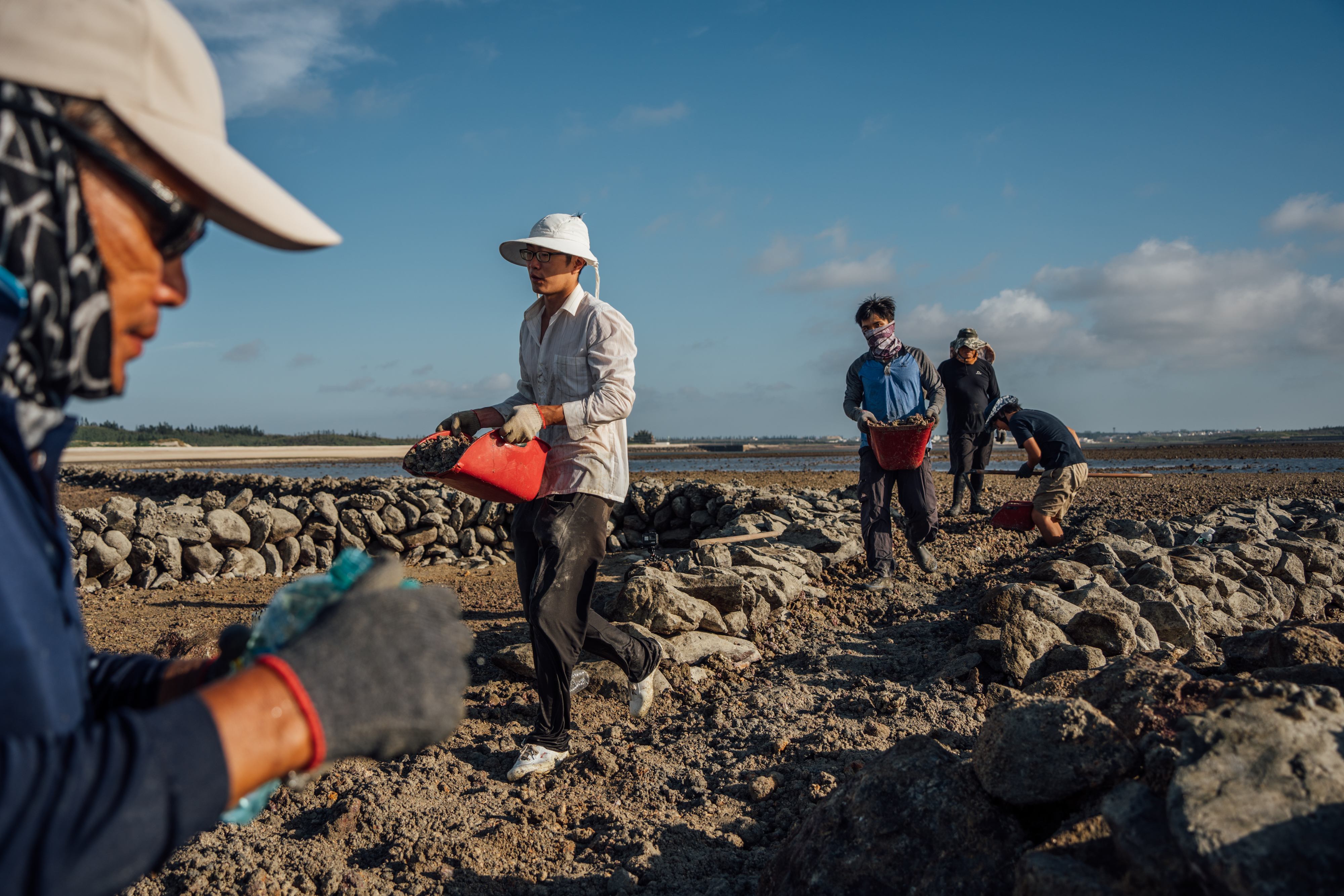 來自澎湖的離島出走團隊,正帶領一群石滬傳統匠師,搶在潮汐間將砂砱移出,試圖恢復石滬的集魚功能。砂砱淤積的嚴重性比想像更嚴峻,層層堆積的砂砱讓魚苗大量擱淺,陽光曝曬則讓這些脆弱的生命更難存活。以前石滬有魚苗避風港美稱,如今卻成魚苗墳場。