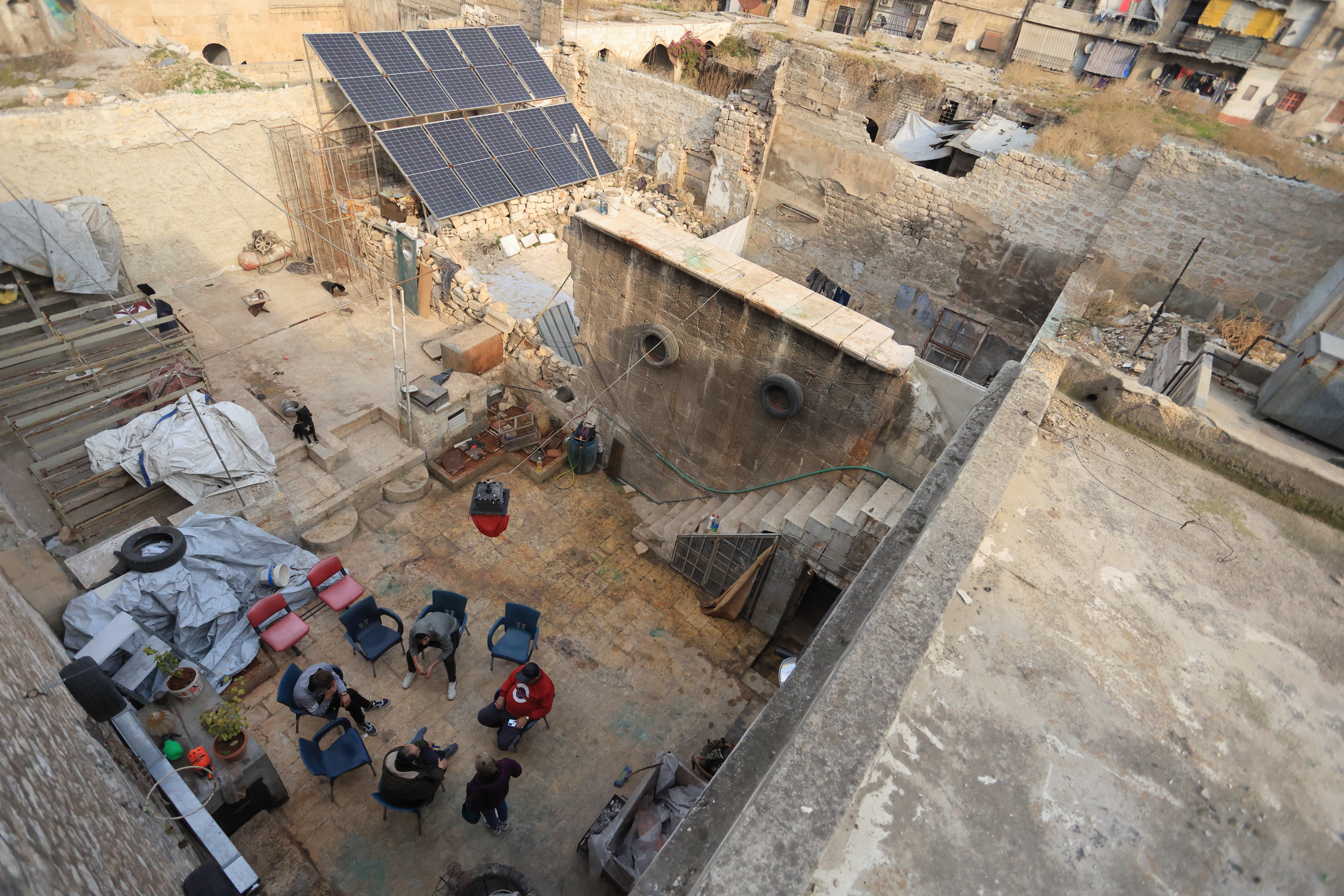 由於供電依然吃緊,阿勒坡許多街區入夜後漆黑一片,少數商家只能靠白天用太陽能板存下的電力,勉力在夜間持續運作。