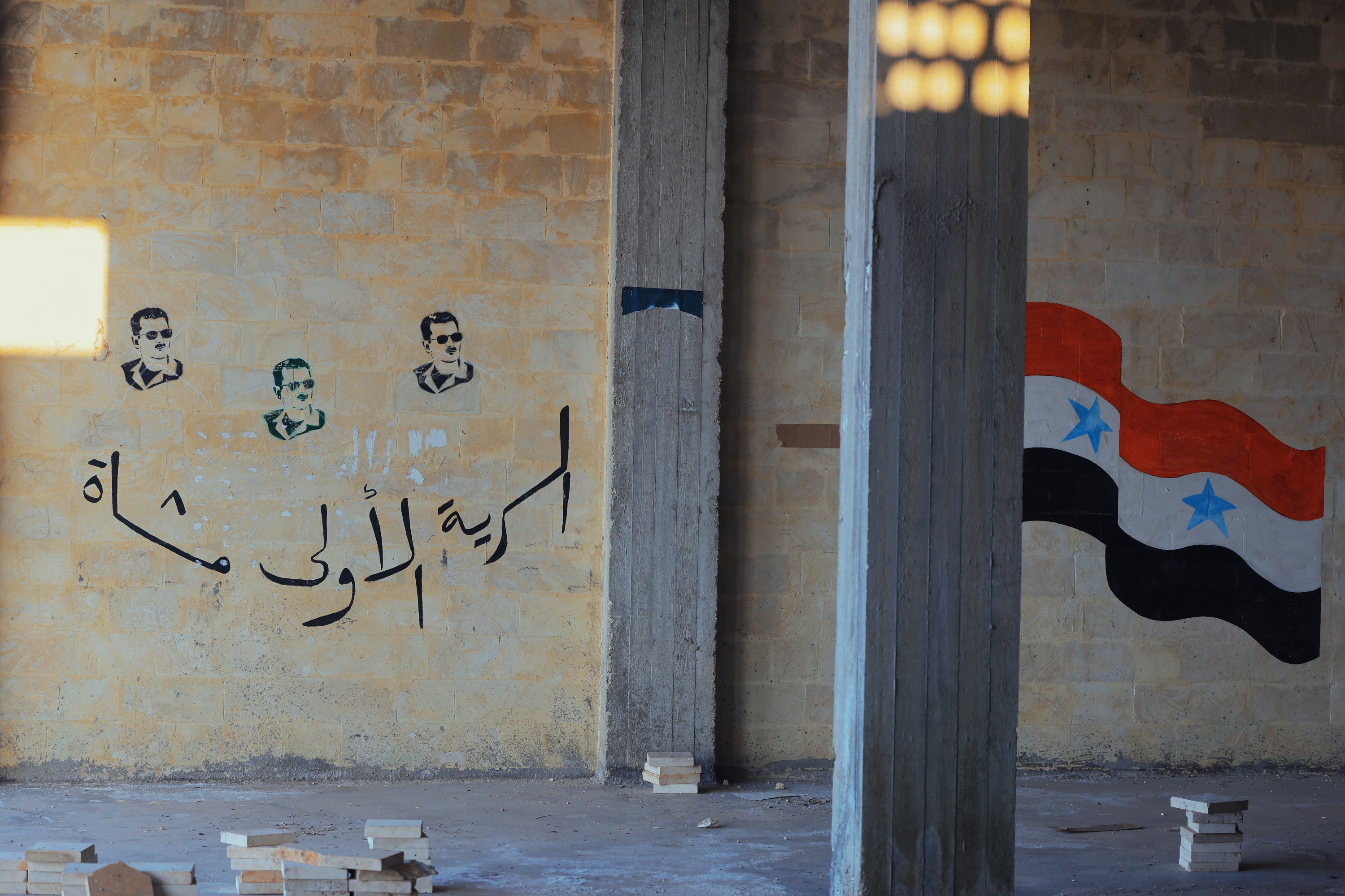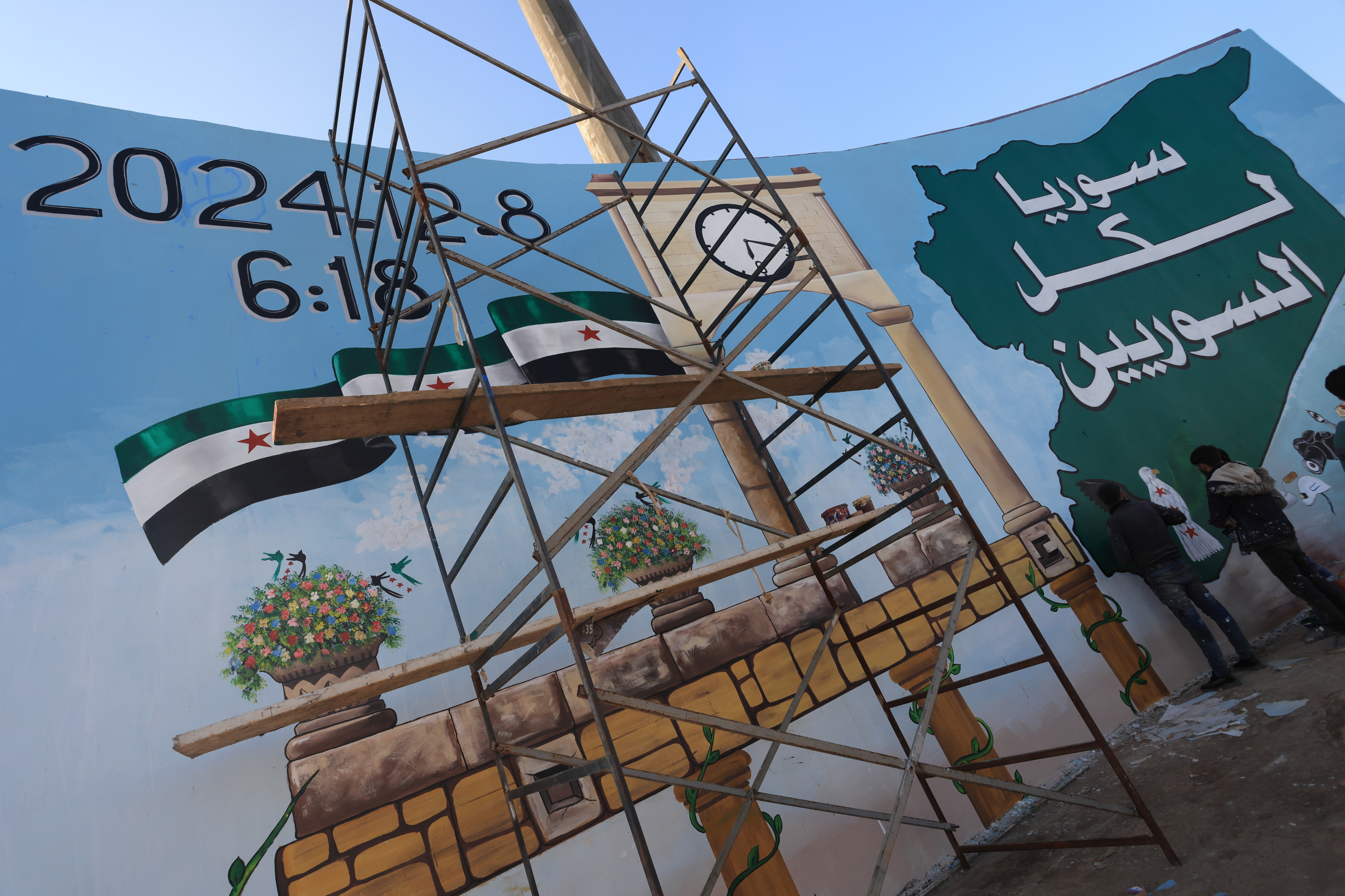 白旗下的廣場牆面,漆上象徵和平敘利亞的塗鴉,並明確寫上敘利亞遭到「解放」的日期與時間。內戰的勝利,被伊德利卜人視為光榮與驕傲。