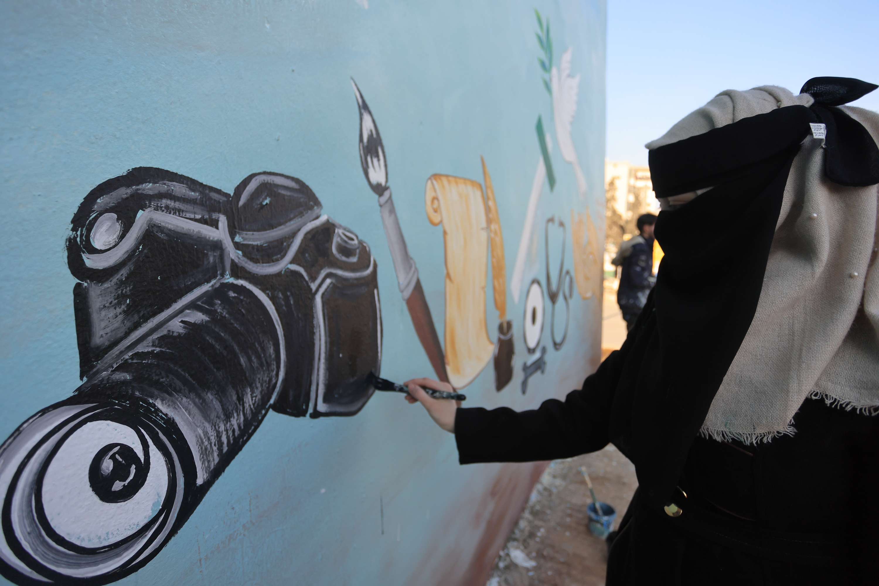 一名覆蓋面紗的伊德利卜女性,正在牆面上繪畫象徵記者與新聞自由的相機。
