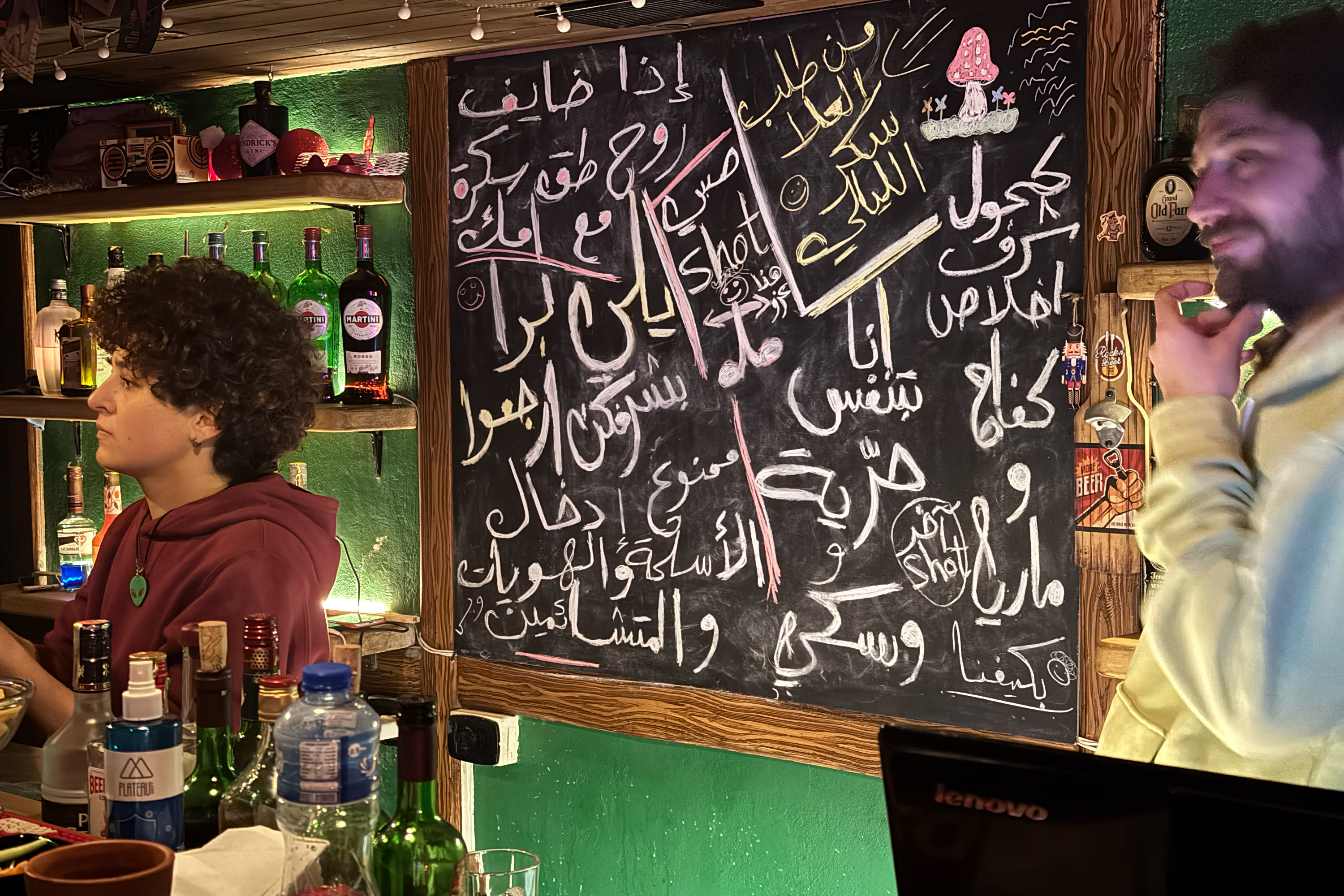 大馬士革一家叫做 Sugarman 的酒吧,是許多外國記者駐足流連之處。吧台後方的黑板寫著:「如果你擔心 HTS 的話,就回家和你媽喝酒吧。」