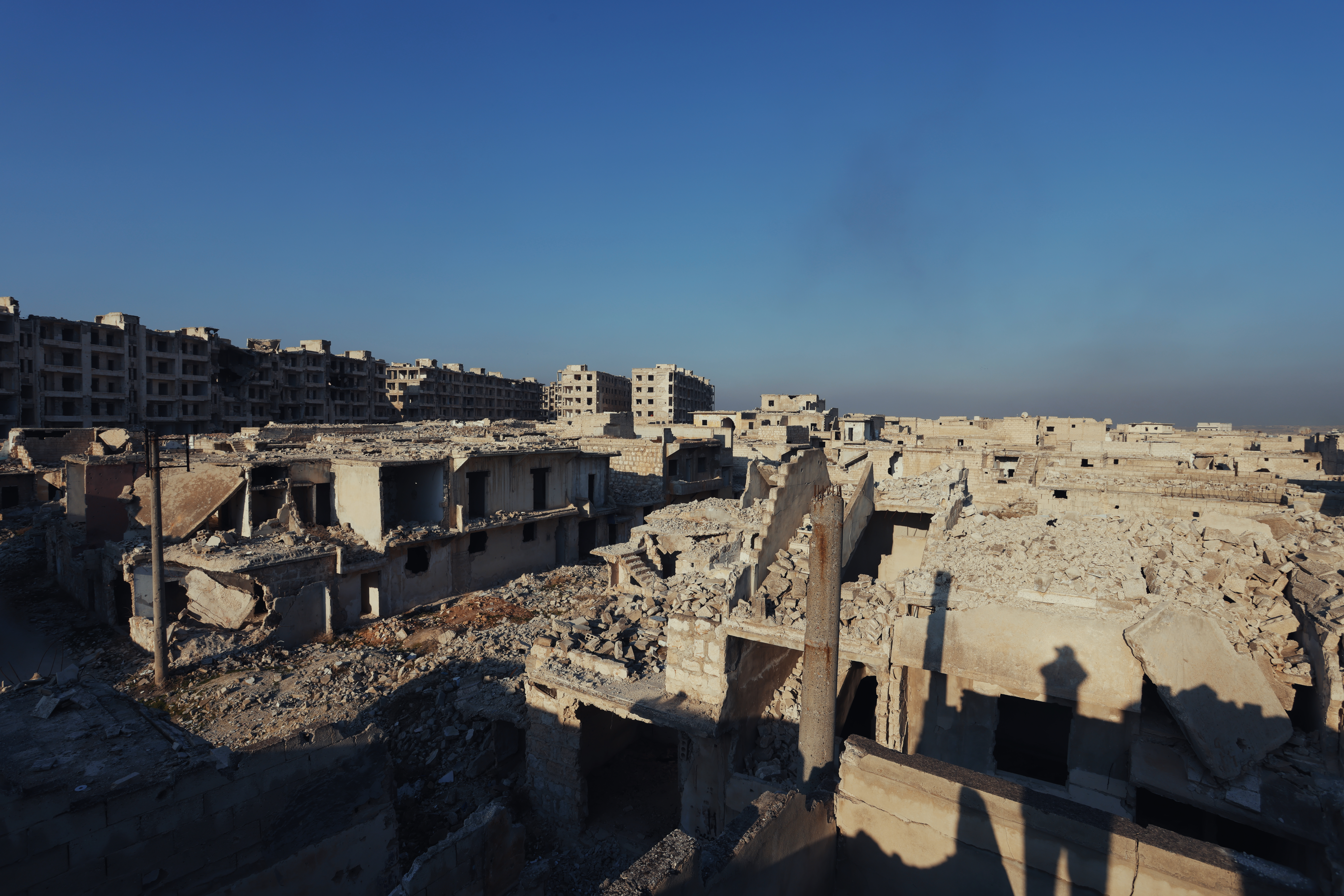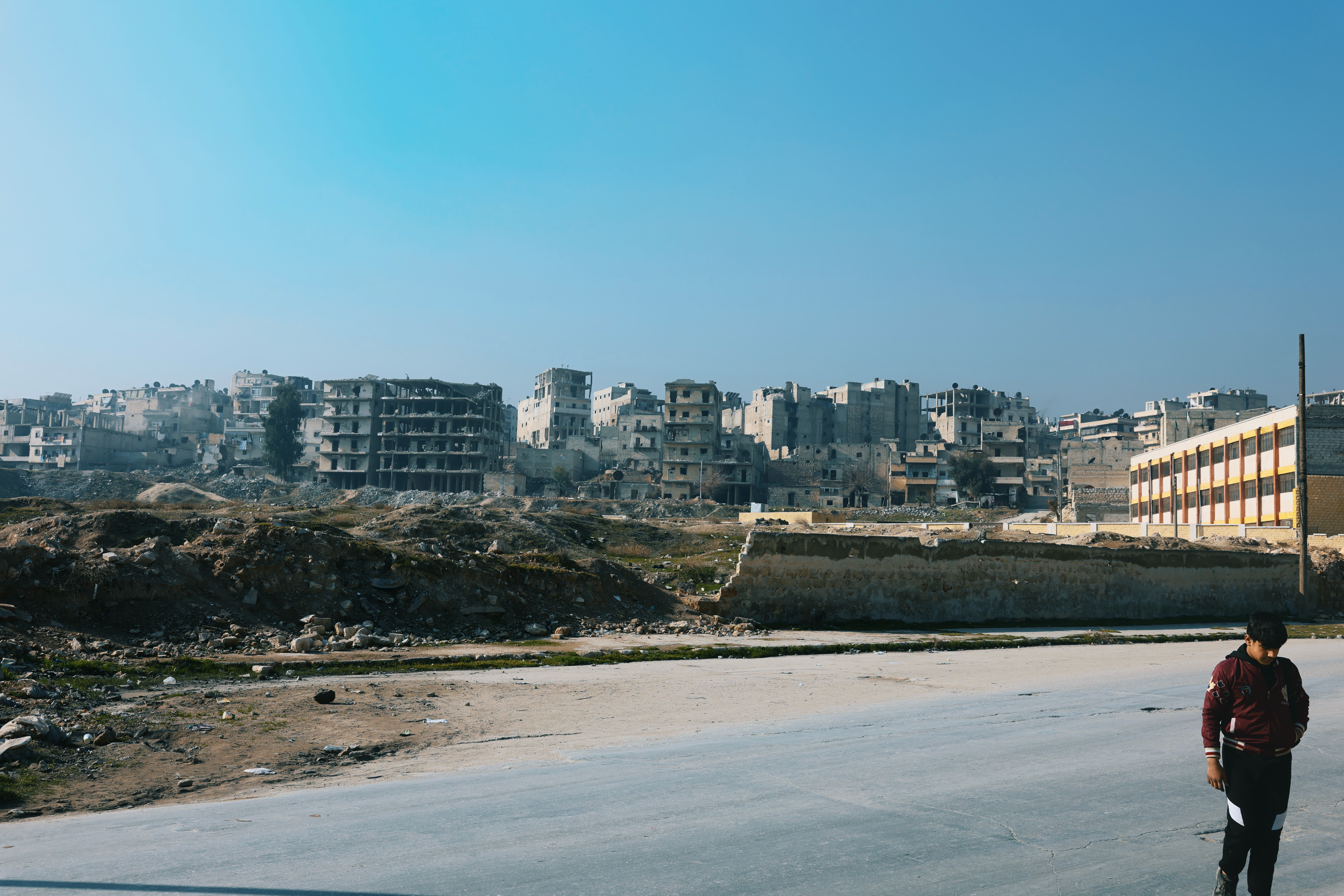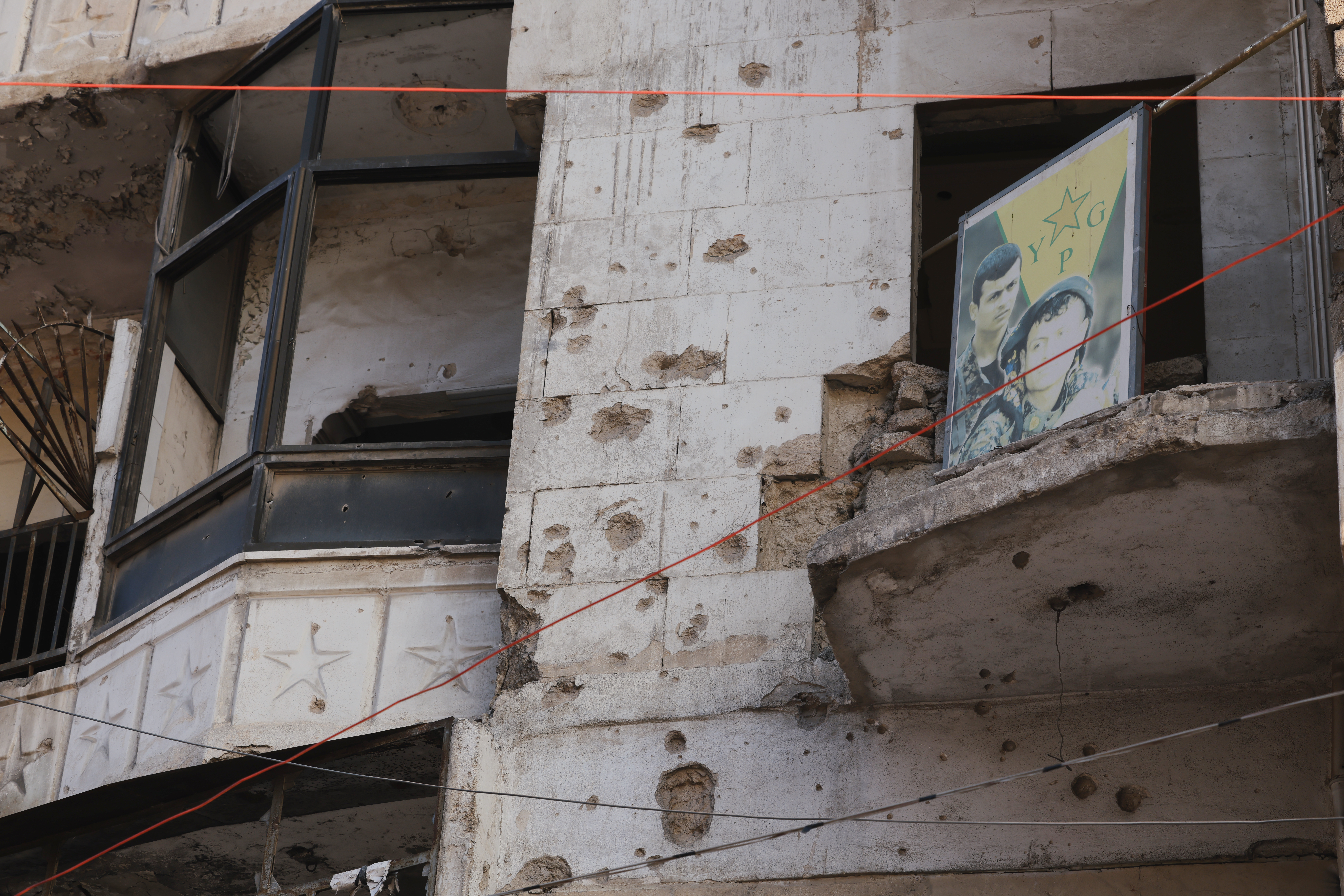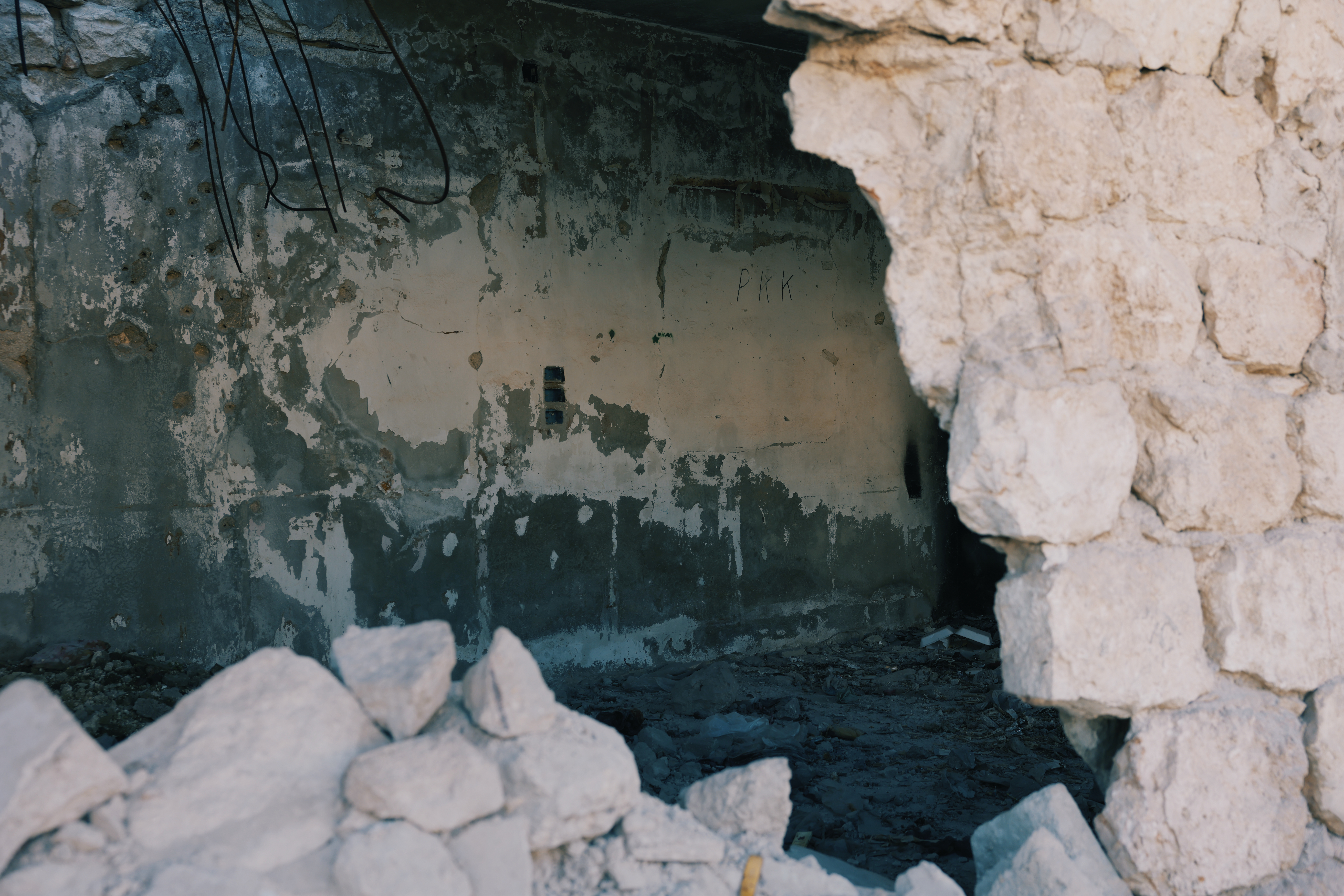 為了讓我們見證戰爭的慘烈,PYD 的軍人將我們帶到 Sheikh Maqsoud 西北角一片密集的建築群。這裡曾是熱鬧的社區,但當我們如今環顧四周,只見建築物被炸得剩下裸露的外牆,四周被煙塵與灰白的痕跡覆蓋。2016 年遭遇空襲後,Sheikh Maqsoud 缺乏重建資金,城鎮至今仍如廢墟。