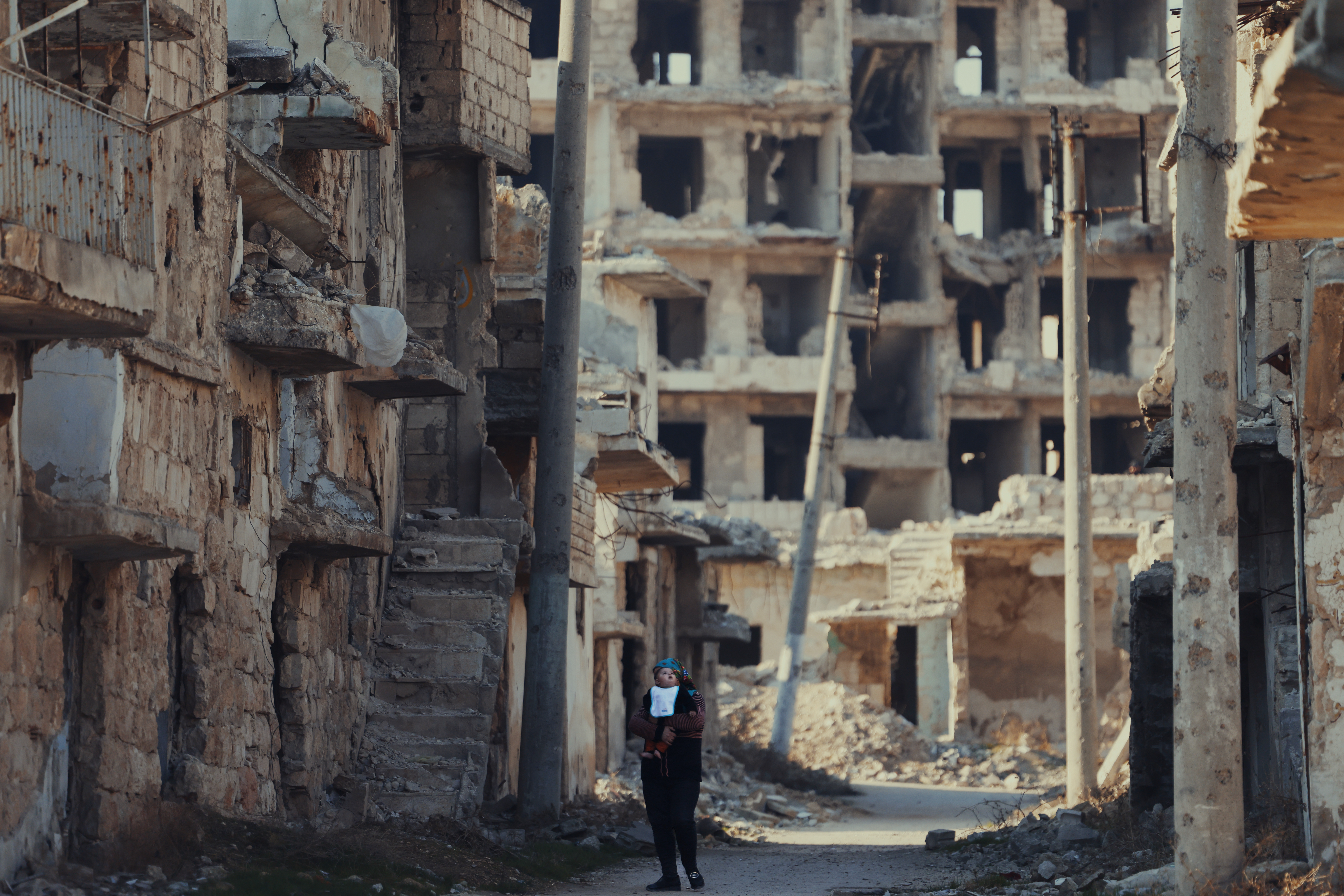 一名庫德婦人抱著強褓中的男嬰,走在殘破不堪的 Sheikh Maqsoud 街道上。