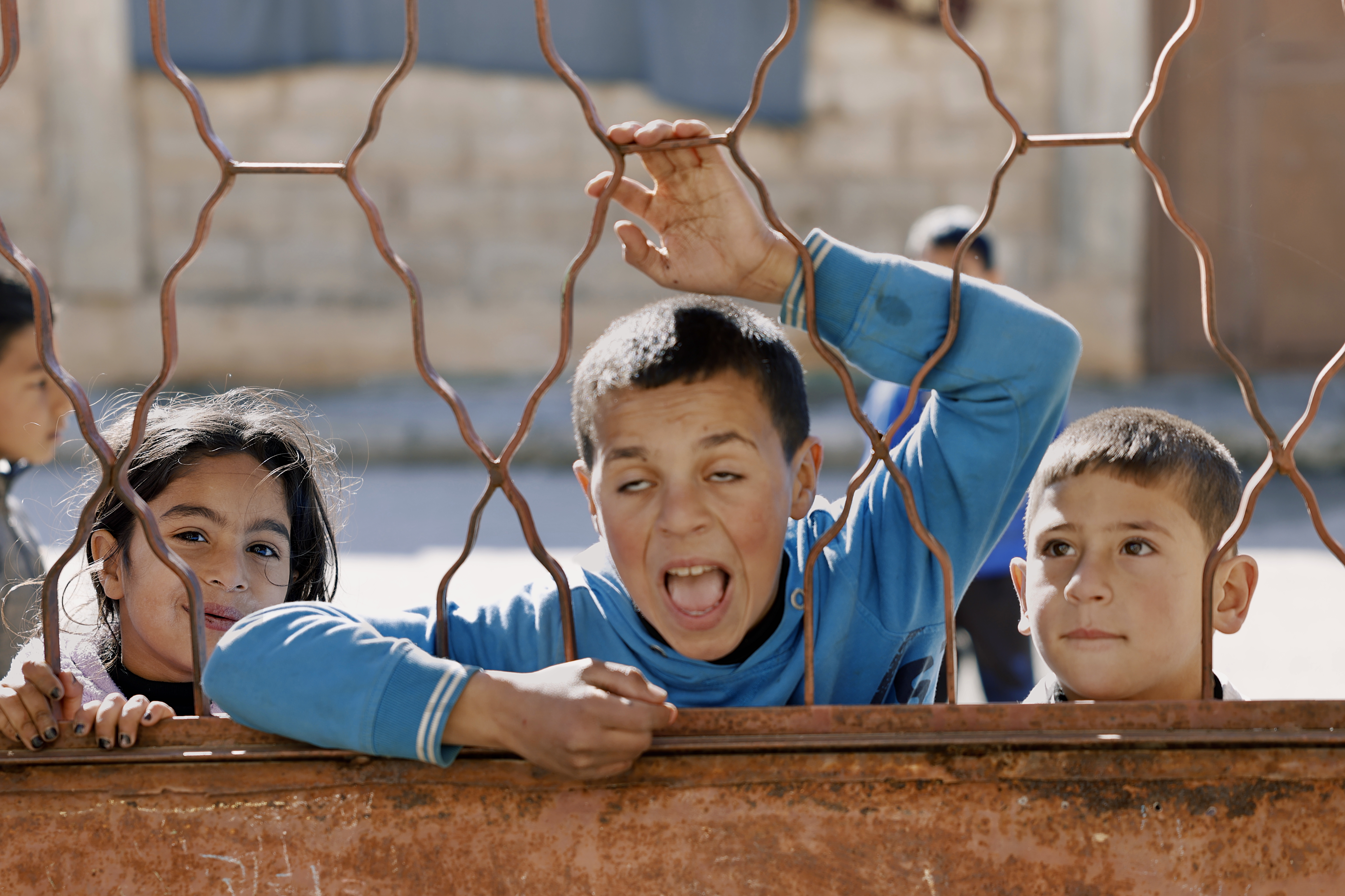 即便被迫逃離家園,天真的孩子們見到陌生的外國記者來訪,仍無憂地在一旁嬉戲,期待自己的照片能登上新聞版面。
