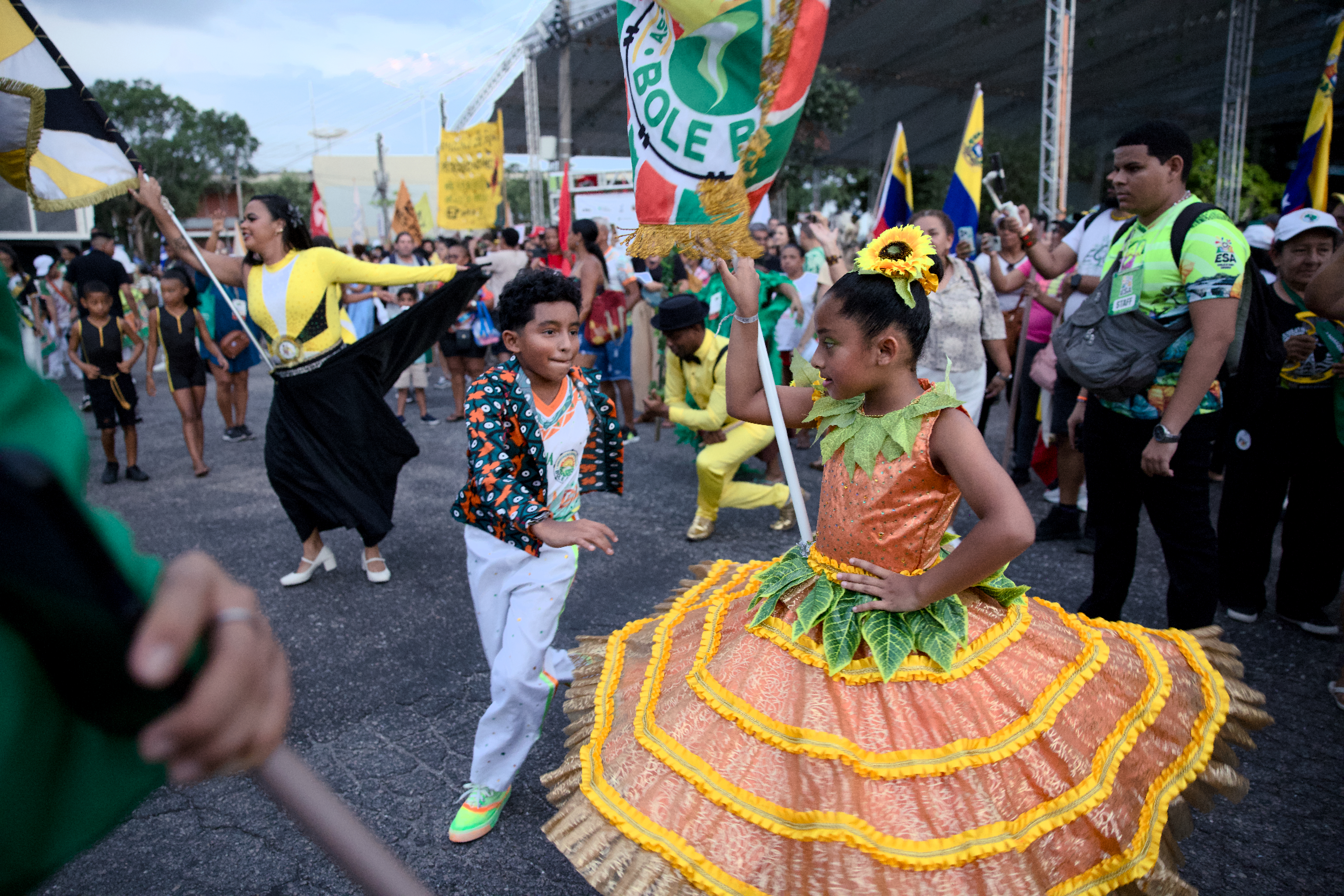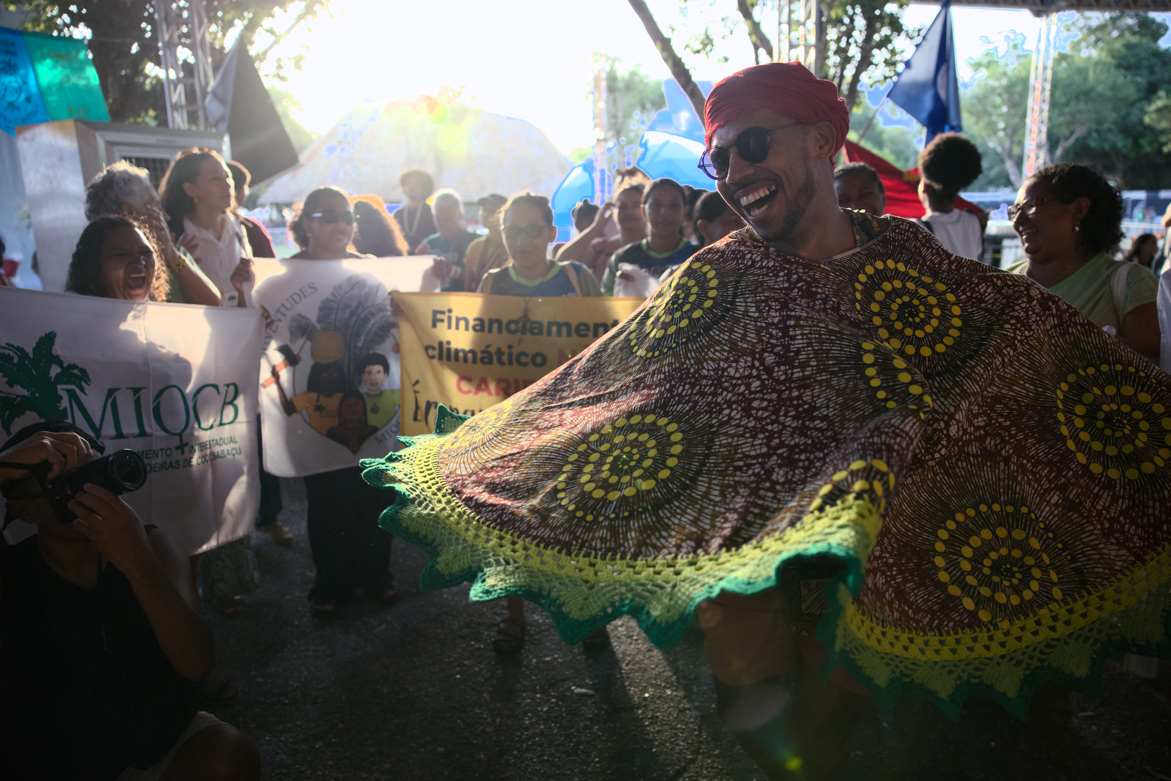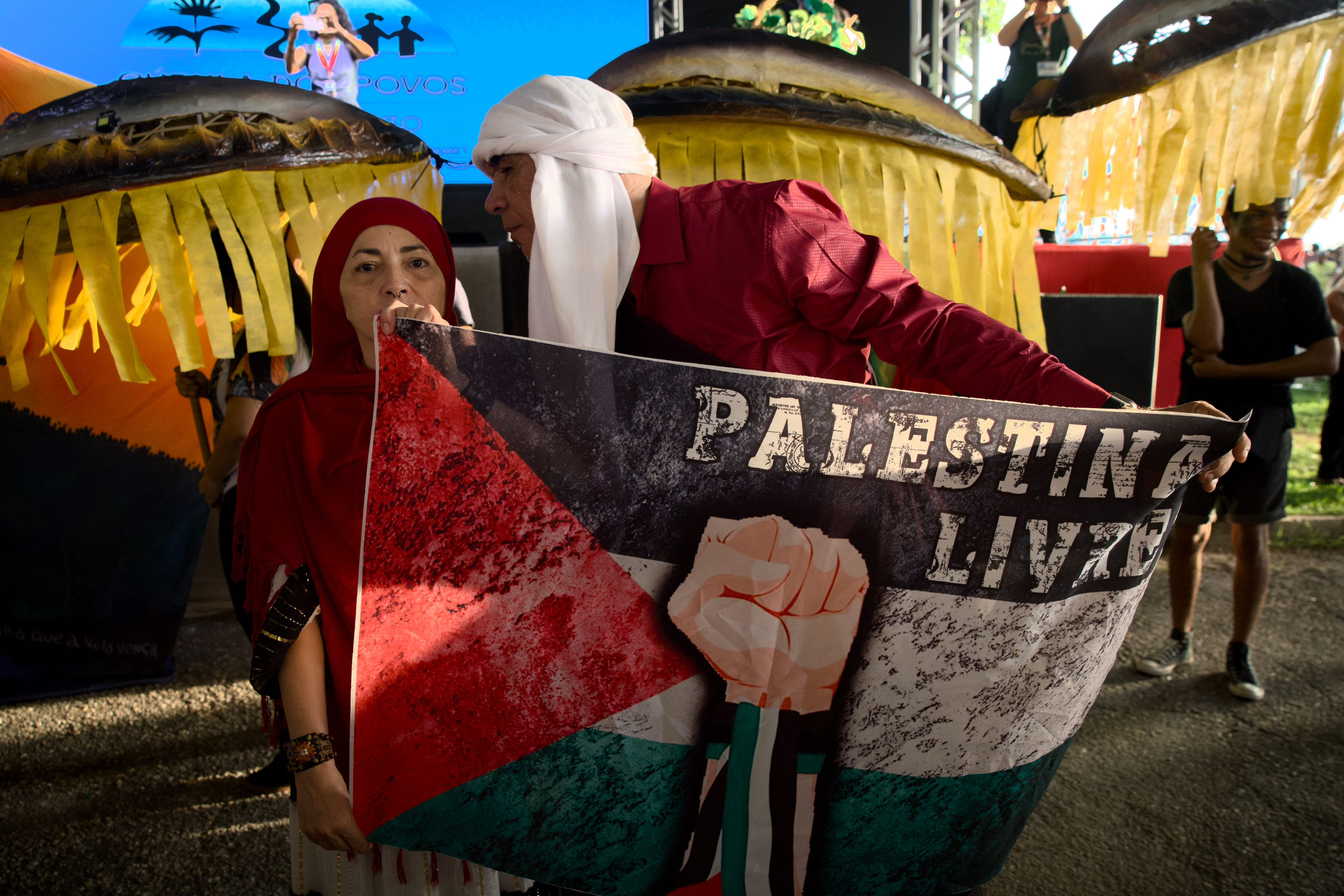 不同團體的旗幟隨著音樂節奏飄揚,代表巴勒斯坦的旗幟在被夕陽暈染成金黃色的亞馬遜河前顯得耀眼。這裡有汗水、有歌聲,來自各地的人們,聚集於此凝聚共同信念。