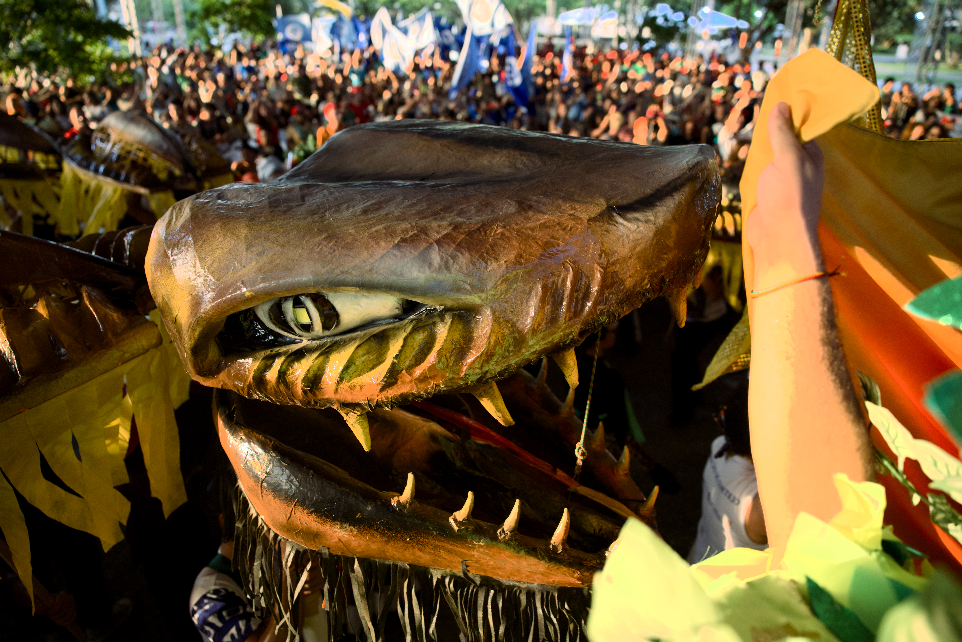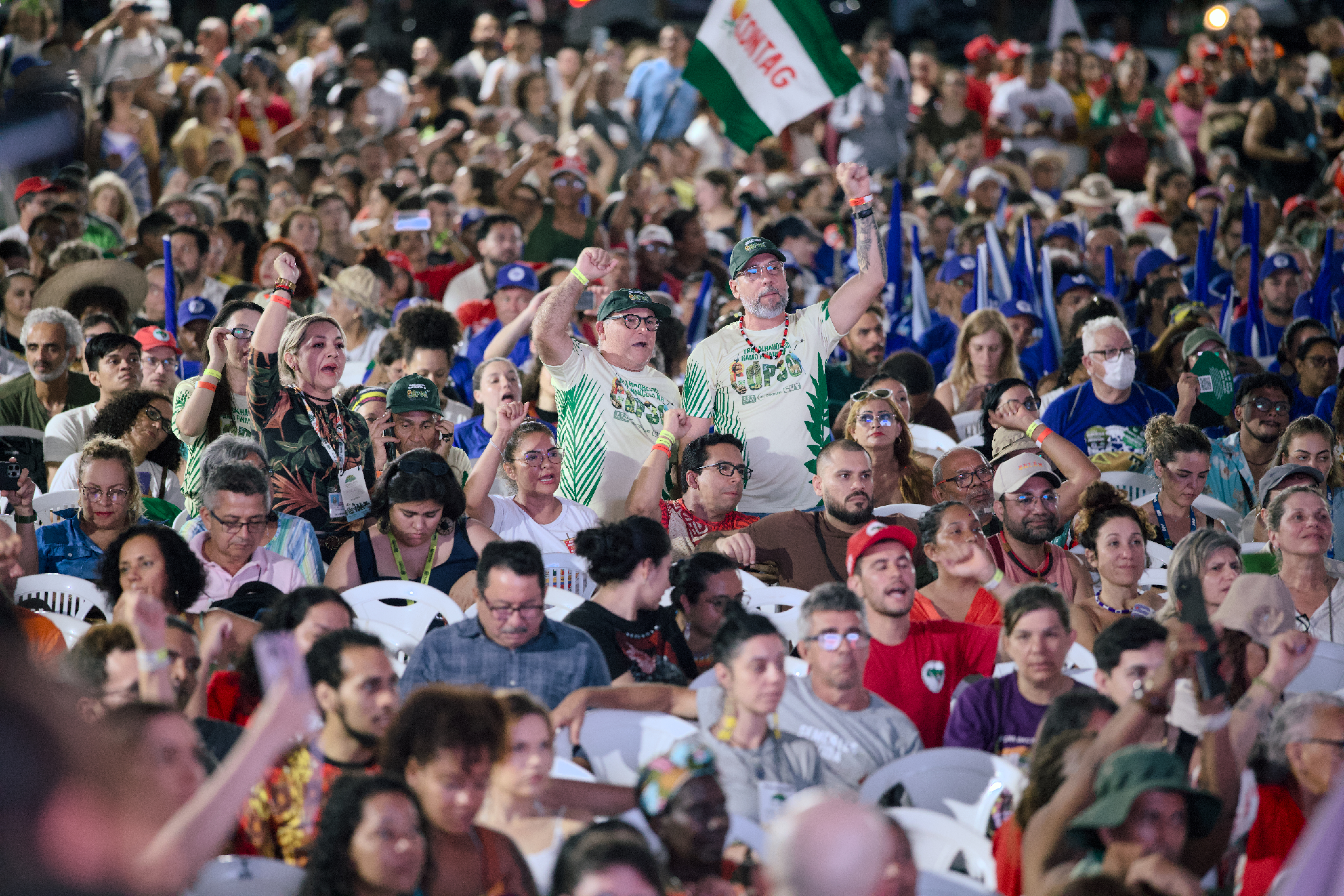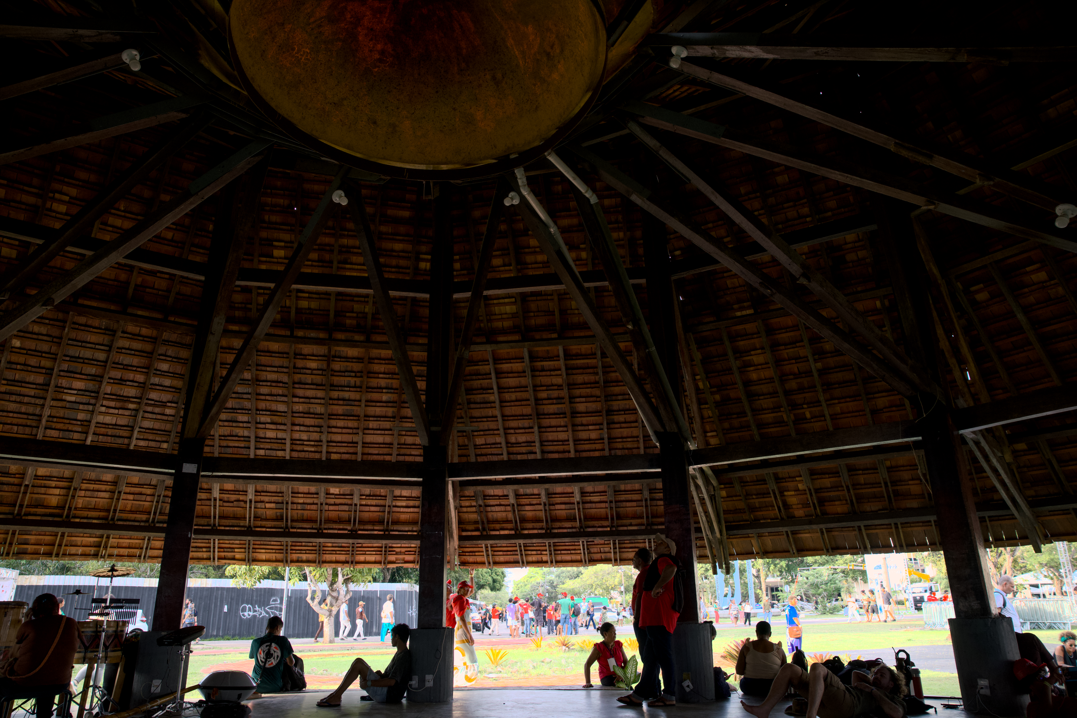 不同團體的旗幟隨著音樂節奏飄揚,代表巴勒斯坦的旗幟在被夕陽暈染成金黃色的亞馬遜河前顯得耀眼。這裡有汗水、有歌聲,來自各地的人們,聚集於此凝聚共同信念。