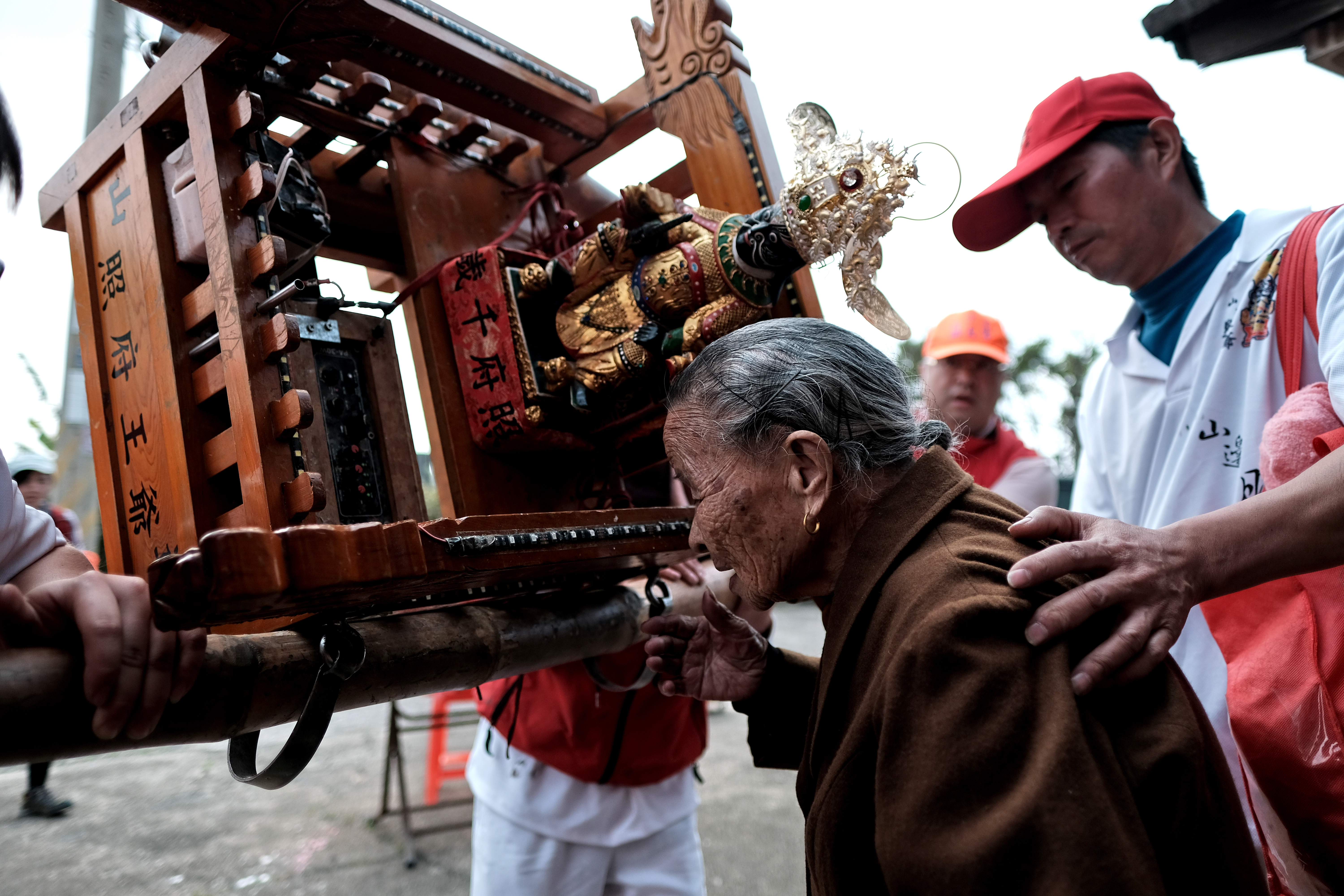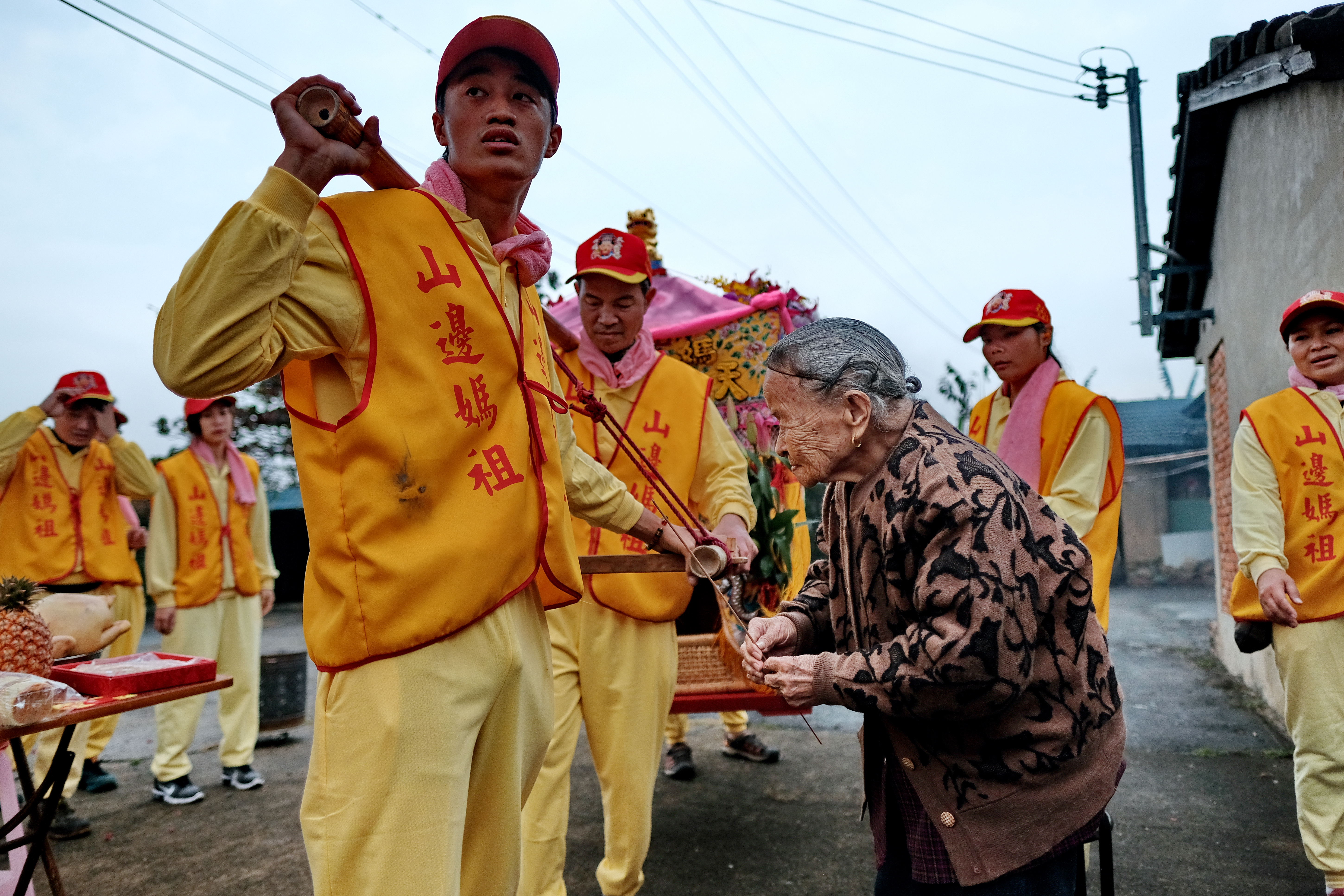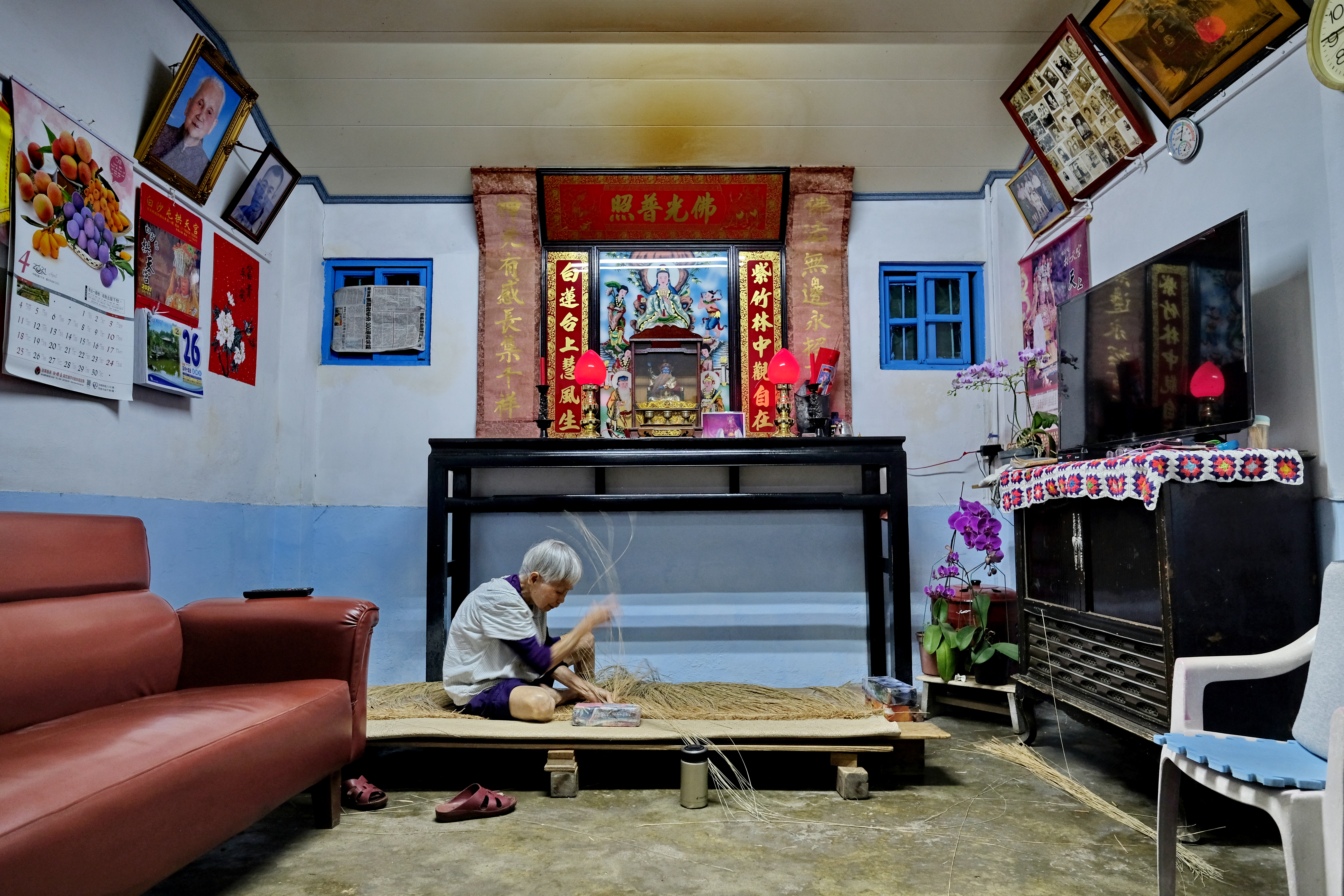 白沙屯民宅內皆有媽祖聖像,不論海報或月曆,信仰就在家門裡。畫面裡的伯伯可能因行動不便或其他原因無法跟著去進香,但是他的信仰不會因此而減弱。平常人在家會穿得舒適、輕鬆,但這時刻拍到的很多人則是戴著橘色帽子、穿好衣服、背著背包,準備好要跟著進香。